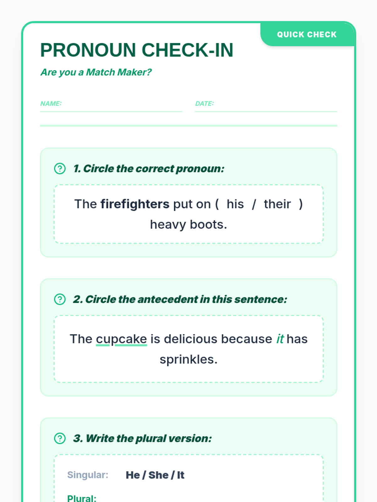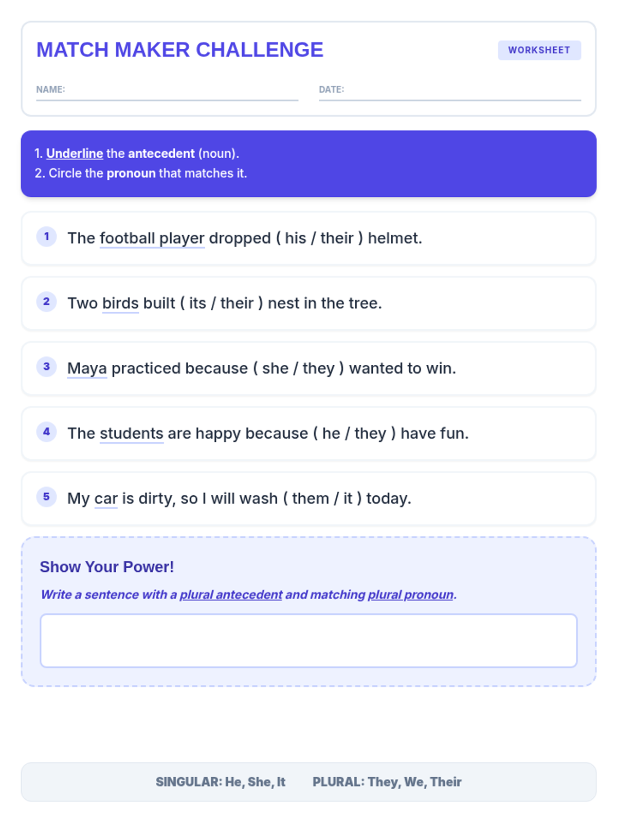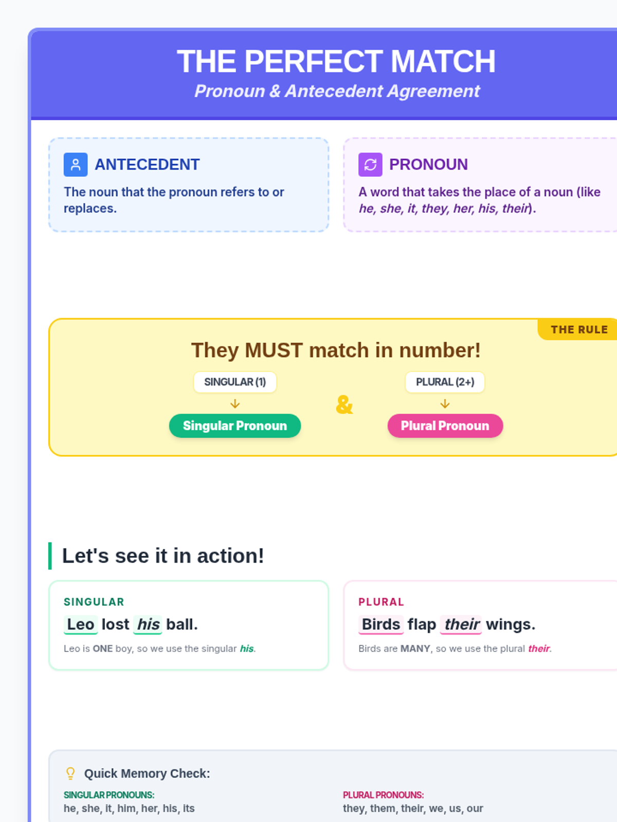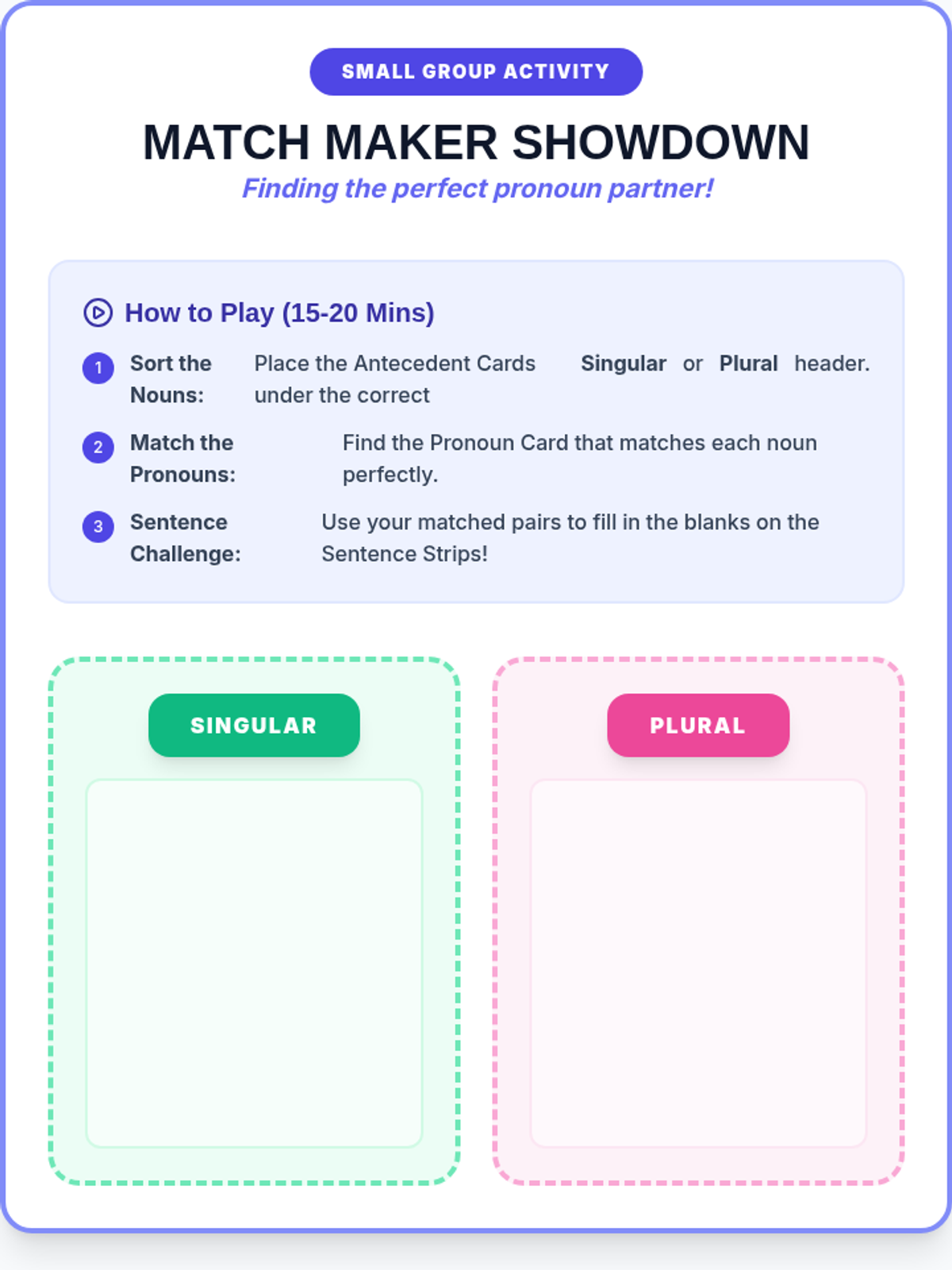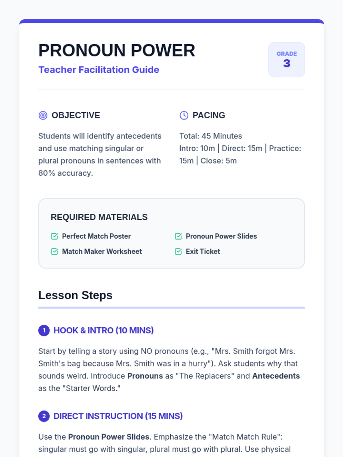 A lesson focused on teaching 3rd graders how to correctly match pronouns with their antecedents, focusing specifically on singular and plural agreement.