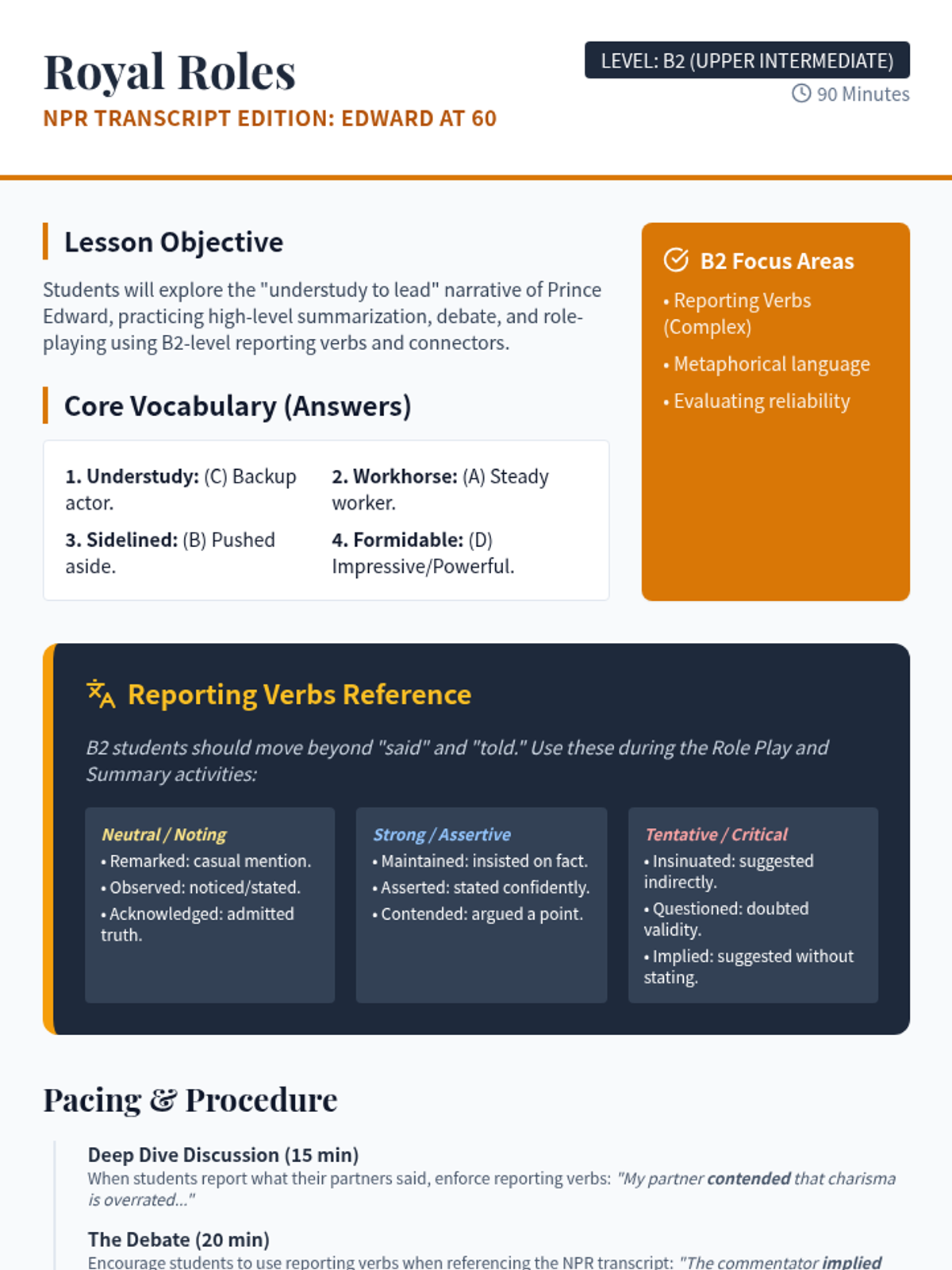 A 90-minute B2-level English lesson focused on the life and public role of Prince Edward, Duke of Edinburgh, featuring listening comprehension and intensive speaking activities.