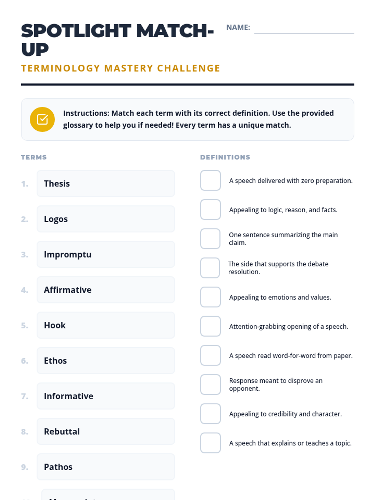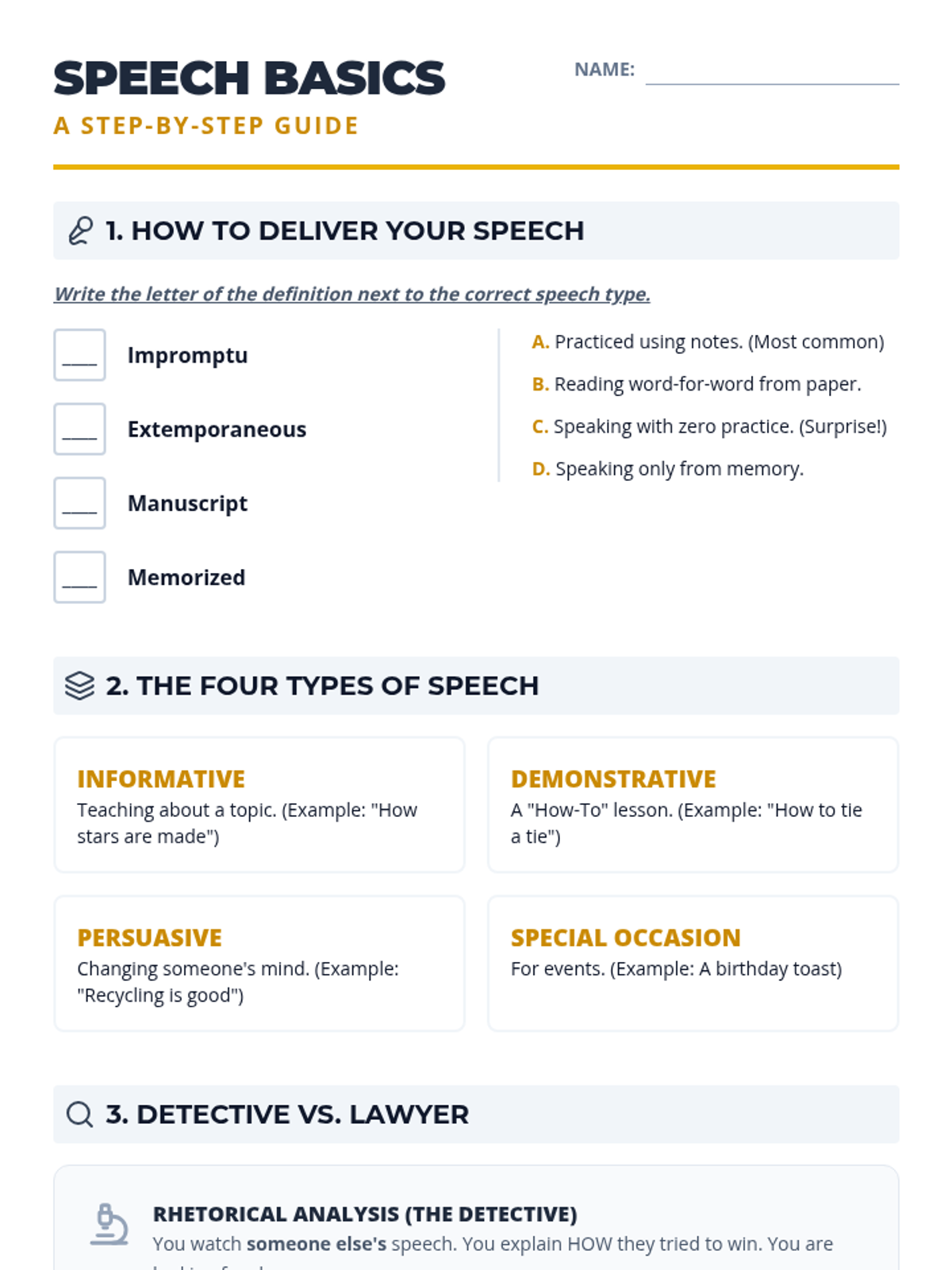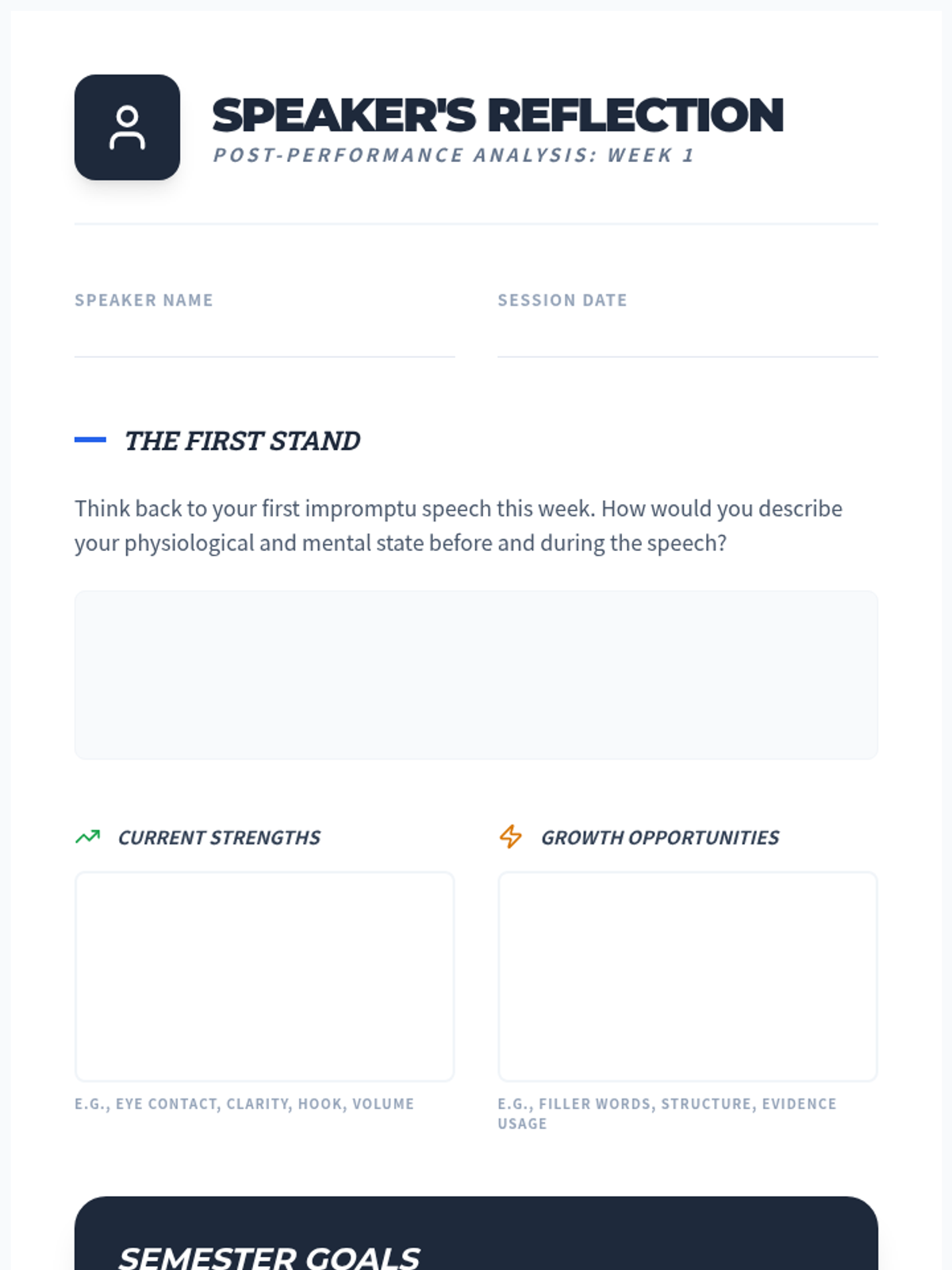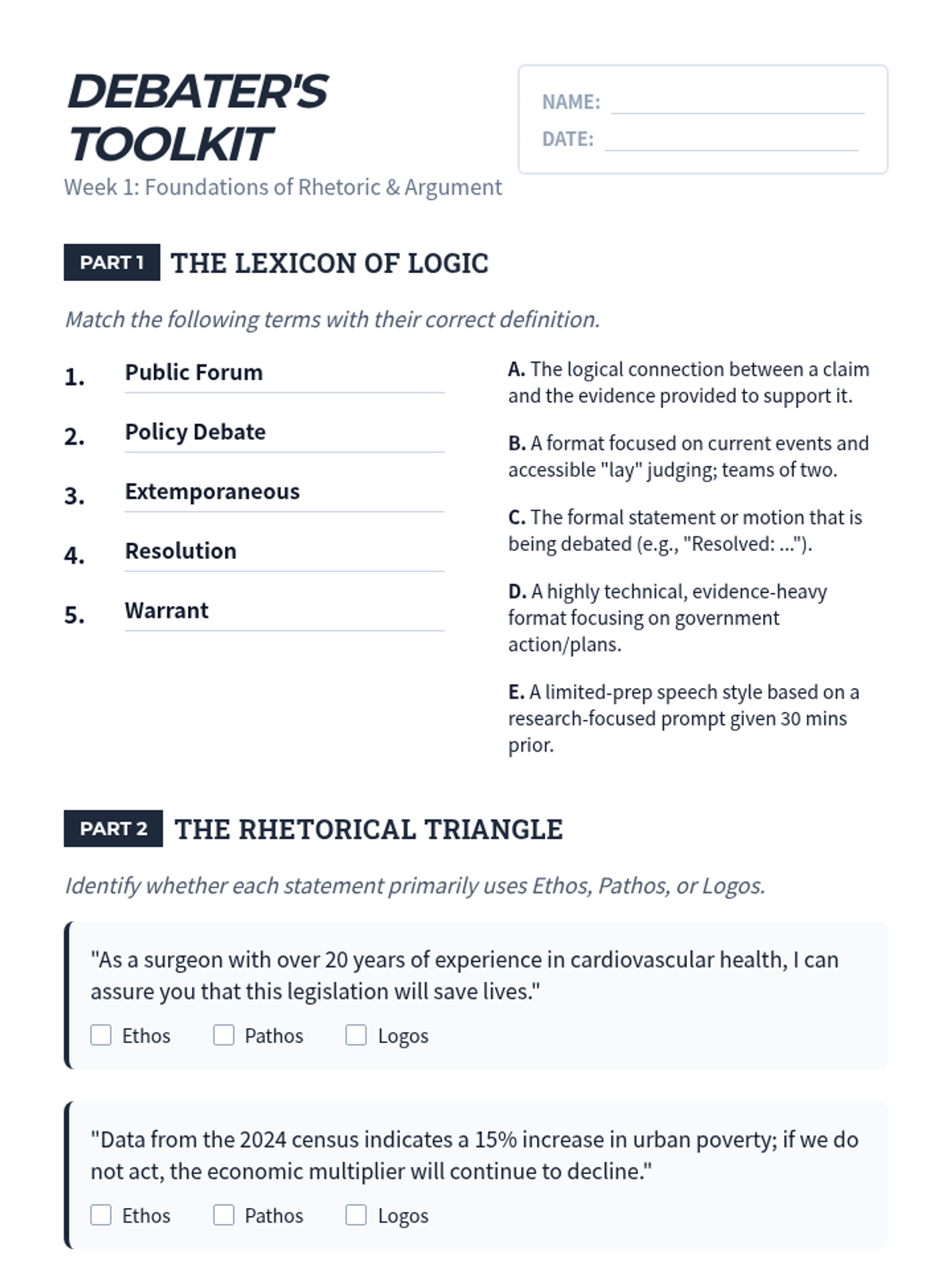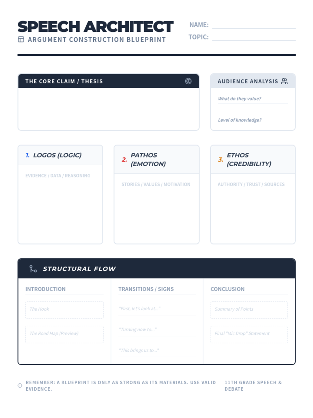 An introductory week for 11th grade Speech and Debate focusing on the fundamentals of persuasion, argument structure, and public speaking formats. Students will master the rhetorical triangle, identify logical fallacies, and practice impromptu delivery.