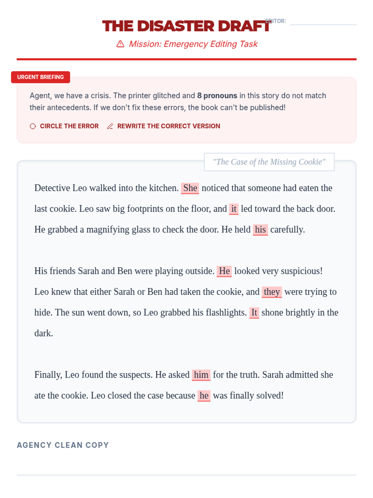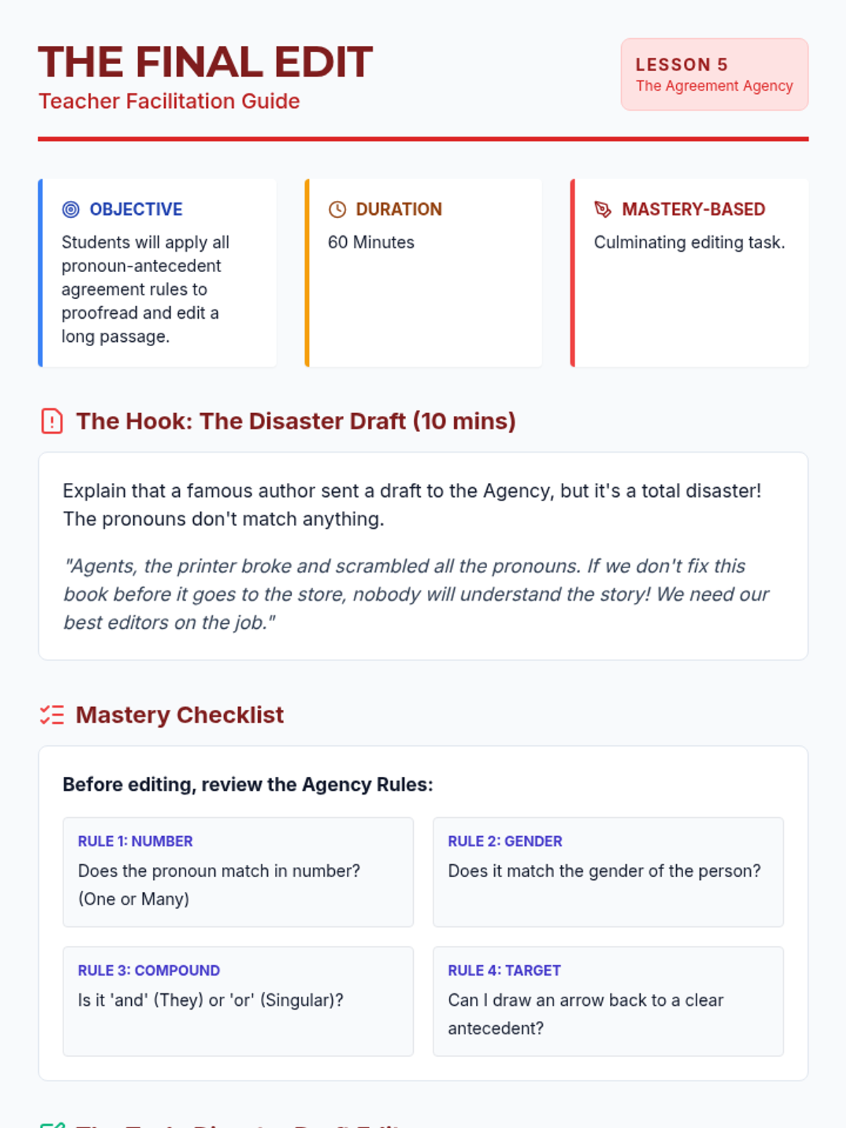 A culminating lesson where students act as editors to find and fix agreement errors in a 'disaster draft' passage.