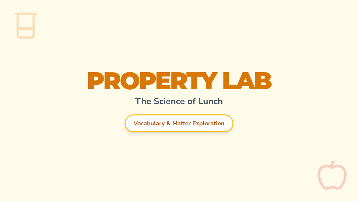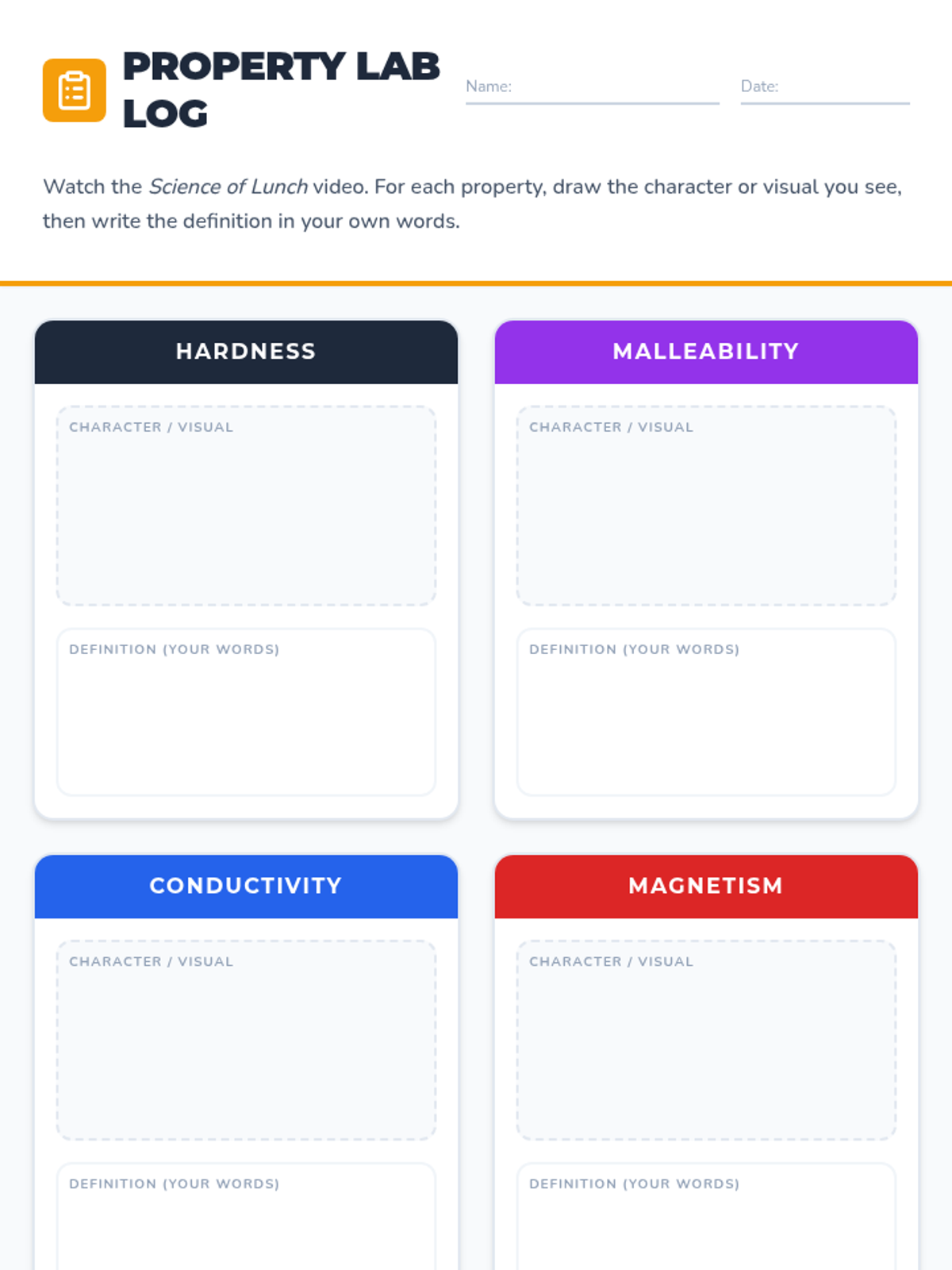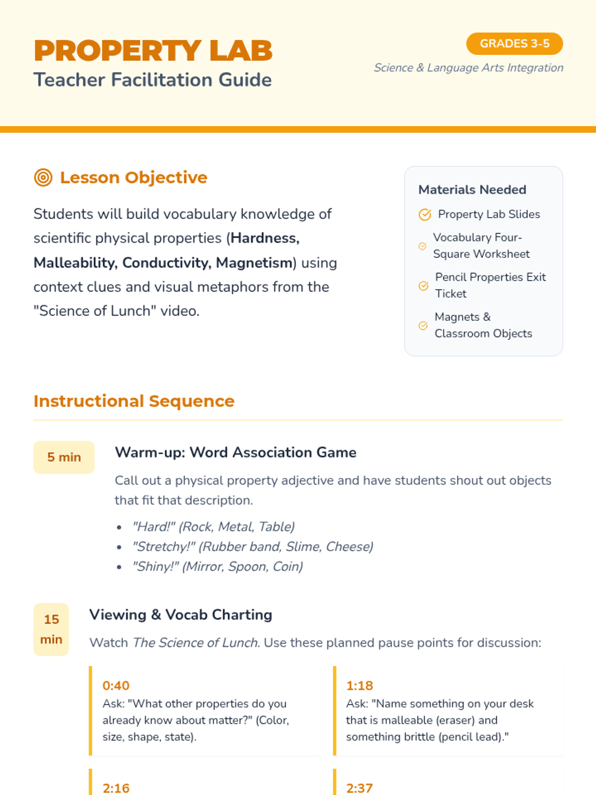 A Language Arts integrated science lesson where students explore physical properties of matter (Hardness, Malleability, Conductivity, and Magnetism) using visual metaphors and real-world lunch items.