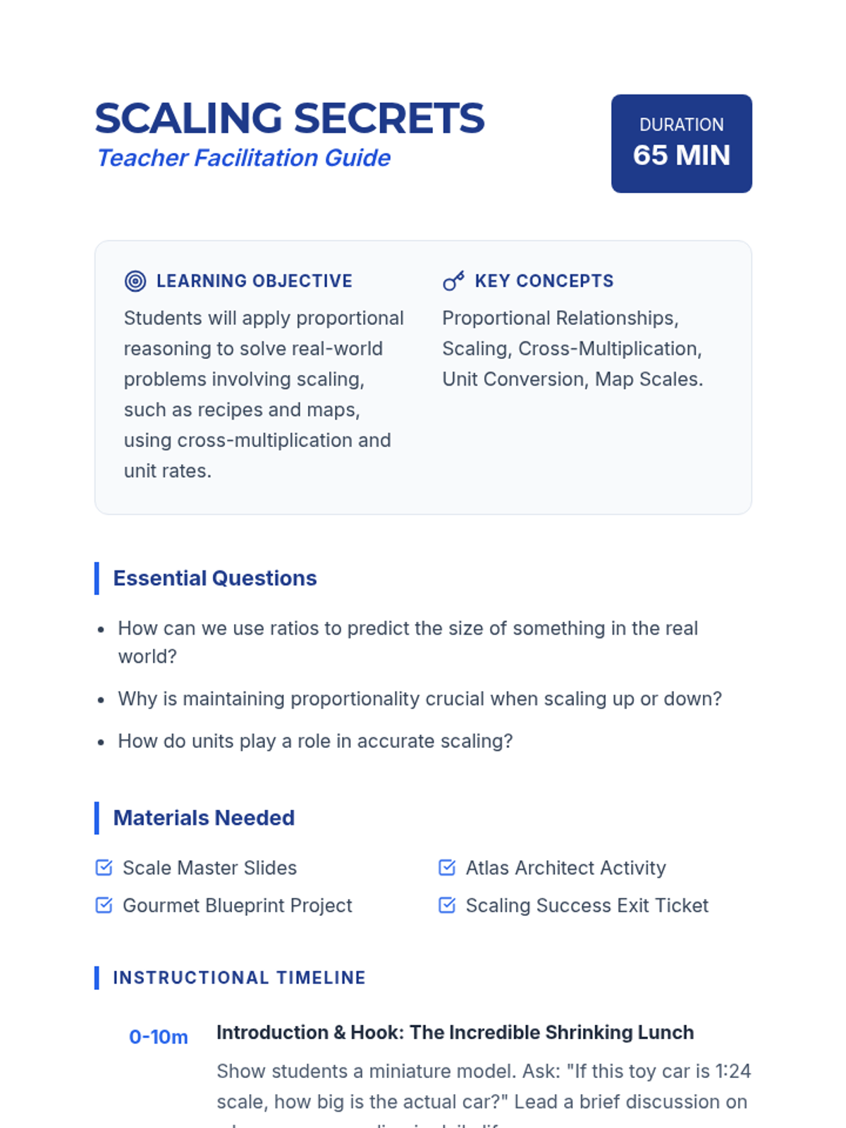 A comprehensive 65-minute lesson for 9th graders on proportional reasoning and scaling. Students apply cross-multiplication and unit rates to real-world scenarios like resizing recipes and navigating maps.