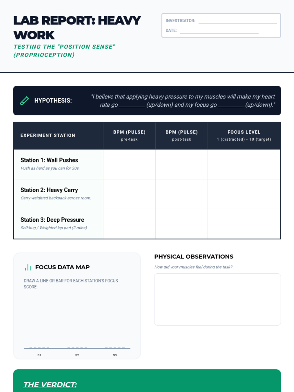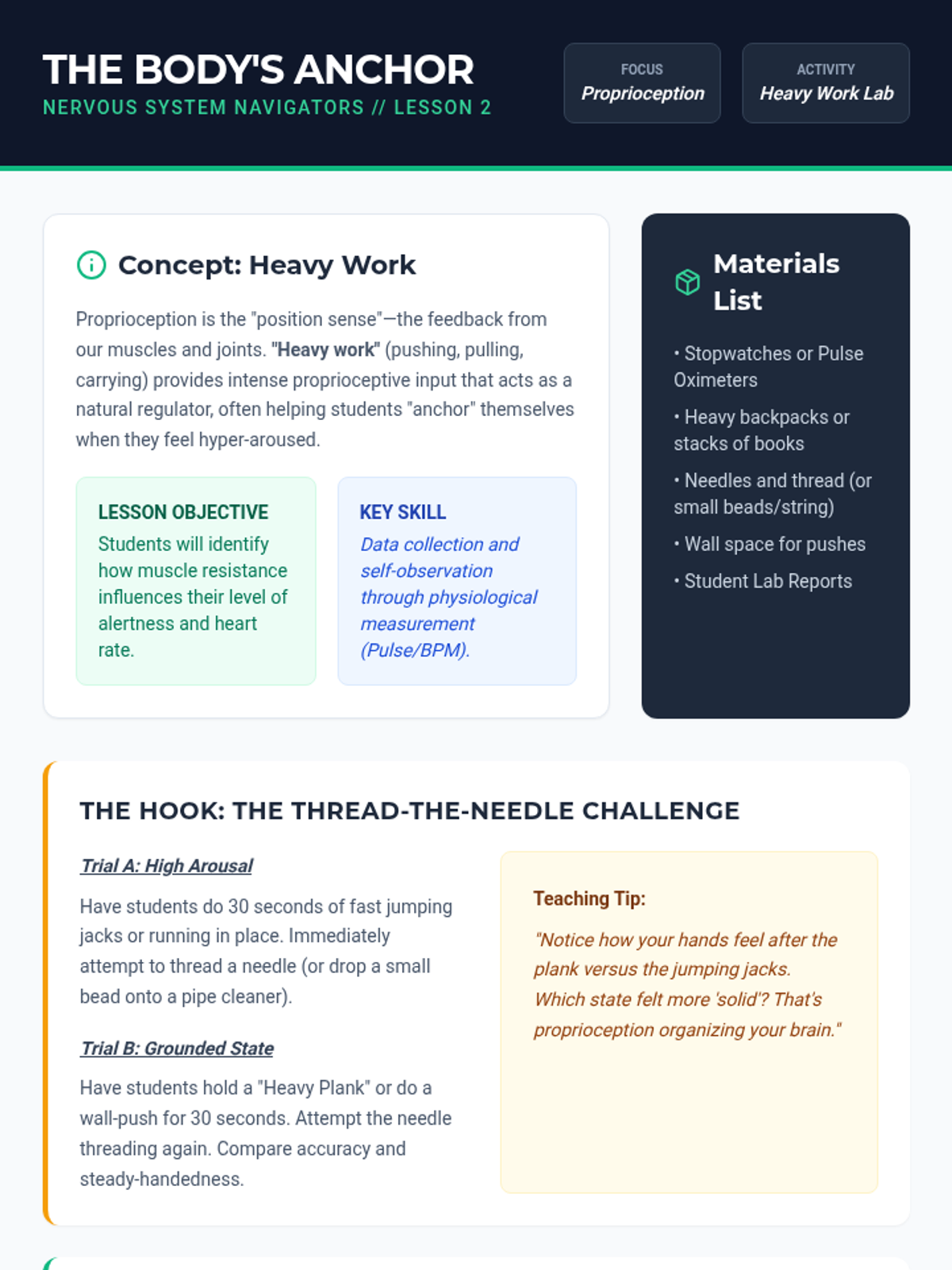 Focus on proprioception and 'heavy work'. Students investigate how deep pressure and muscle resistance act as a grounding force for the nervous system, measuring the impact on their own focus and heart rate.