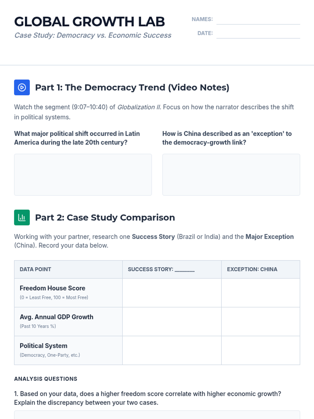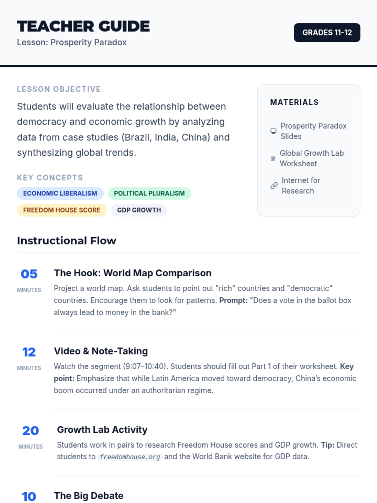 A high school civics/economics lesson exploring the complex relationship between democratic governance and economic development, using the 'Prosperity Paradox' as a central theme. Students analyze case studies of India, Brazil, and China to evaluate if political freedom is a prerequisite for economic success.