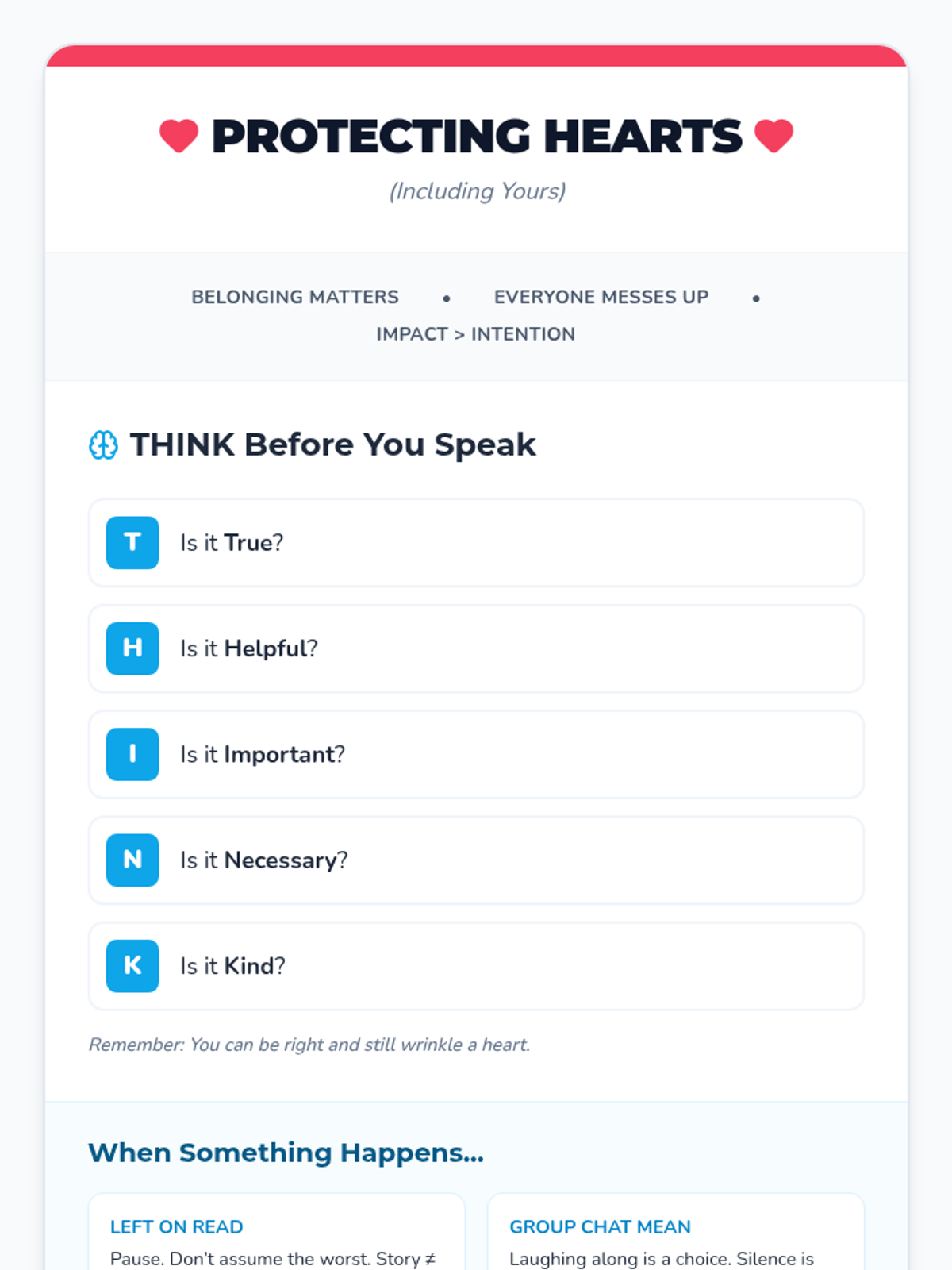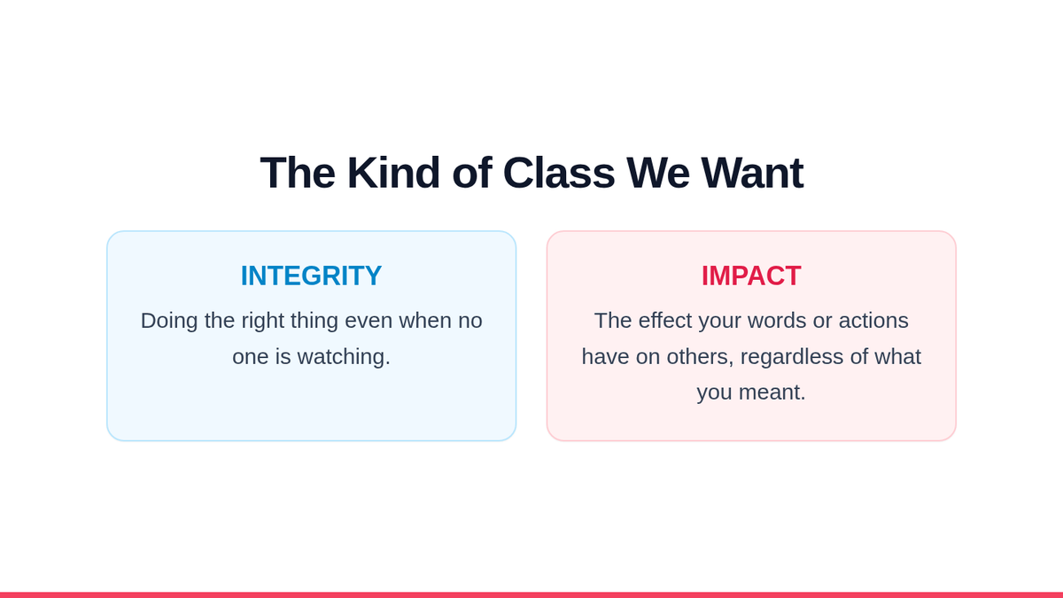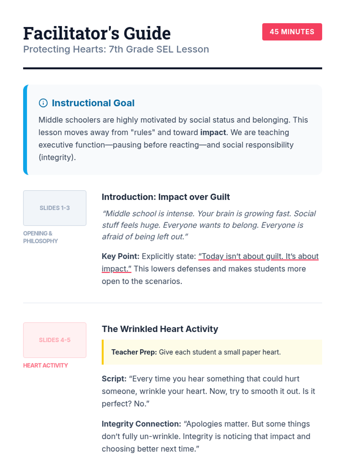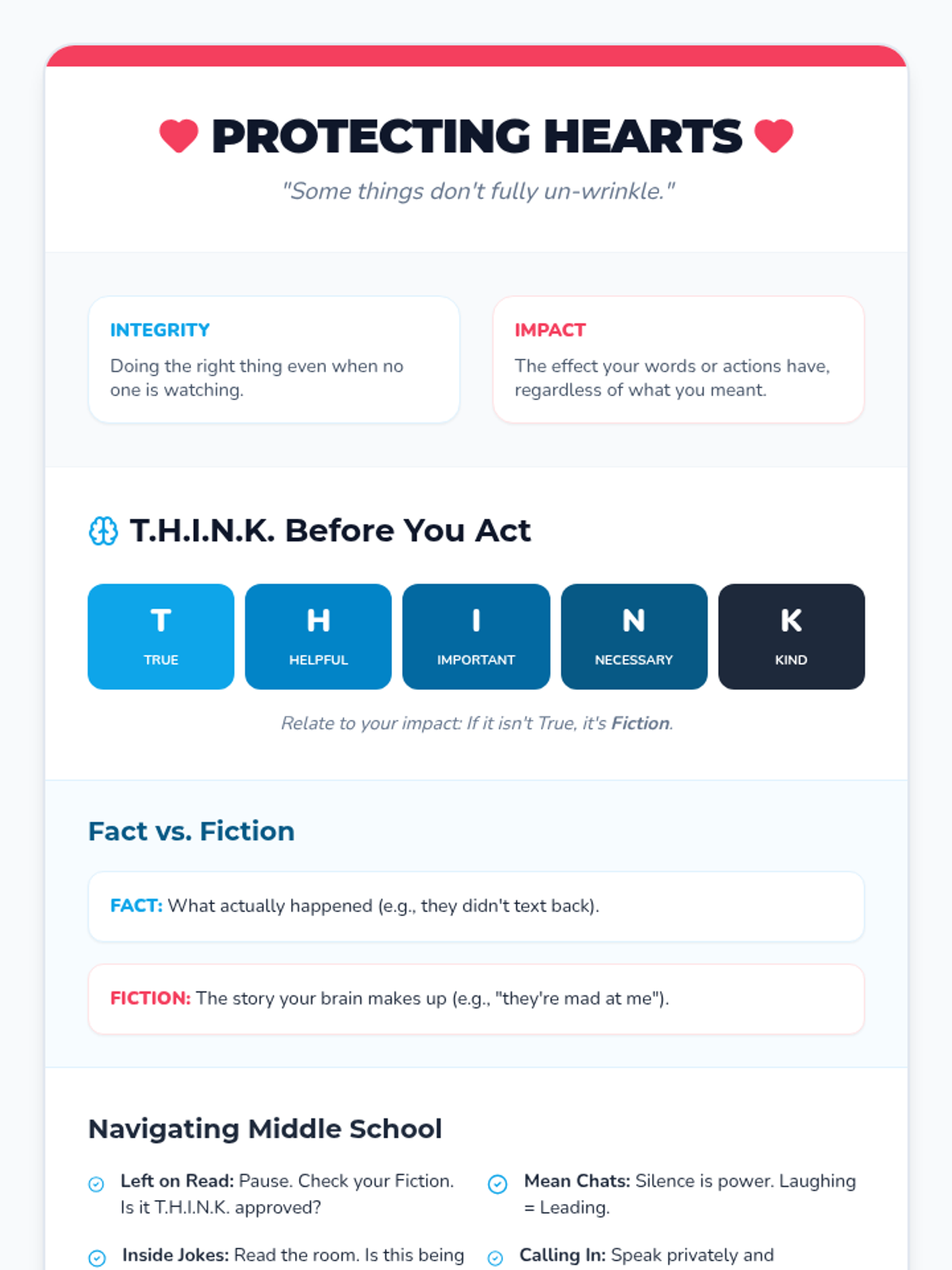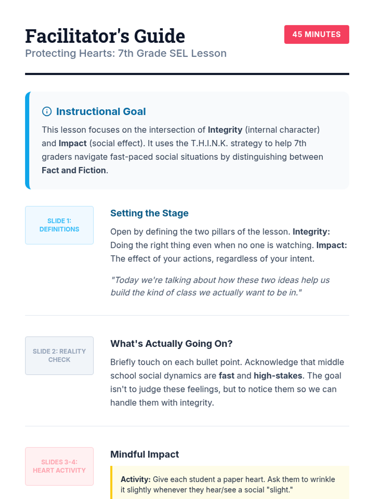 A 45-minute social-emotional learning lesson for 7th graders focused on social impact, integrity, and the 'THINK' strategy to navigate middle school social dynamics.