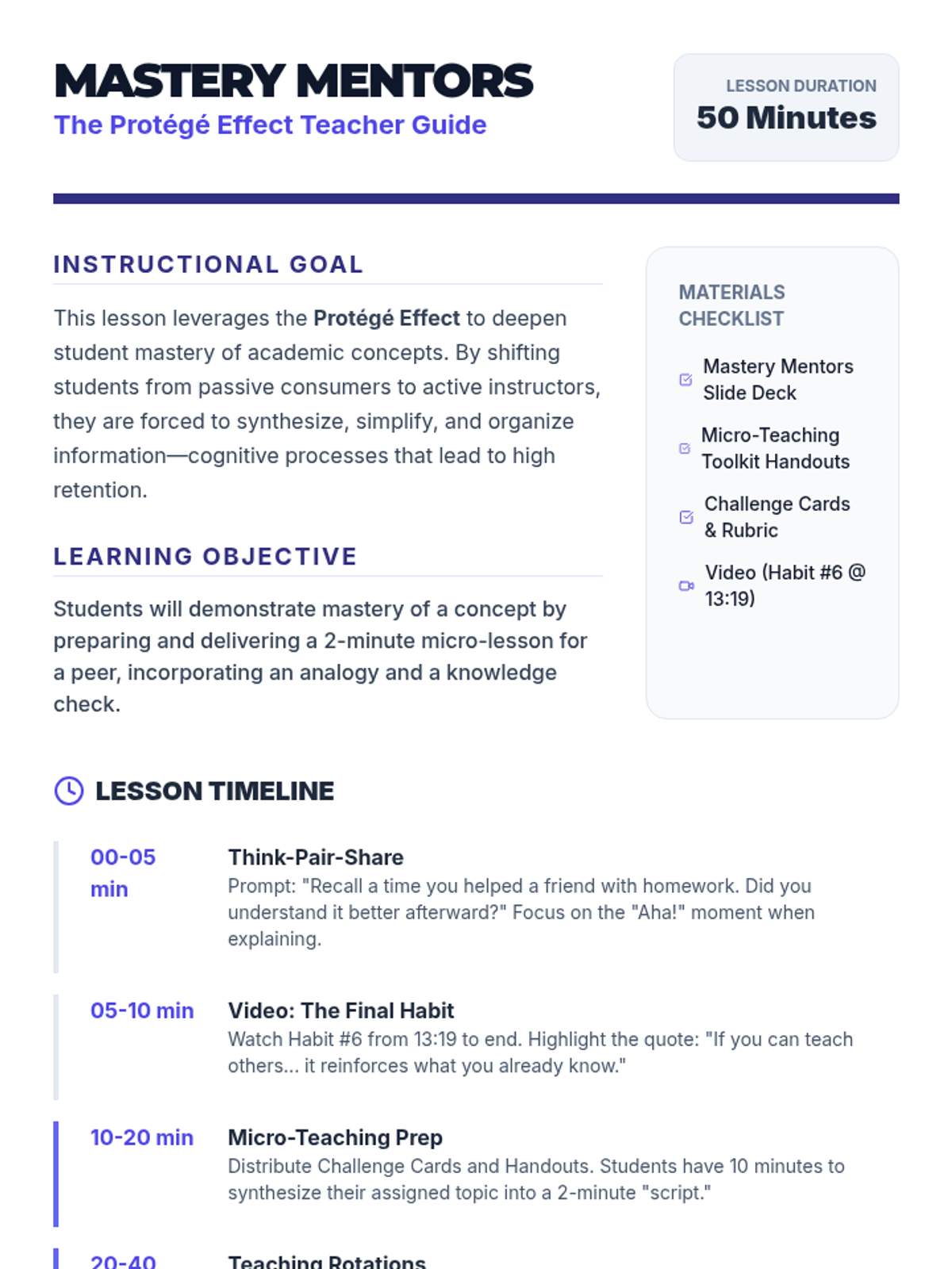 Students explore the 'Prot\u00e9g\u00e9 Effect,' discovering how teaching others enhances their own mastery. Through a micro-teaching activity and peer feedback, they synthesize previously learned concepts into concise, clear explanations.