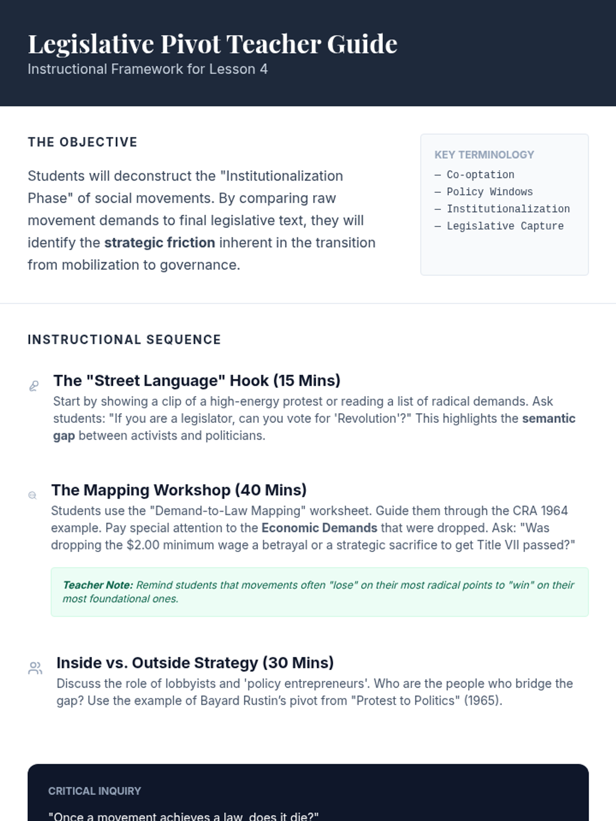 An introductory lesson exploring the Civil Rights Movement through the powerful words of its leaders. Students engage in a gallery walk to analyze quotes, reflect on leadership styles, and connect historical messages to modern contexts.