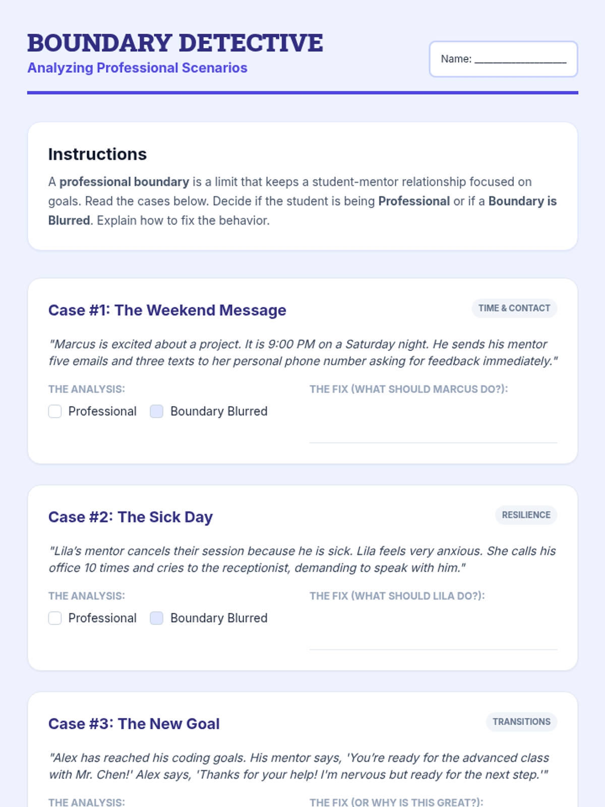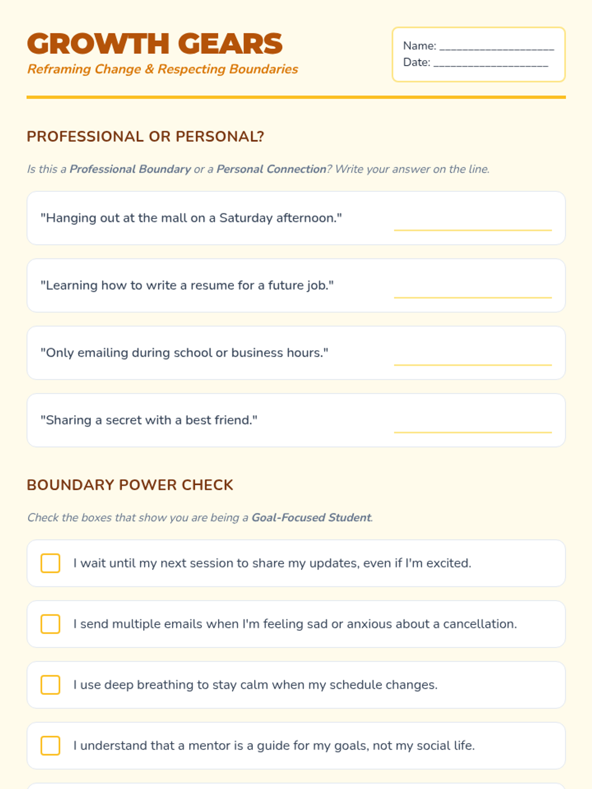 A counseling lesson designed for young adults to develop healthy decision-making skills, understand personal boundaries, and practice assertive communication in friendships and romantic relationships.