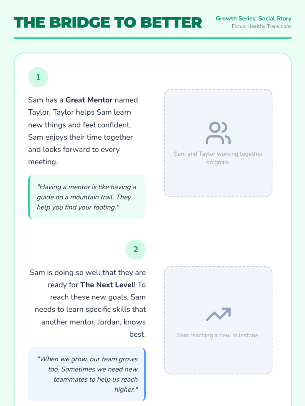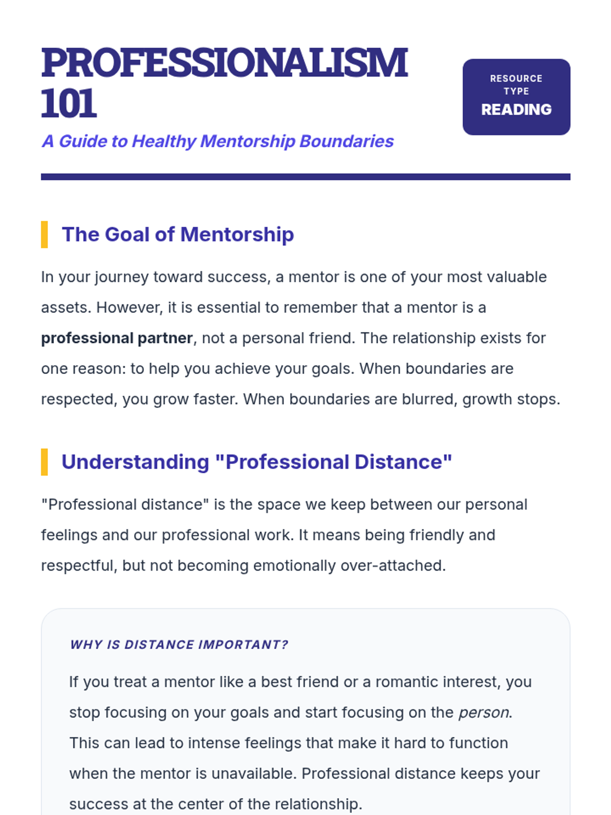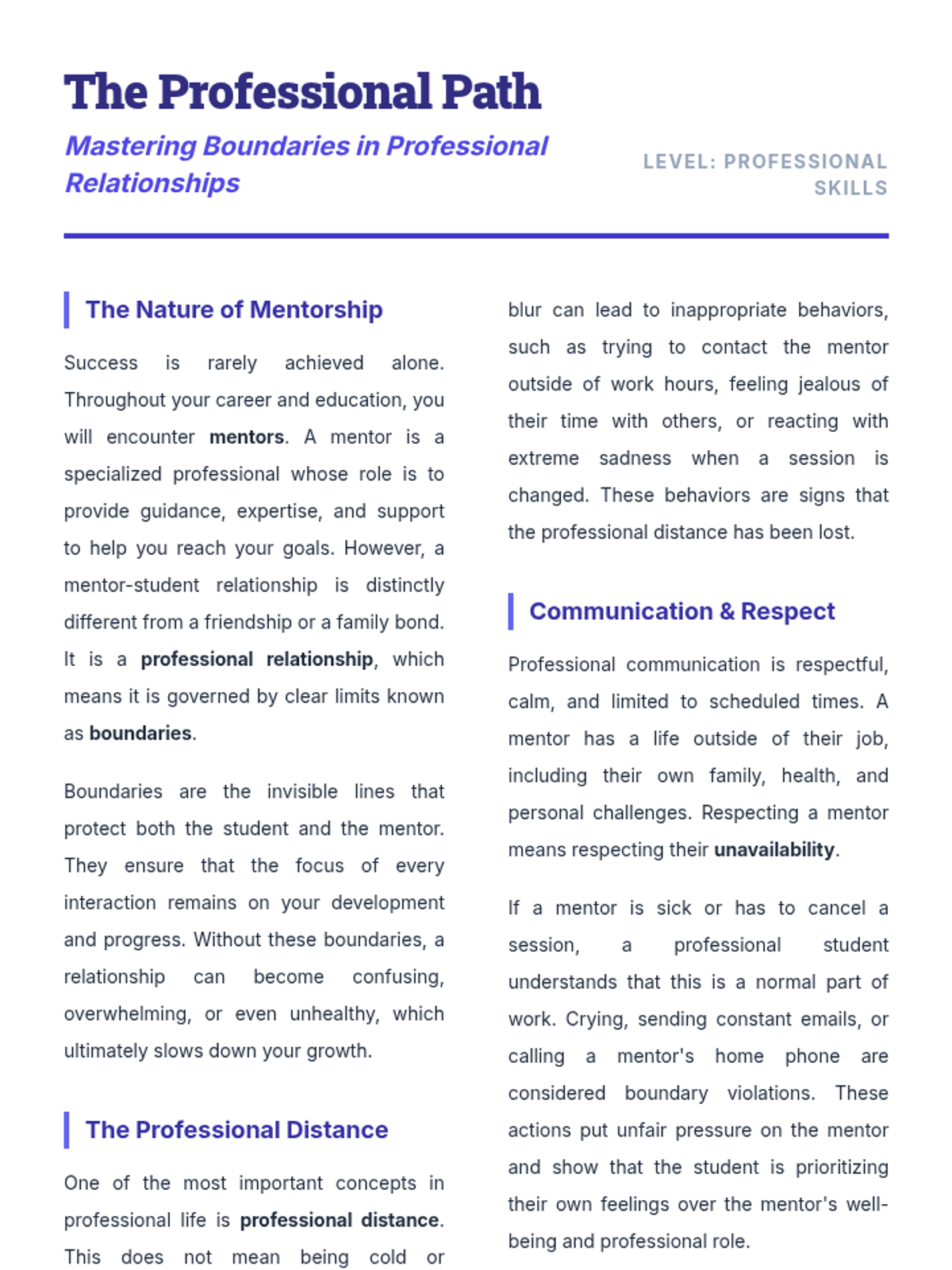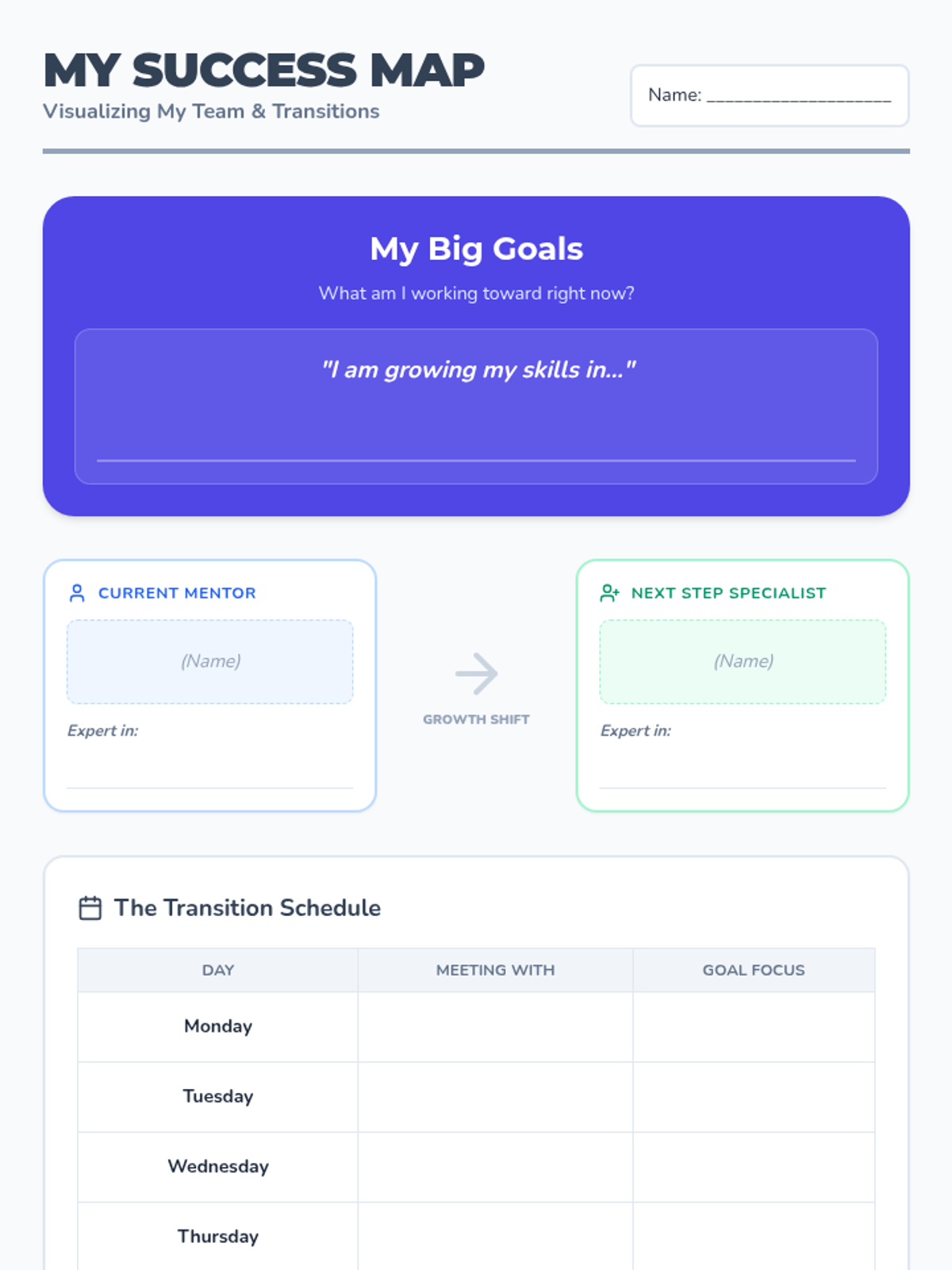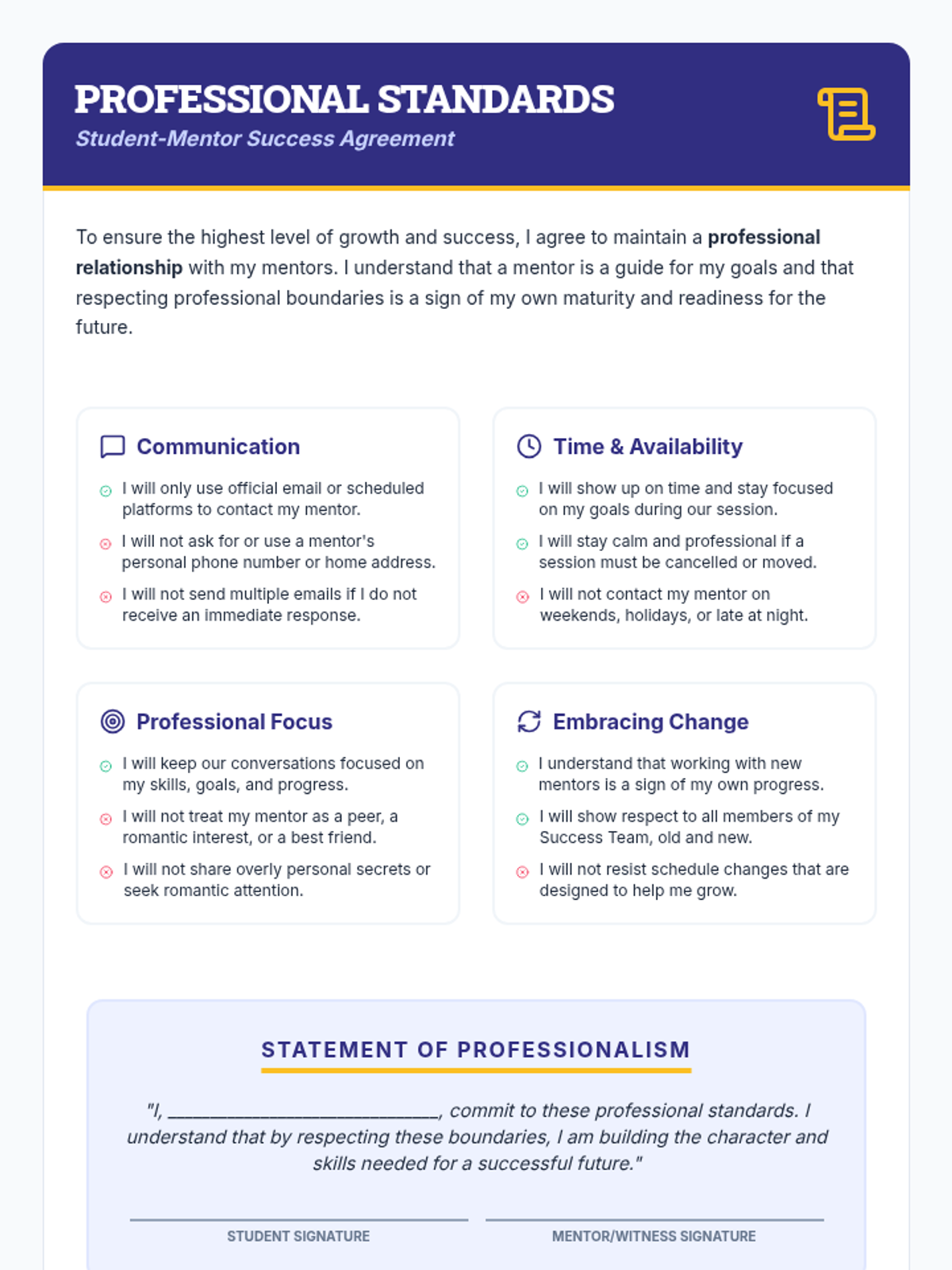 This lesson focuses on navigating transitions within professional relationships, understanding boundaries, and viewing change as a necessary step for personal growth and goal achievement. It provides students with coping strategies for unexpected changes and helps them identify the roles of different mentors in their 'Success Team'.