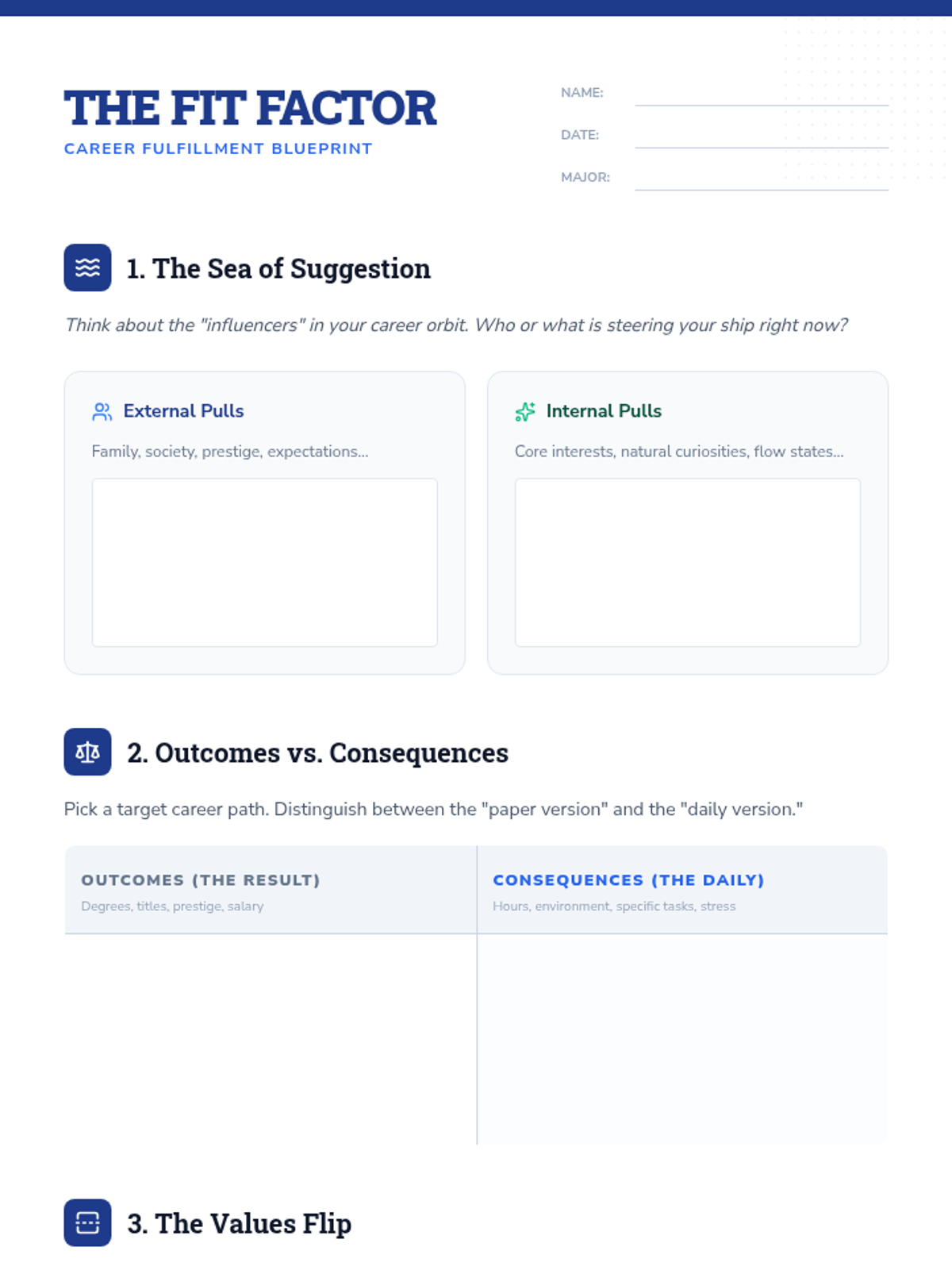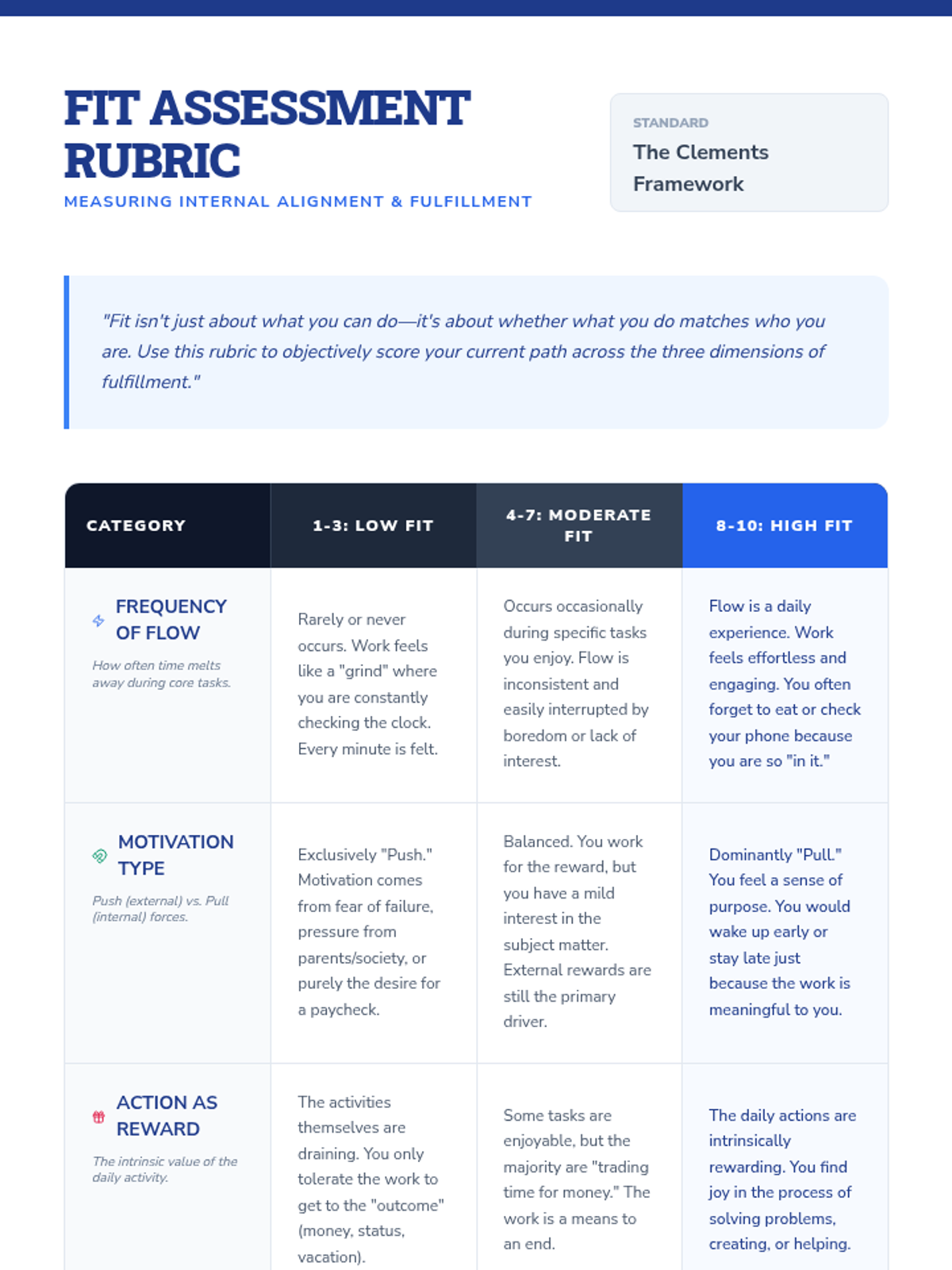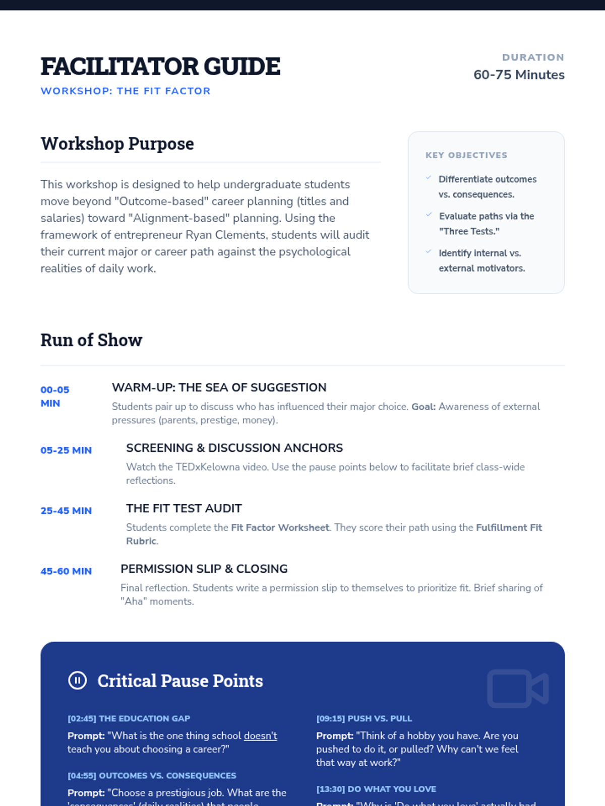 This workshop helps undergraduate students evaluate their career paths using Ryan Clements' 'Three Tests' for fulfillment. Students move beyond external prestige to analyze their daily 'consequences' through the lenses of flow, motivation types, and intrinsic rewards.