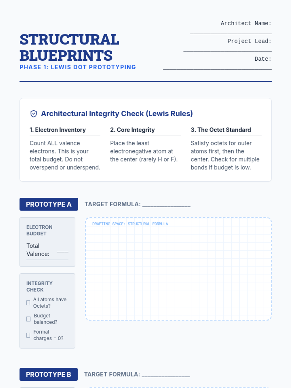 Students use Lewis structure rules and valence electron counts to draft valid molecular candidates that meet the structural requirements of their design brief.