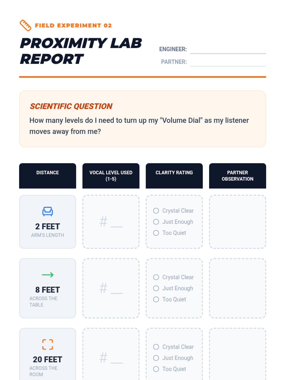 Students conduct experiments to understand how physical distance between speaker and listener dictates the necessary vocal volume, practicing adjustments for various ranges.