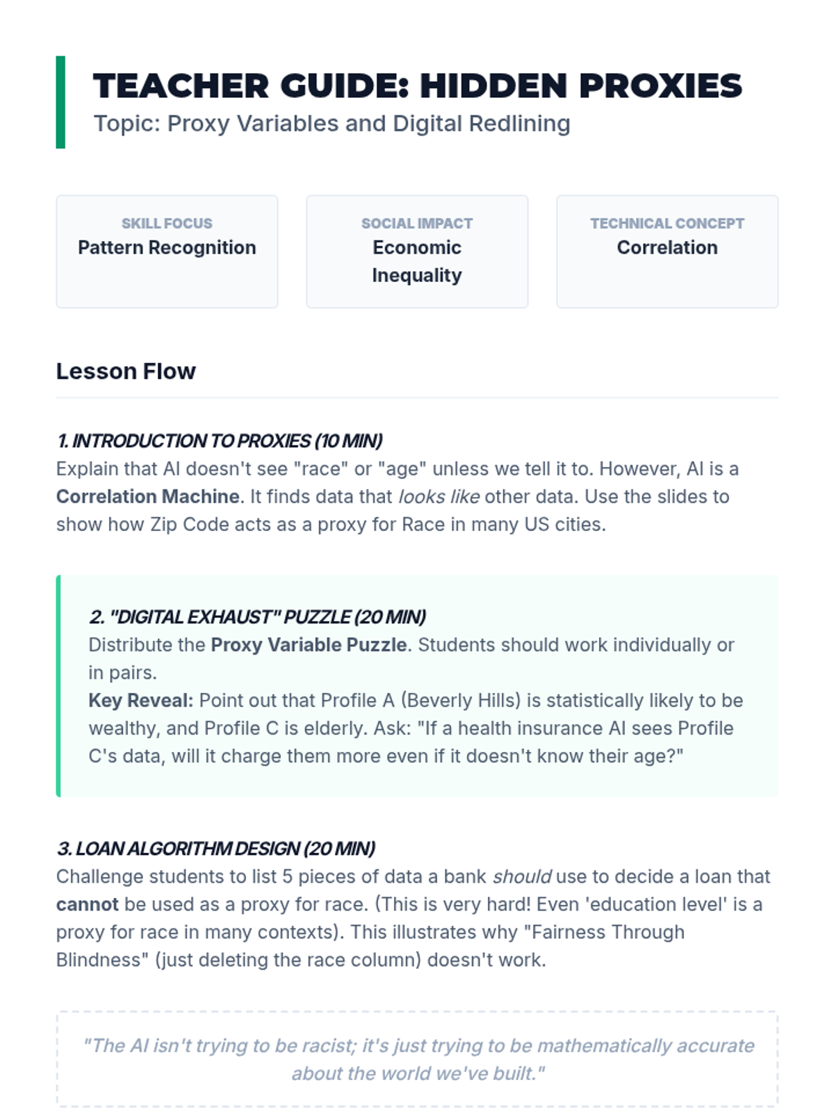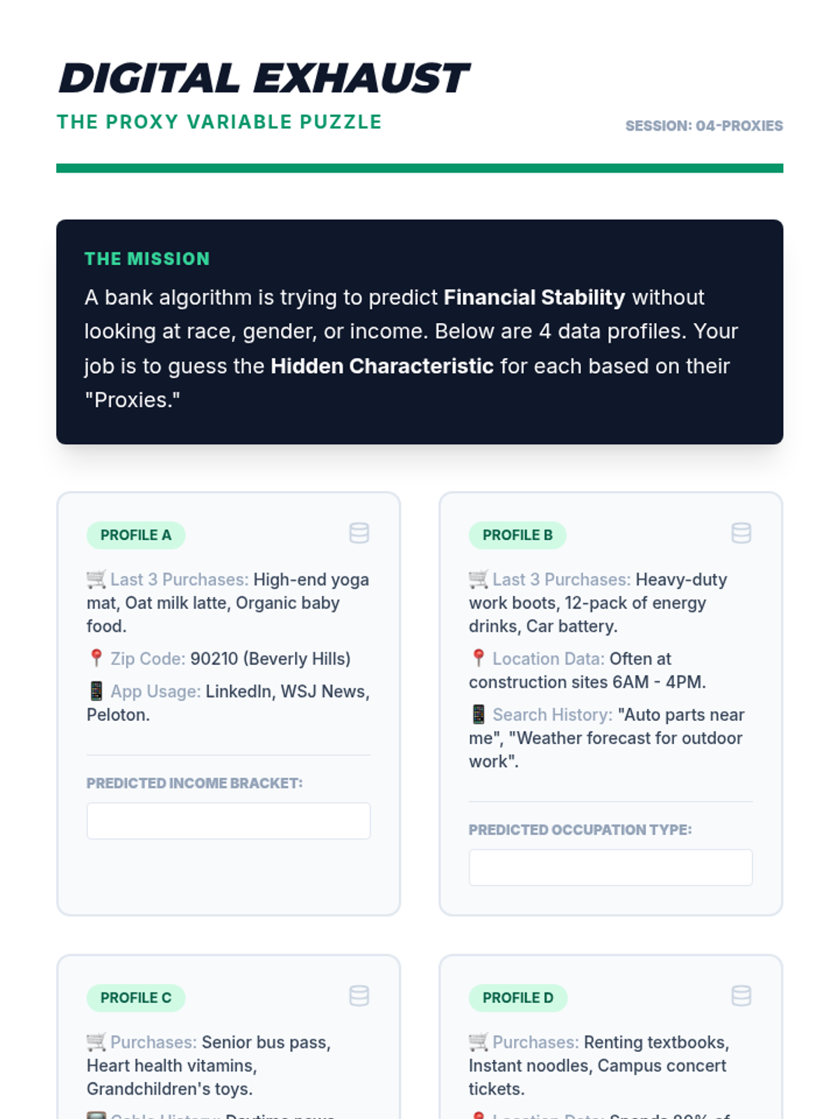 Students investigate how seemingly neutral proxy variables like zip code can lead to discriminatory outcomes in lending and hiring.