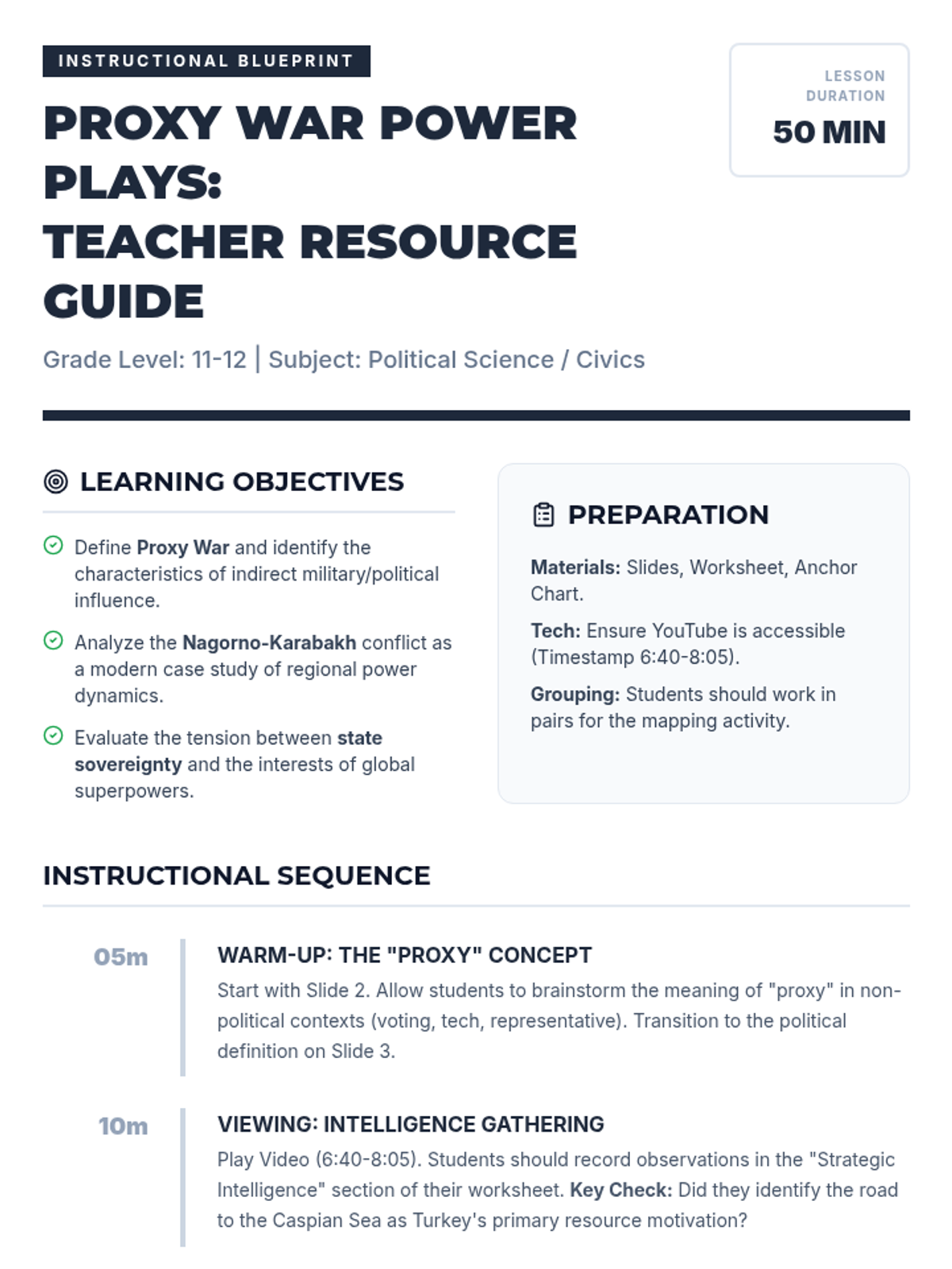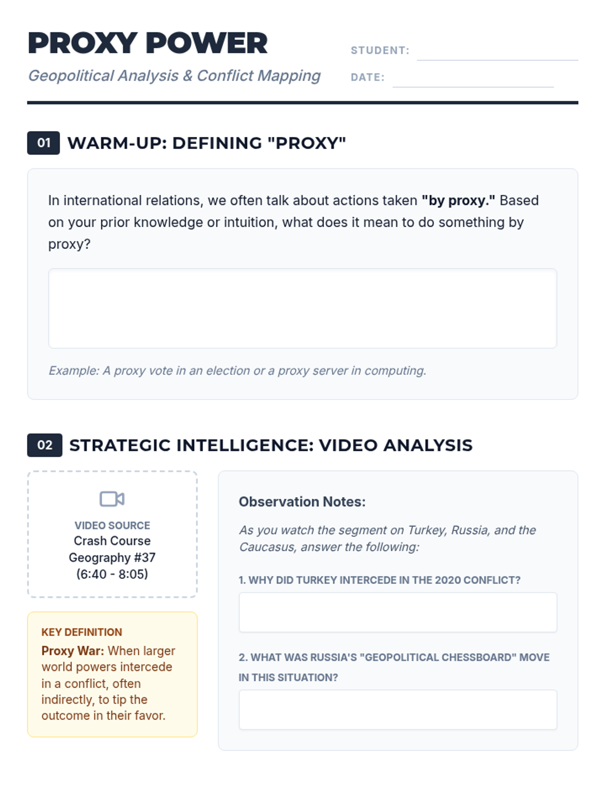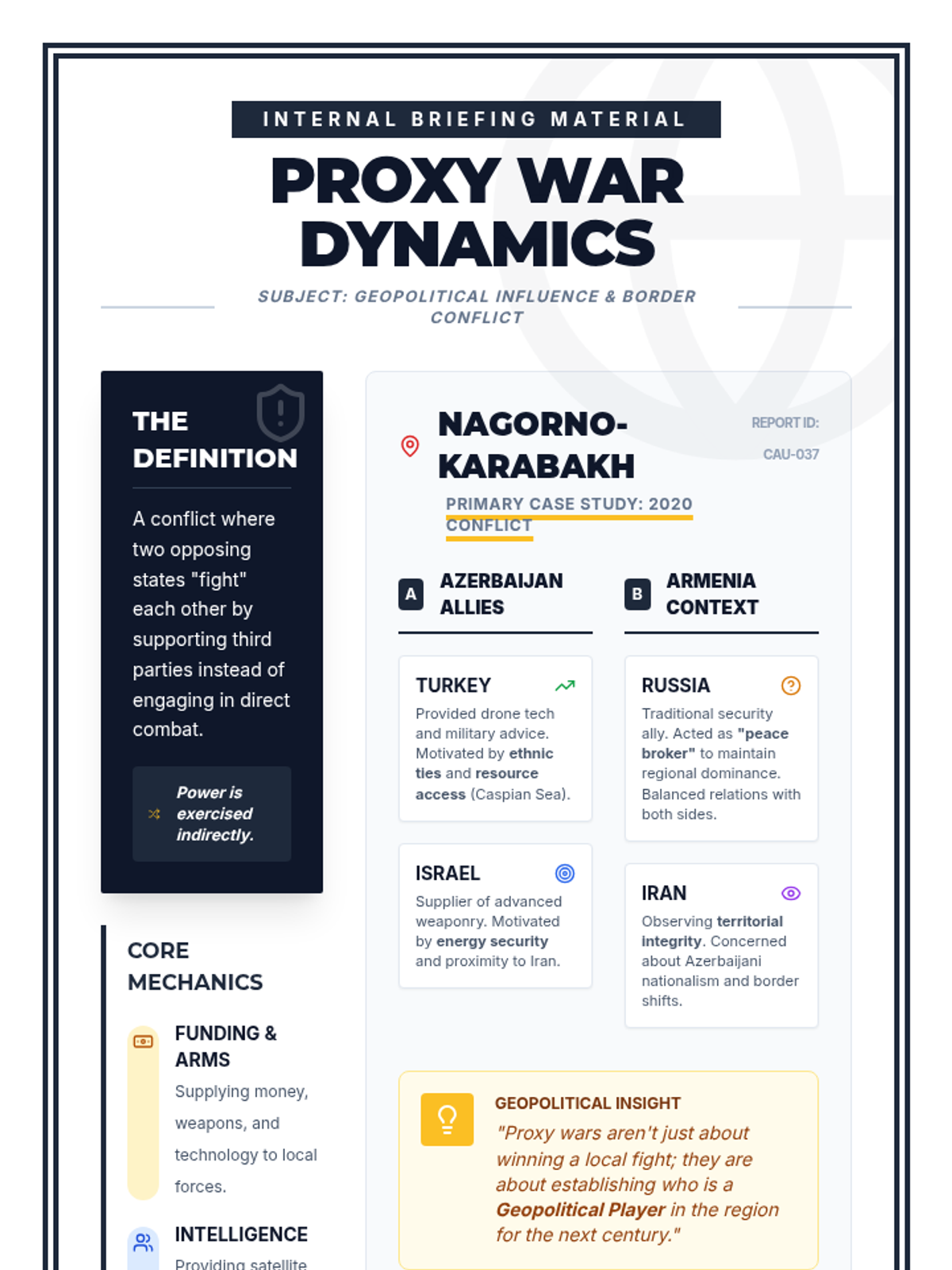 A high-school level exploration of proxy wars and geopolitics, focusing on the Nagorno-Karabakh conflict as a modern case study of how major powers influence regional borders.