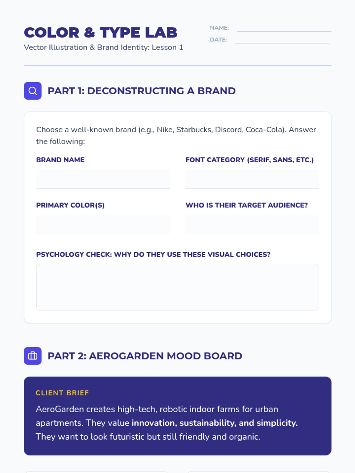 Students explore color theory and typography, analyzing how brands communicate emotions and values through visual choices. They create a digital mood board to establish a brand's aesthetic foundation.