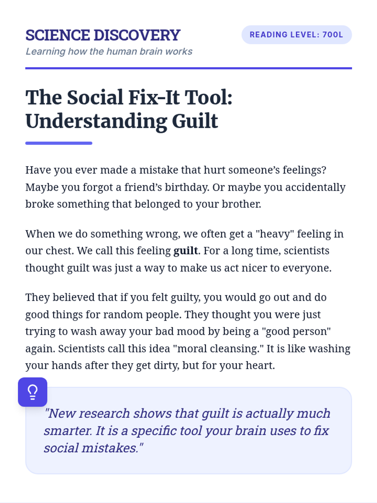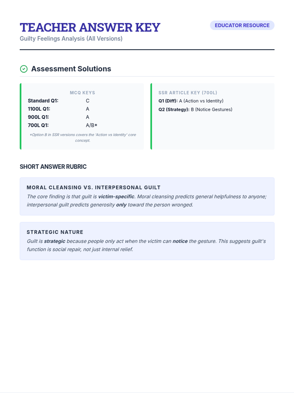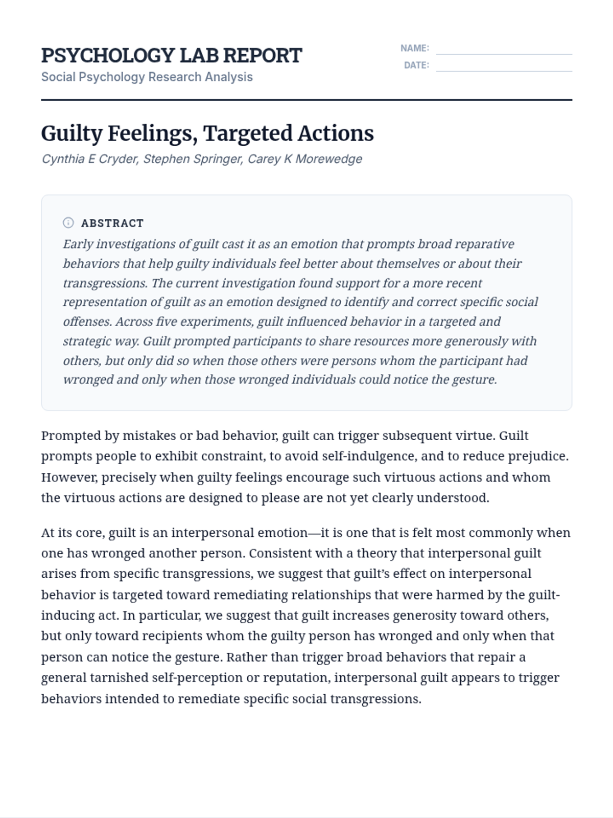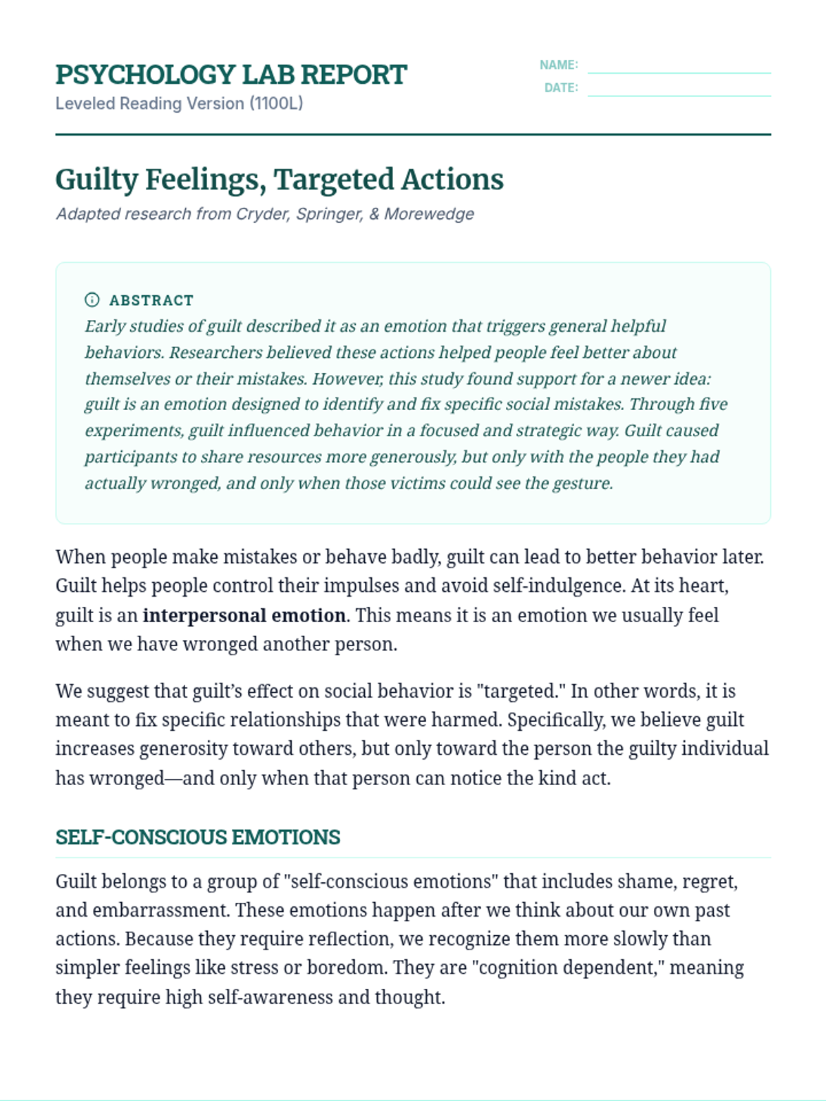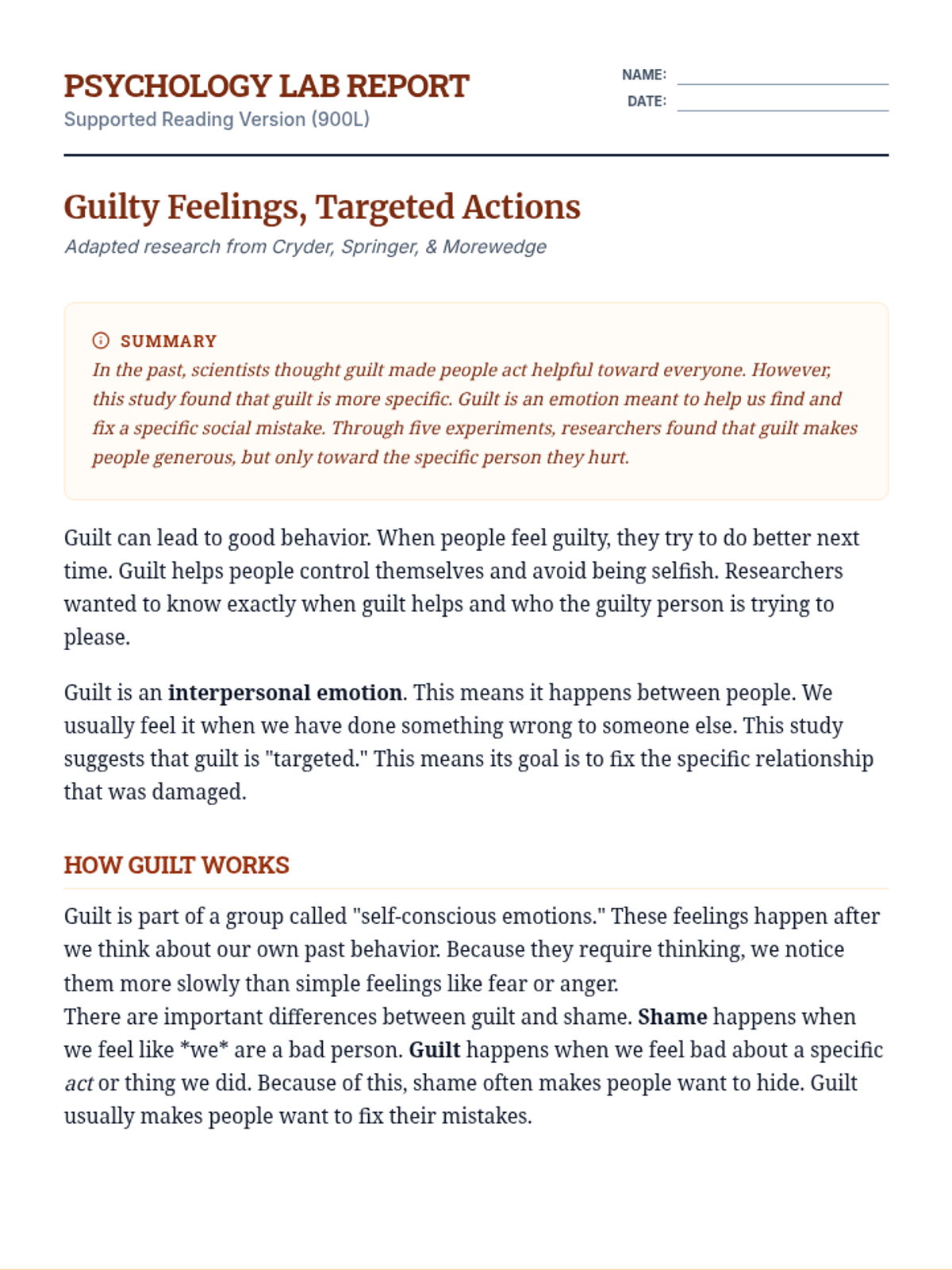 A deep dive into social psychology research exploring how guilt functions as a targeted social mechanism rather than a broad emotional state. Students will analyze academic text, define complex vocabulary, and evaluate the specific behavioral consequences of guilt.