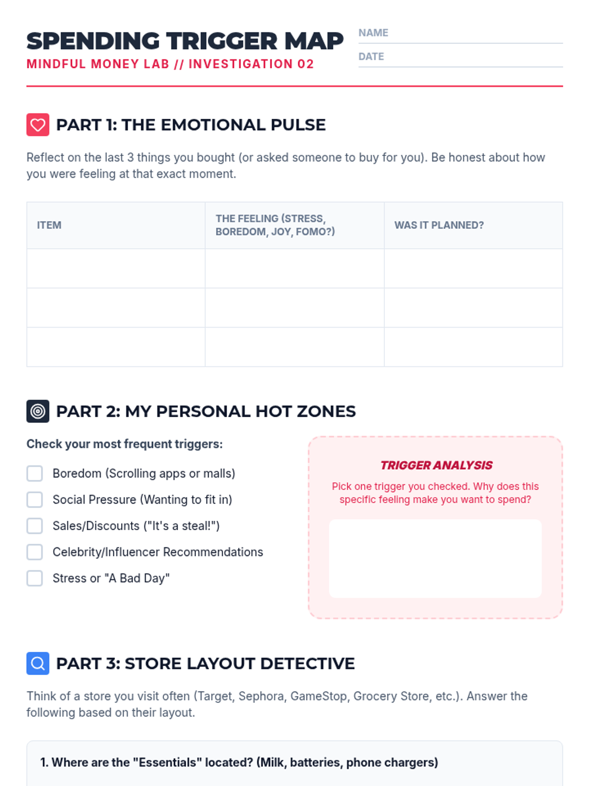 Students explore the concept of 'retail therapy' and emotional spending. They identify their own 'spending triggers' and discuss how stores are designed to encourage impulse buys.