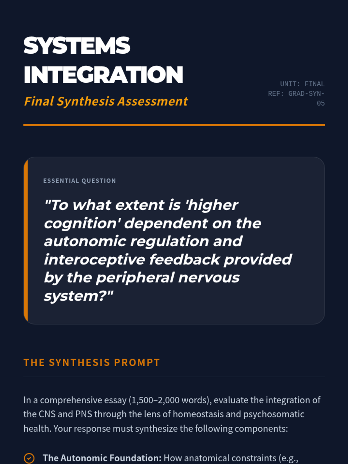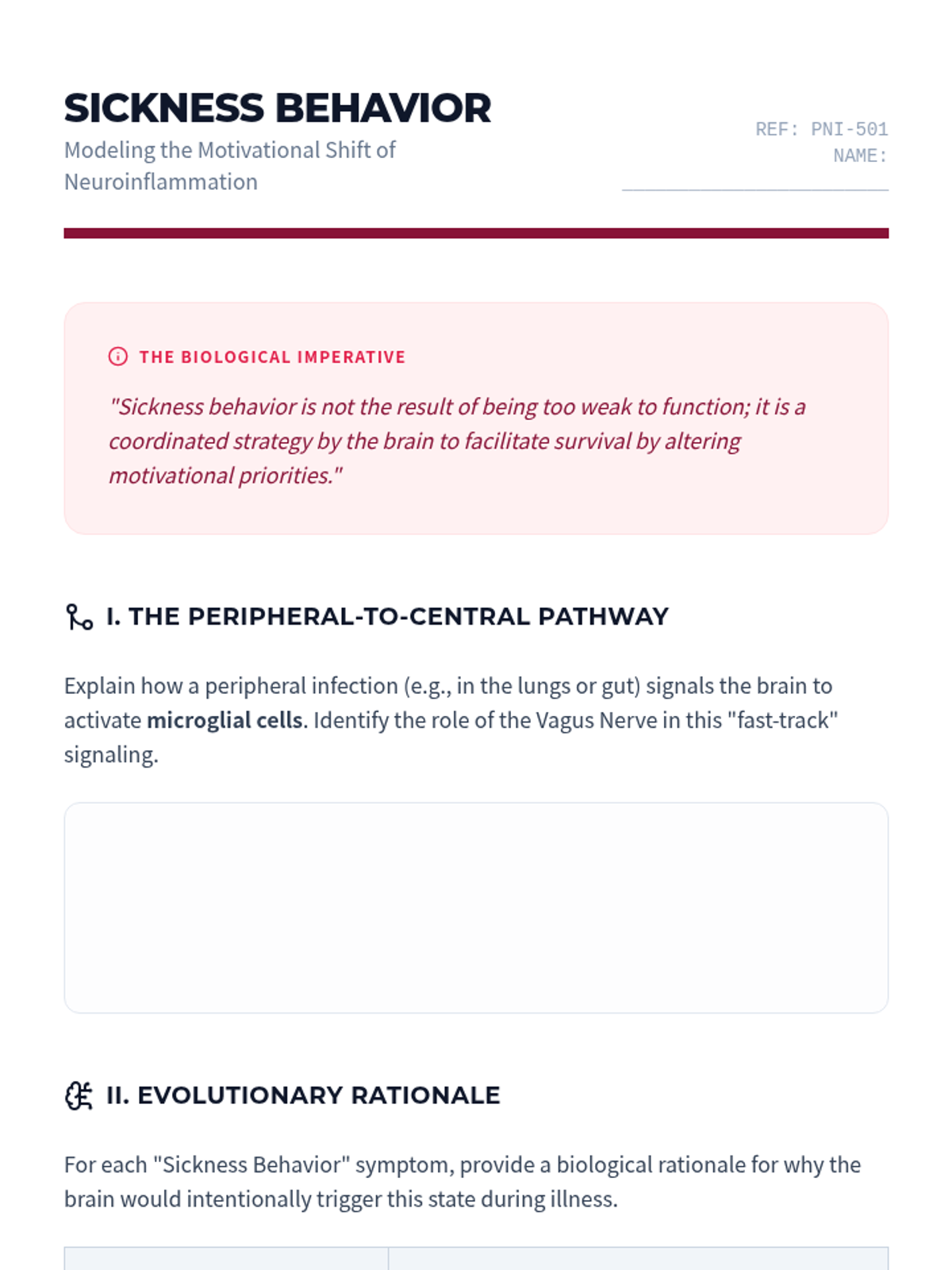 The sequence concludes by examining the bidirectional communication between the nervous and immune systems. Students review literature on how cytokines affect neural function and how neural states influence immune competency.