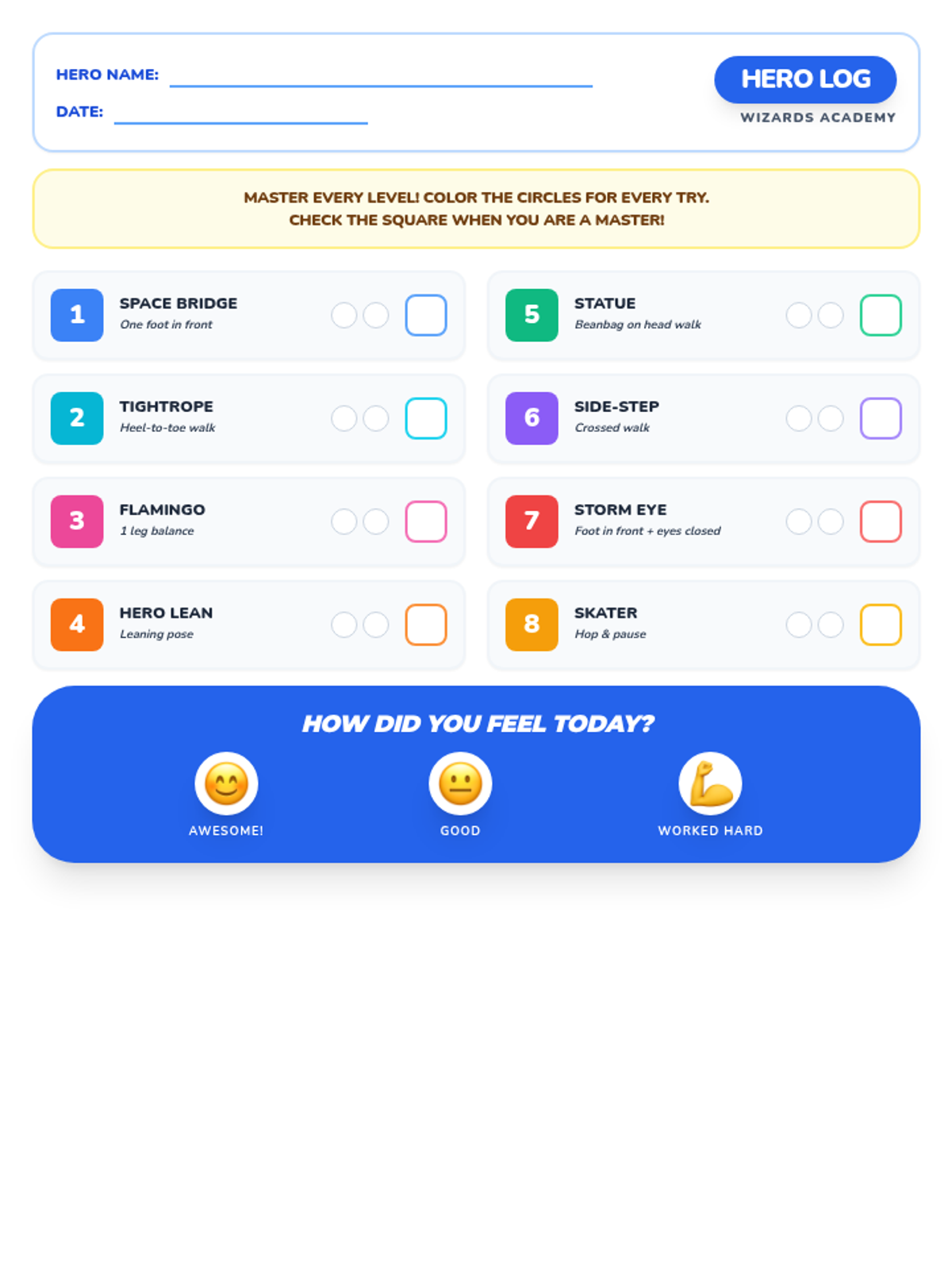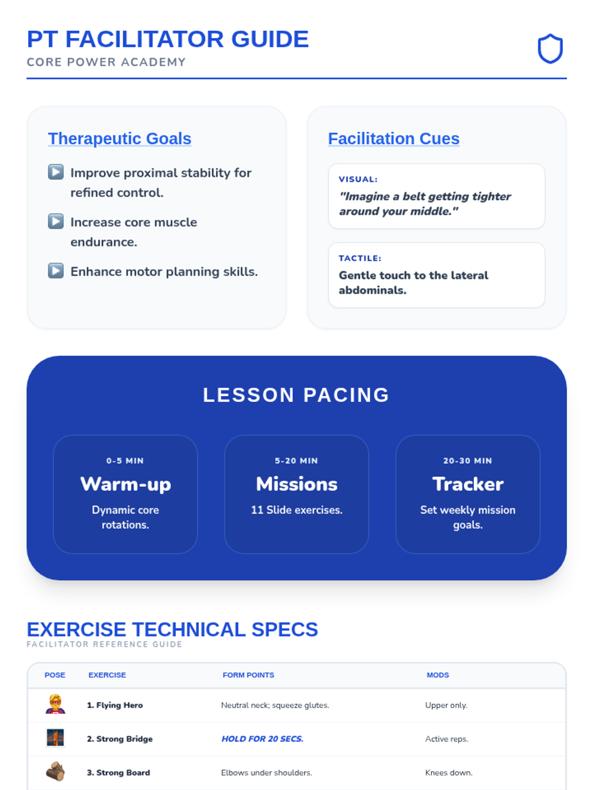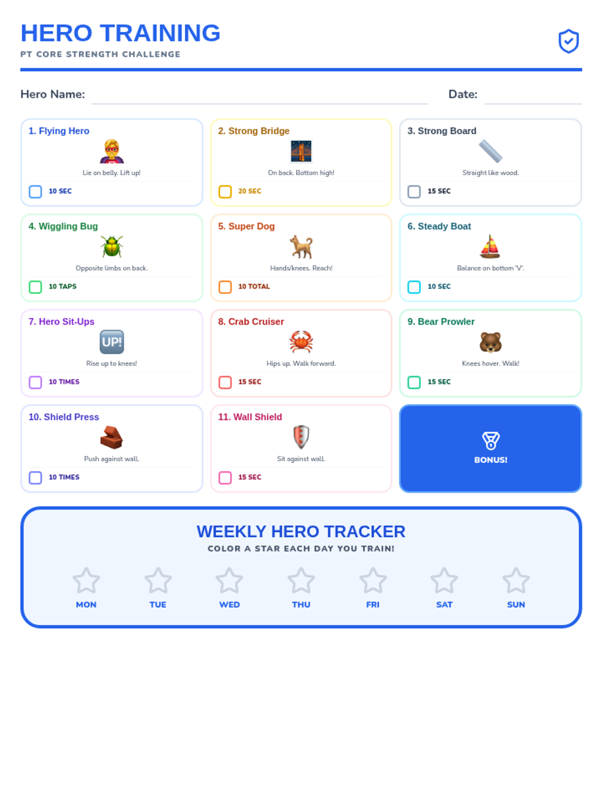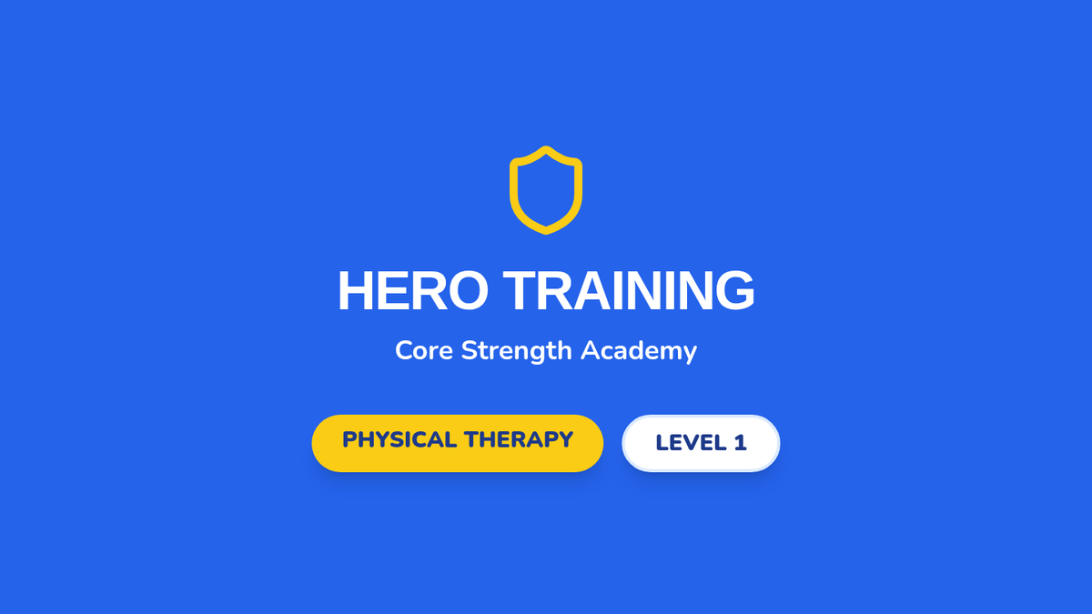 A physical therapy focused lesson for 1st graders to build core strength through 'Hero Training' exercises. Includes visual guides and a progress tracker for home or school use.