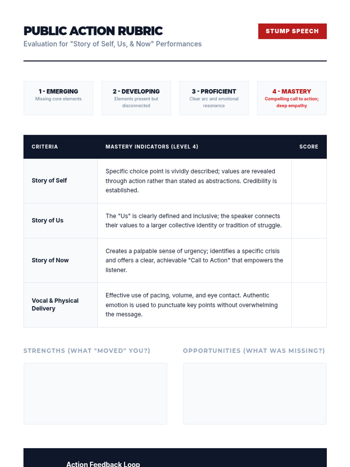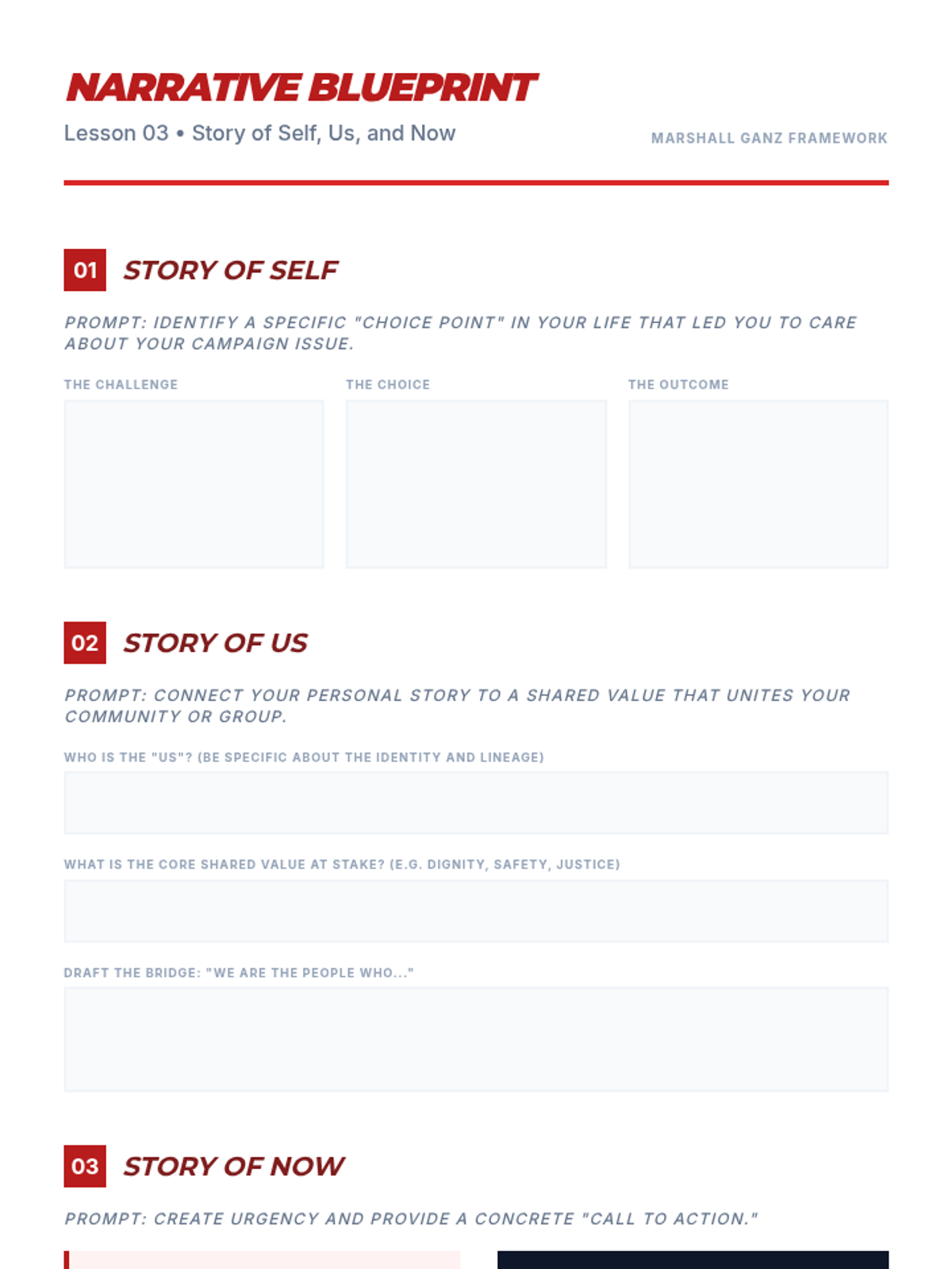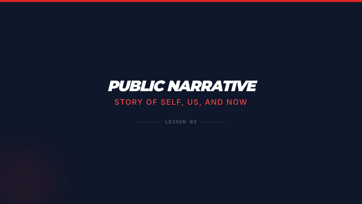 Students practice Marshall Ganz’s 'Story of Self, Us, and Now' framework to translate personal values into public calls to action.