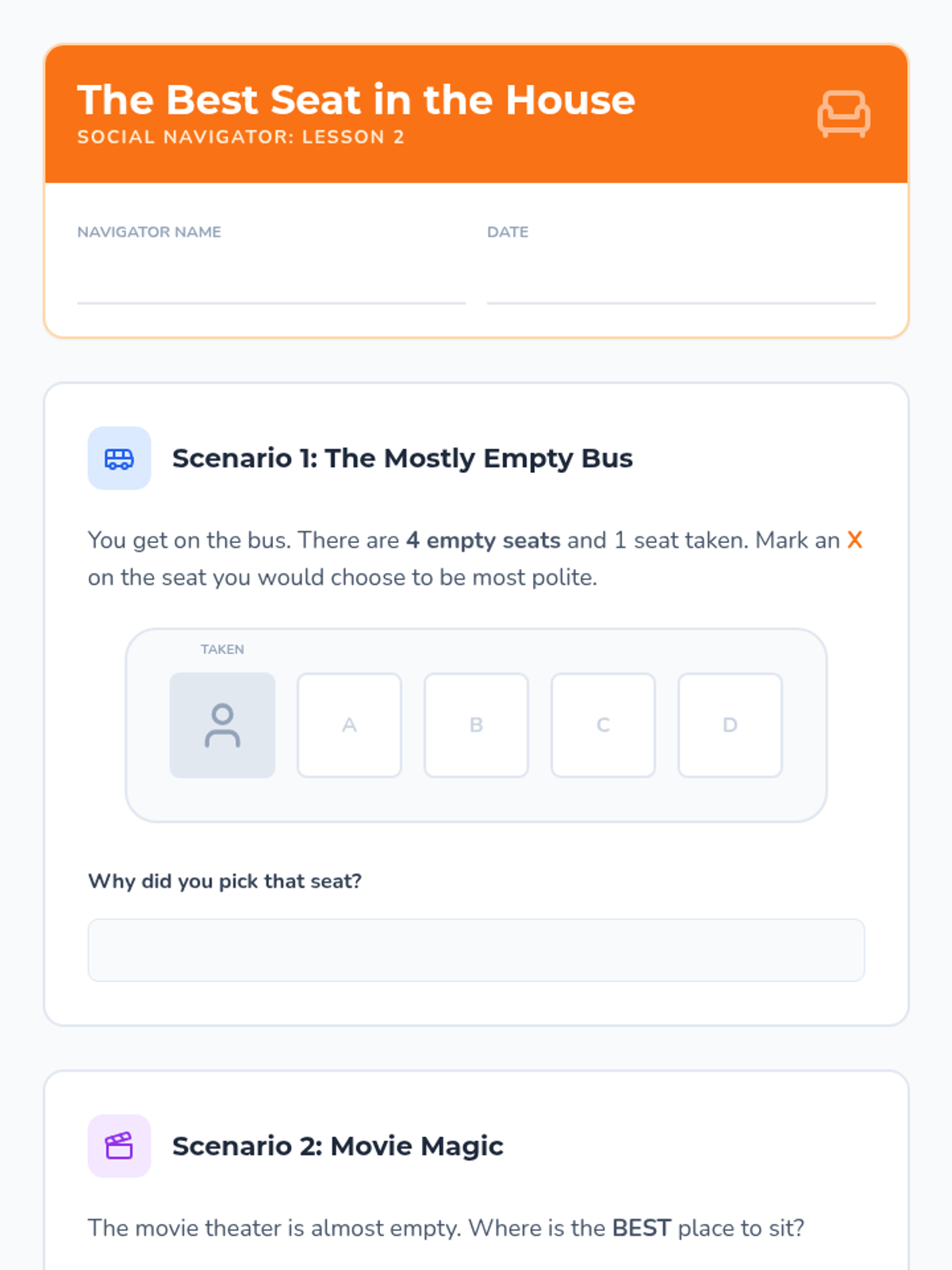 Students learn social norms for selecting seats in public spaces like buses and theaters to maintain appropriate distance from others.