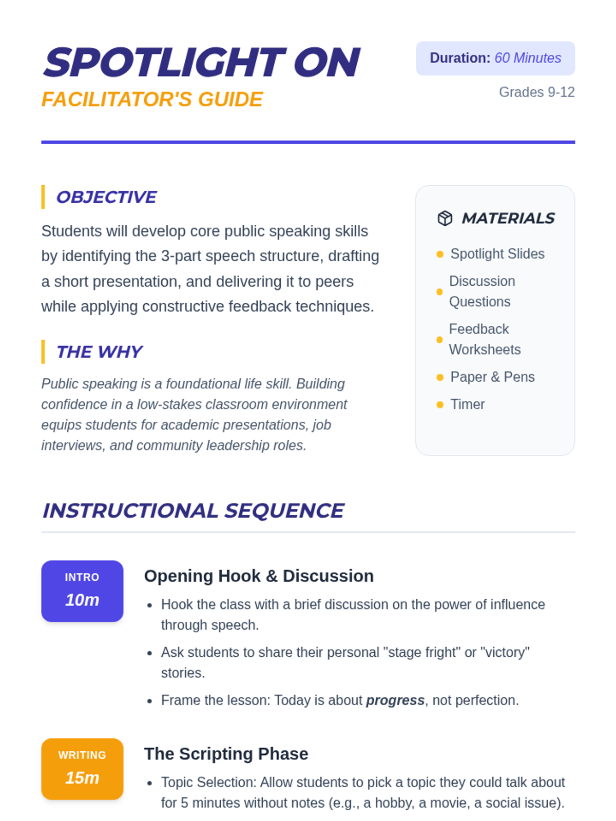 This lesson helps high school students build public speaking confidence through structured speech writing, small-group practice, and constructive peer feedback. Students learn the importance of communication skills and how to structure a short, impactful presentation.