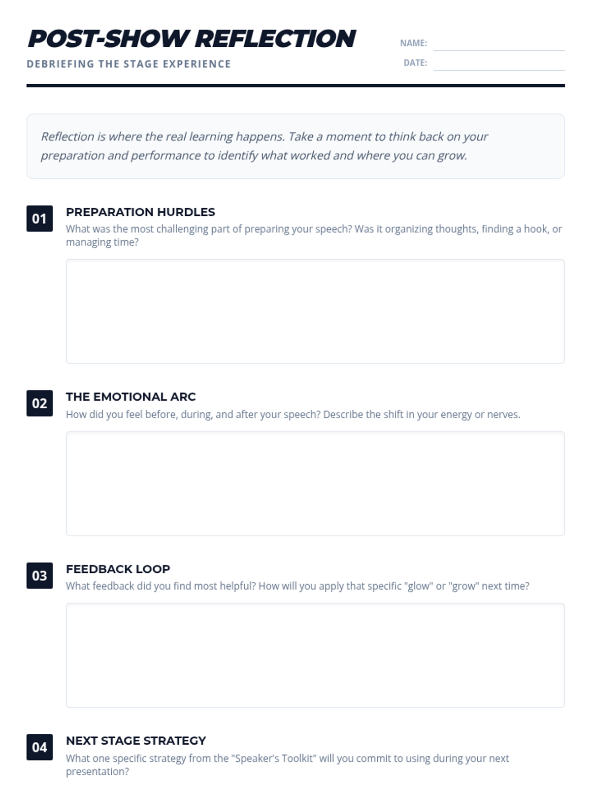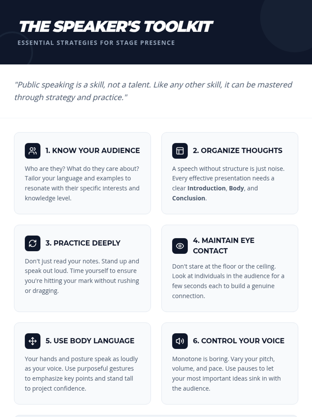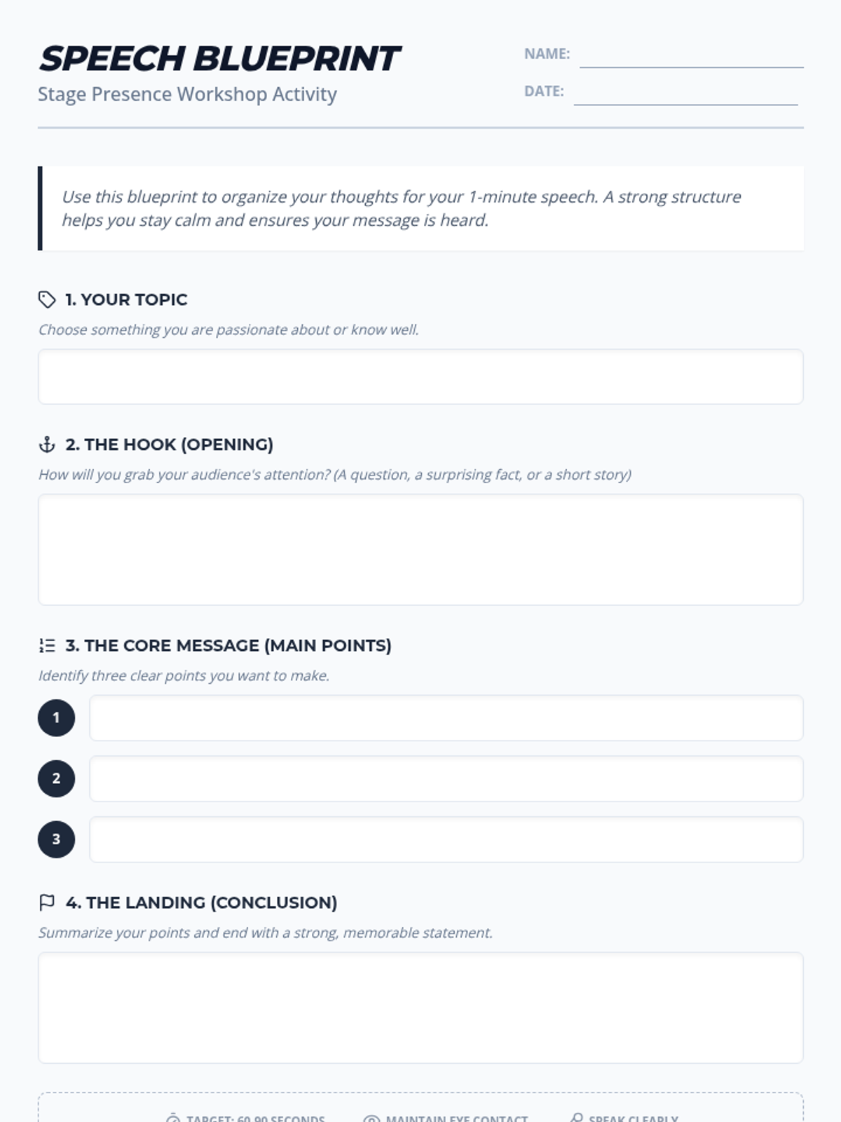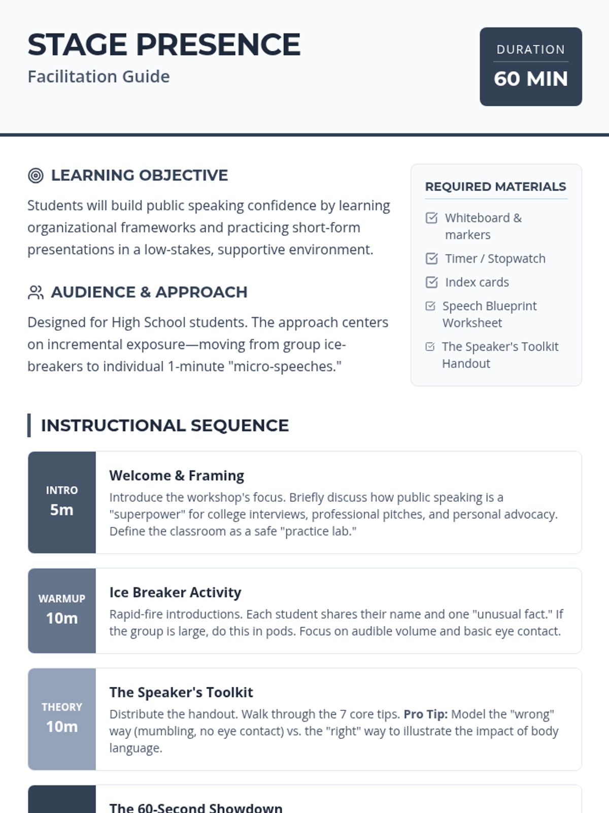 A comprehensive workshop for high school students to build public speaking confidence, organize their thoughts, and practice presenting in a supportive environment.