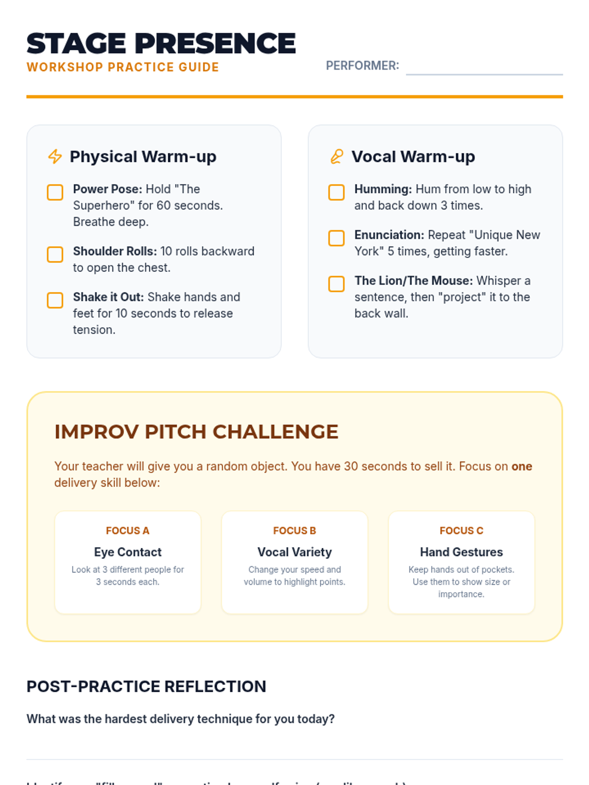 A hands-on workshop focused on the physical and vocal aspects of public speaking, including body language, eye contact, and vocal variety.