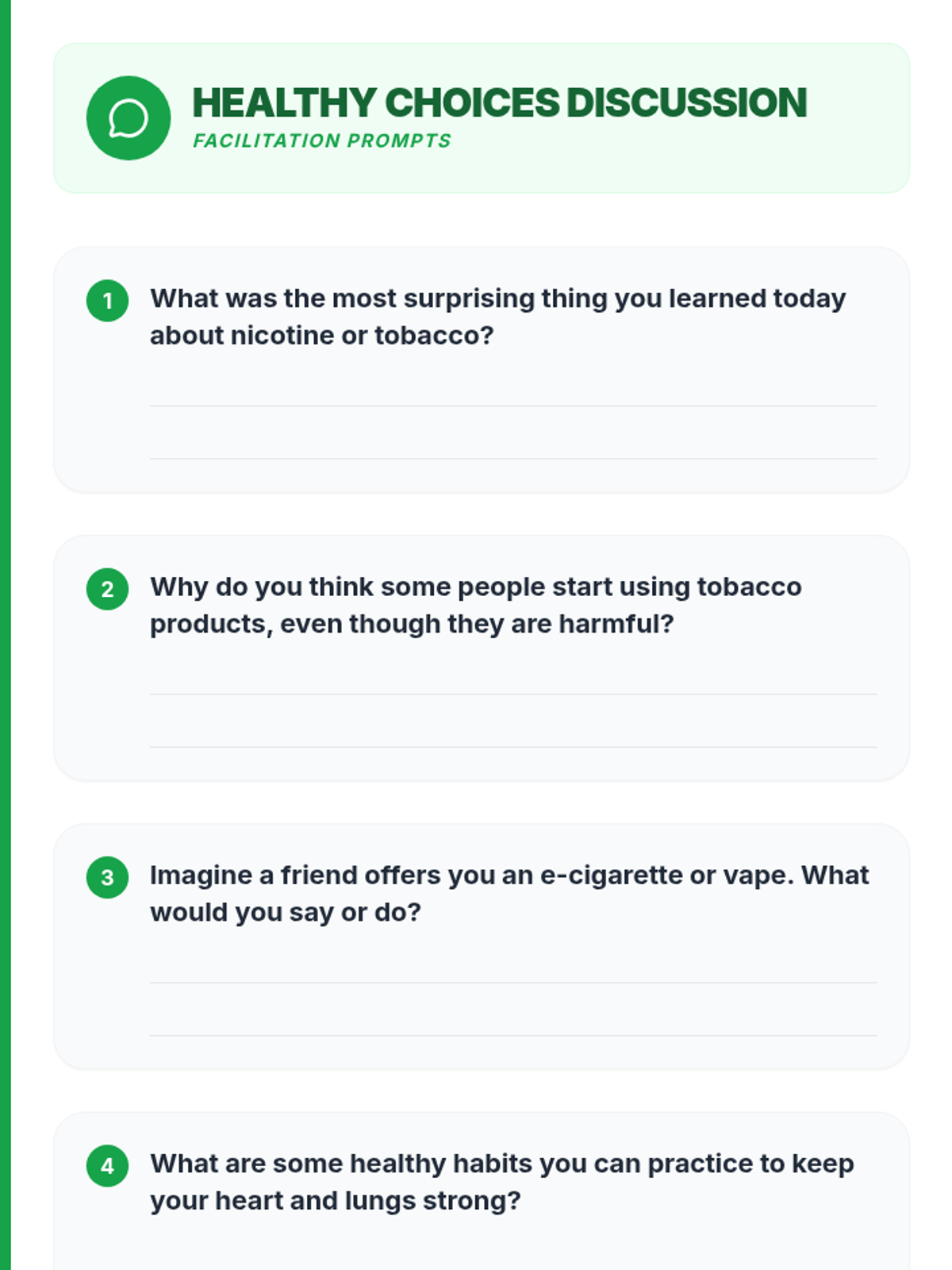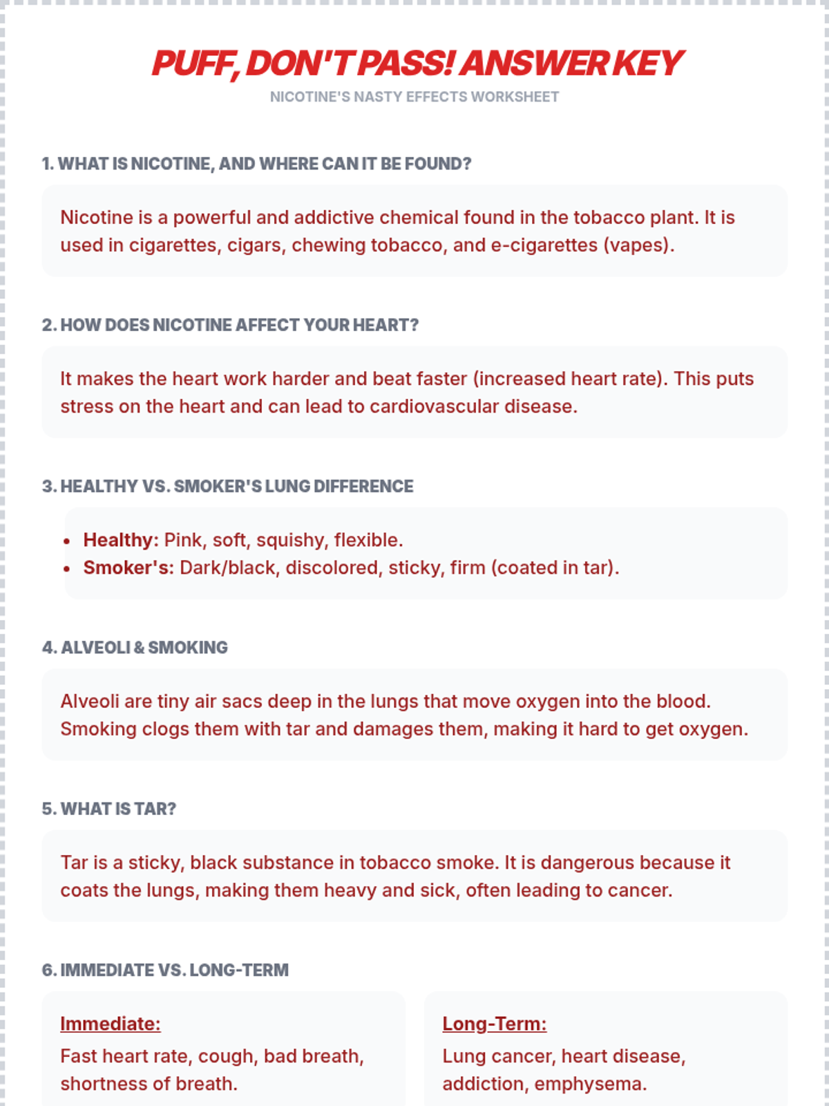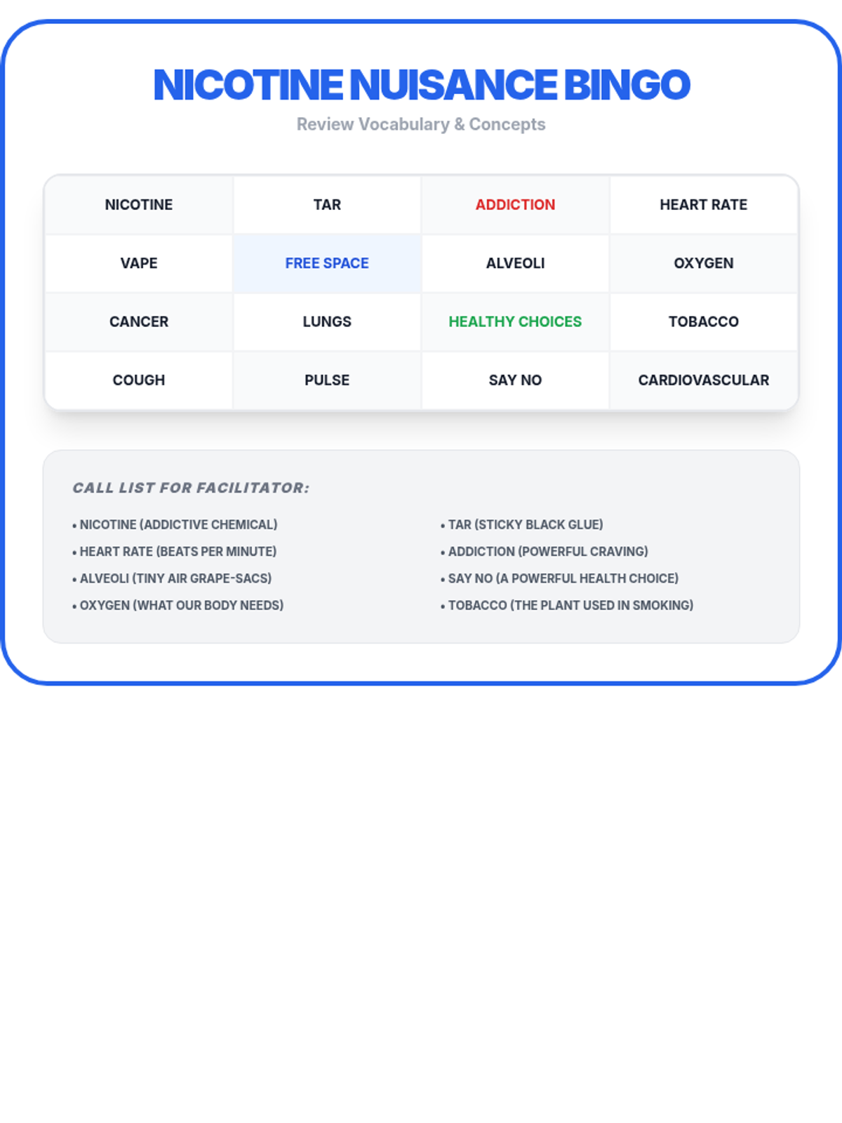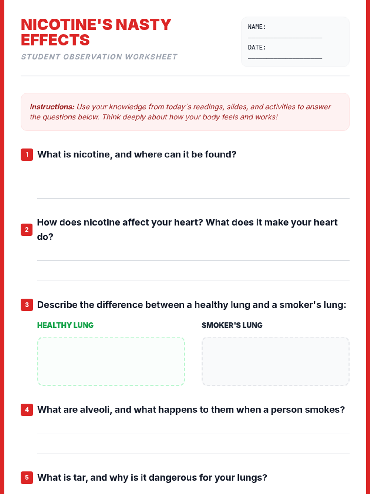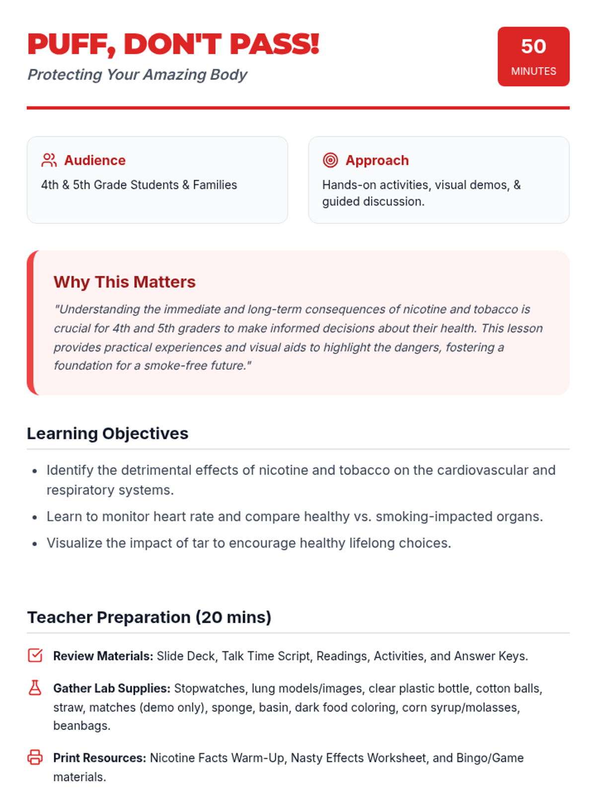 A comprehensive 50-minute health lesson for 4th-grade students exploring the immediate and long-term effects of nicotine and tobacco on the cardiovascular and respiratory systems through hands-on activities and visual demonstrations.