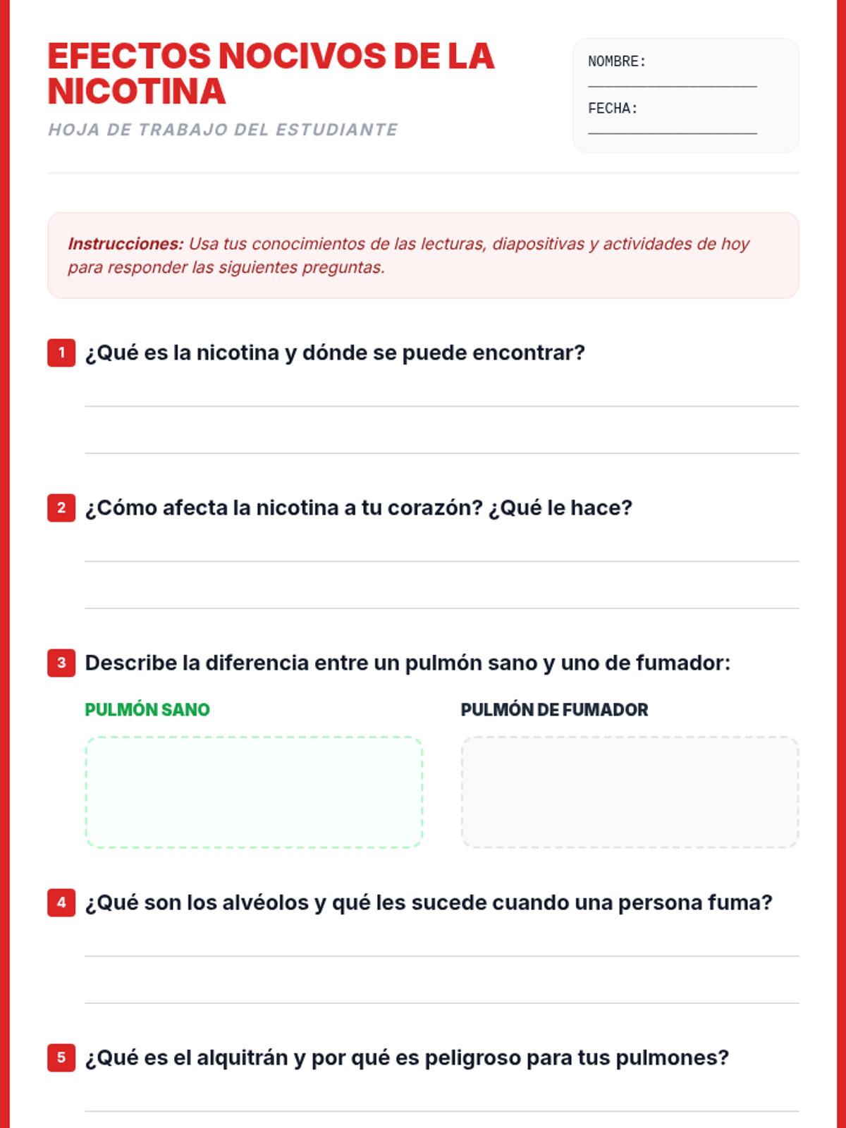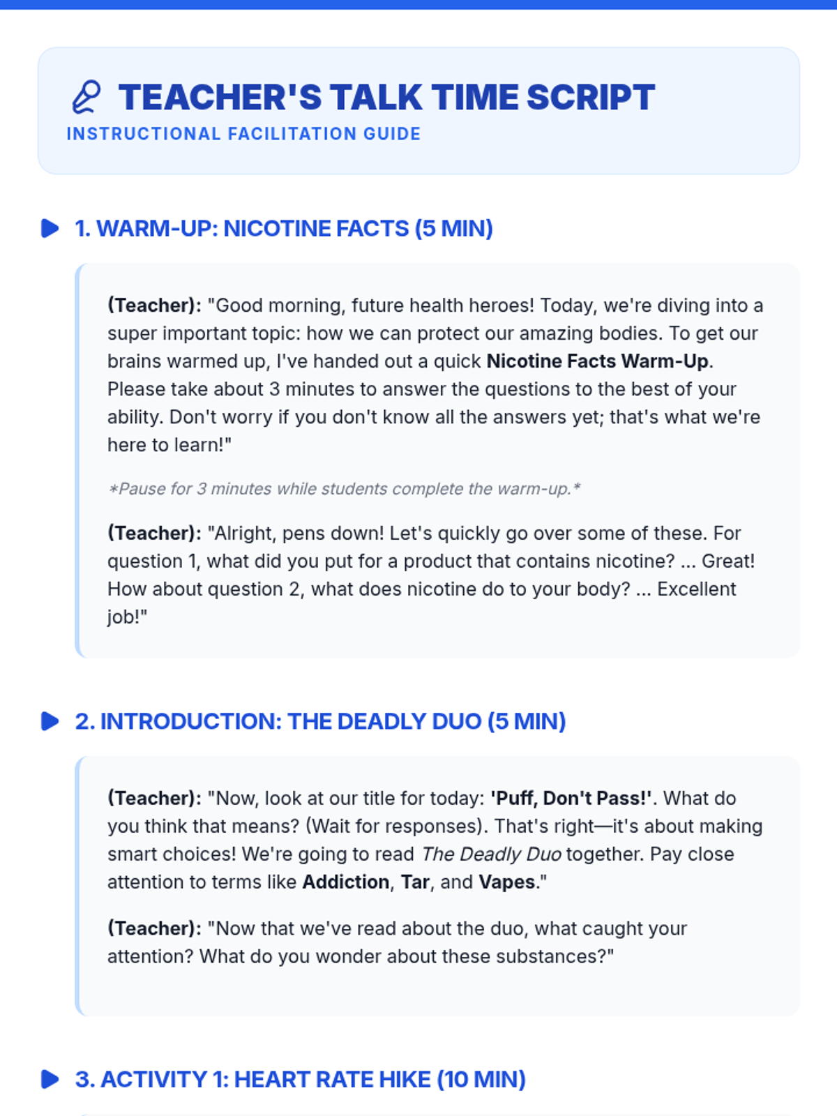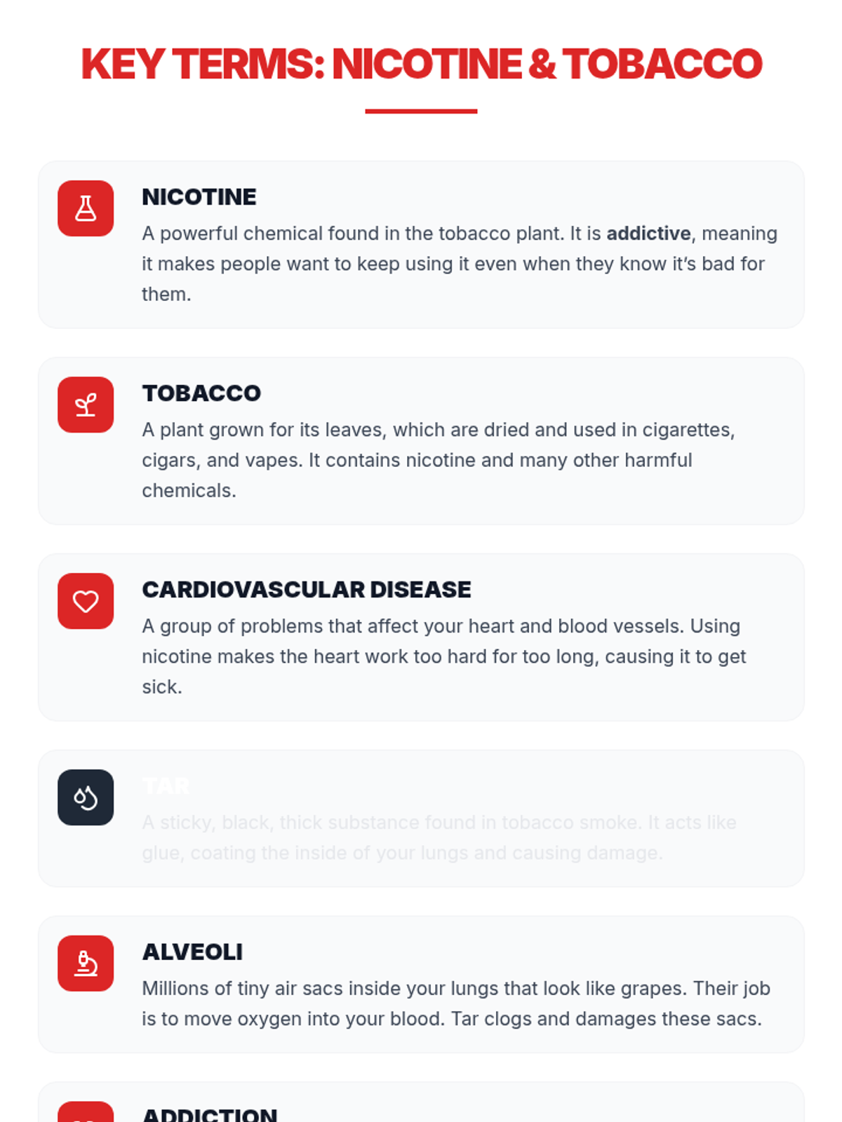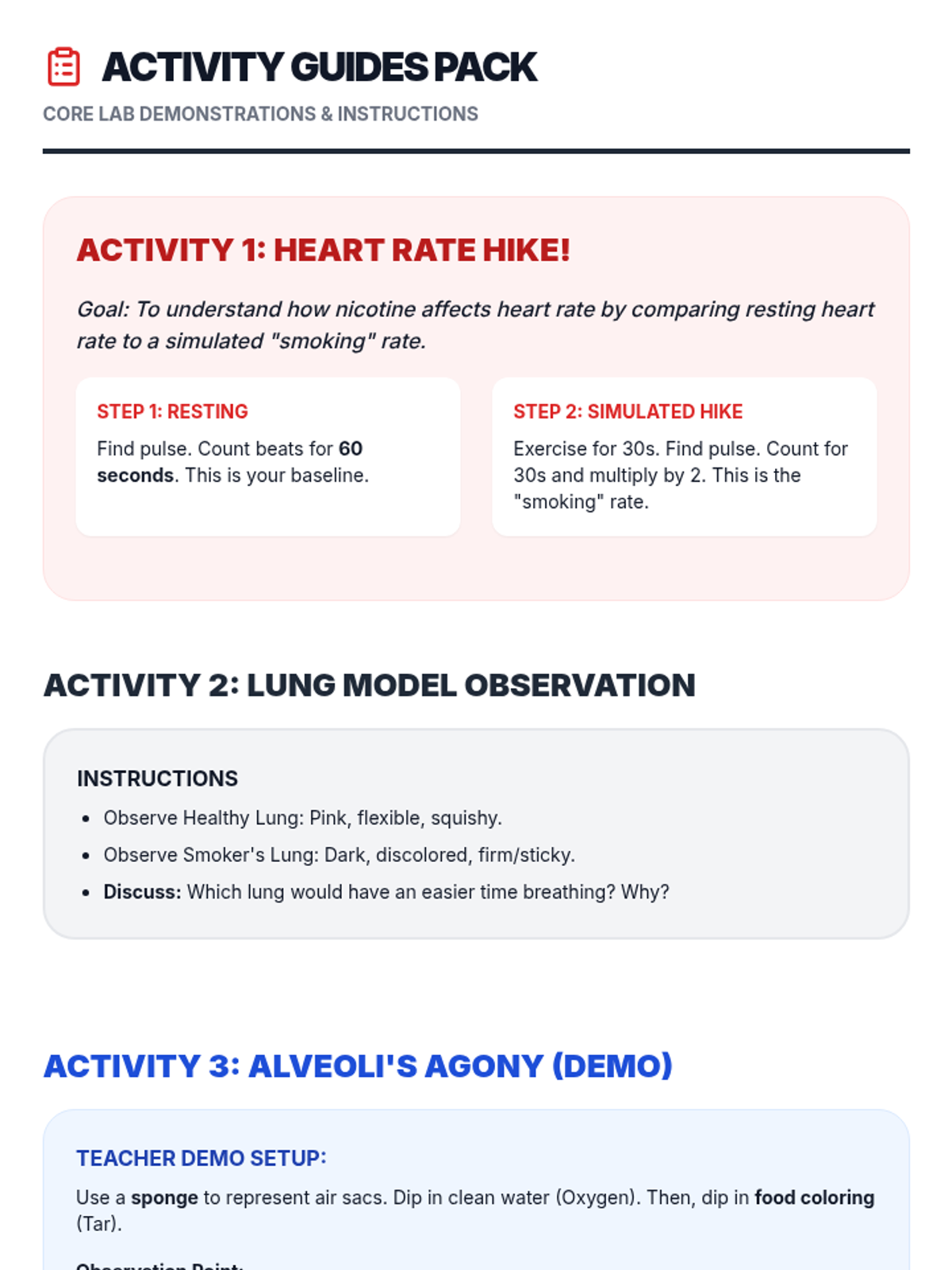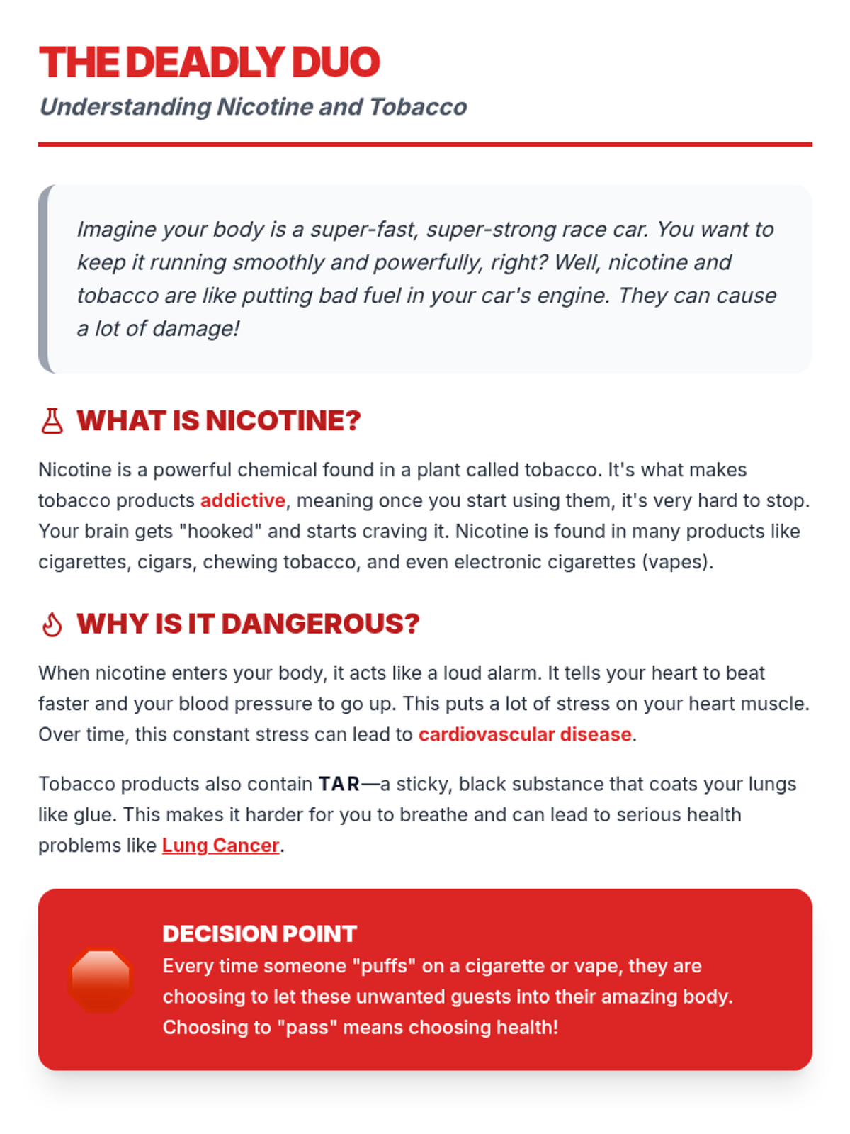 A comprehensive 50-minute health lesson for 4th-grade students exploring the immediate and long-term effects of nicotine and tobacco on the cardiovascular and respiratory systems through hands-on activities and visual demonstrations.
