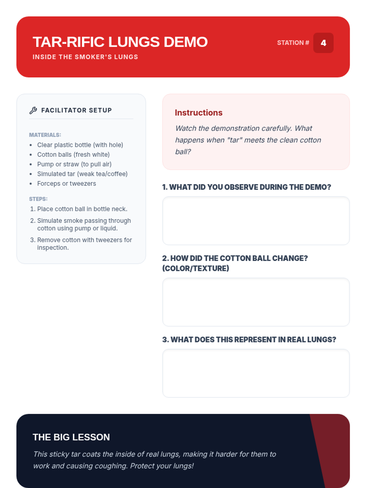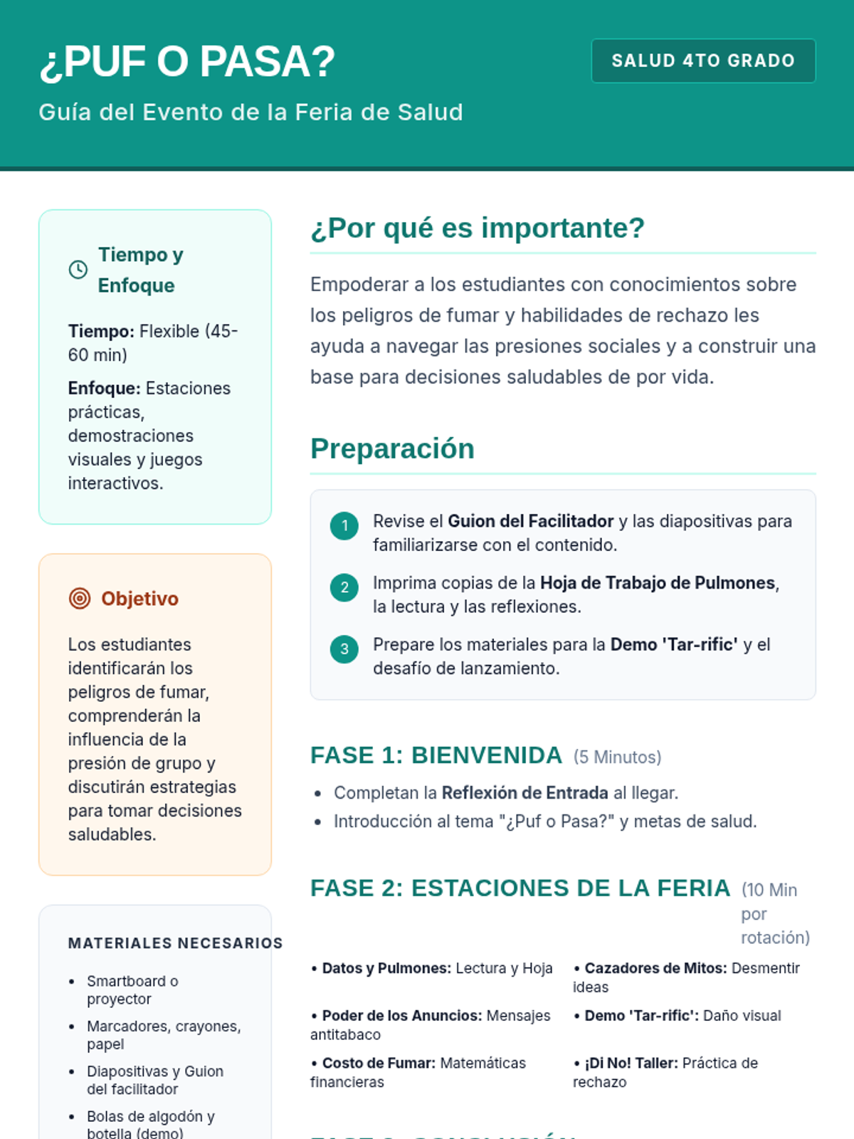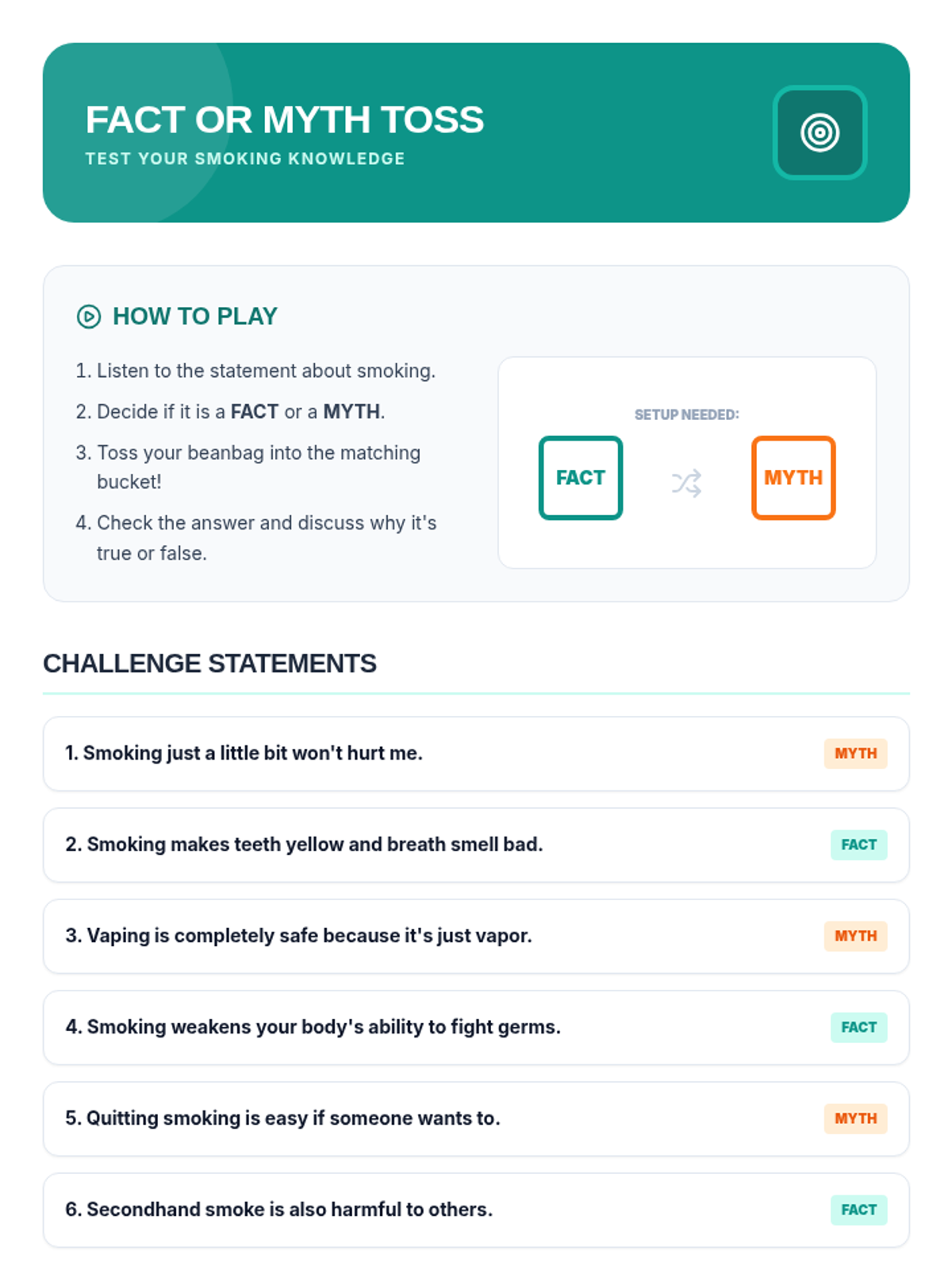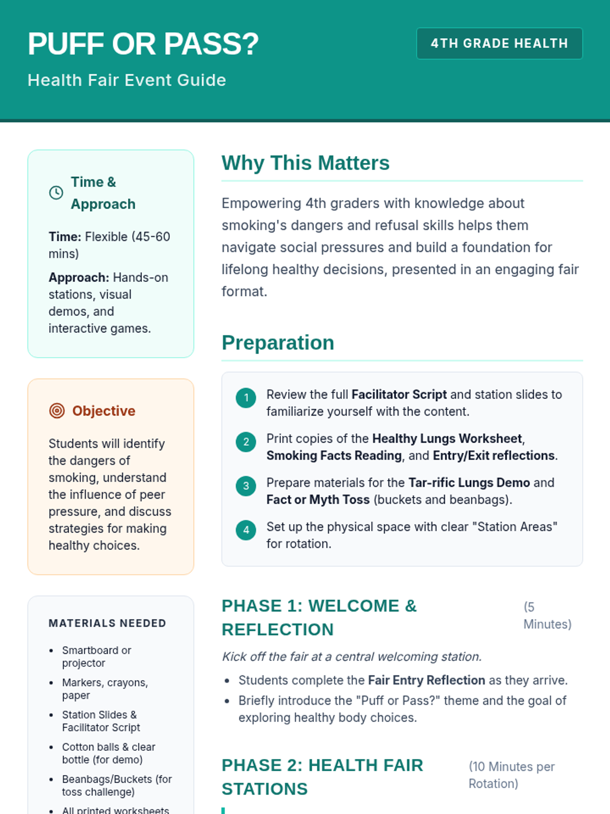 A station-based health fair for 4th graders to explore the effects of smoking, debunk myths, and develop refusal skills through interactive games and activities.