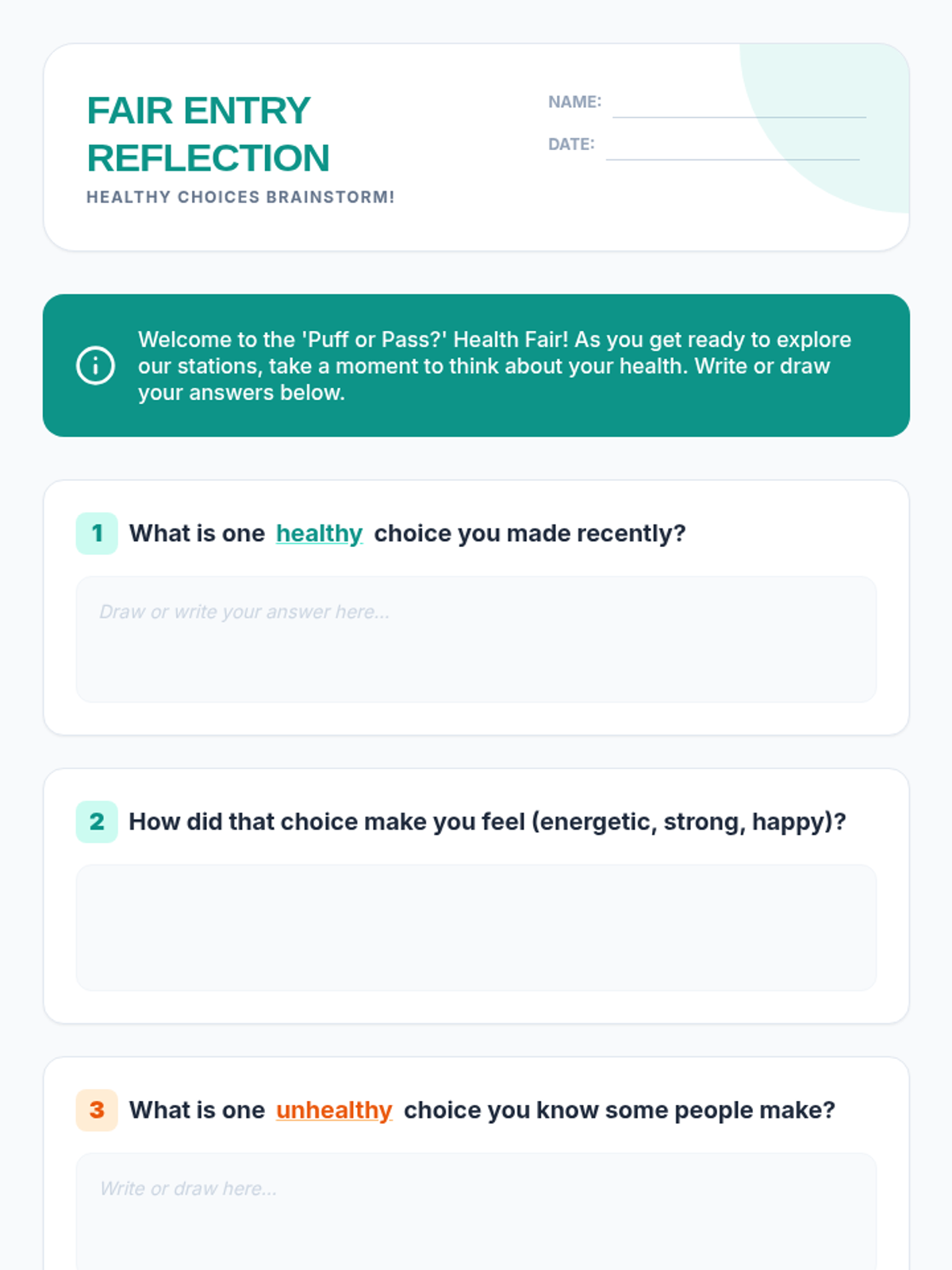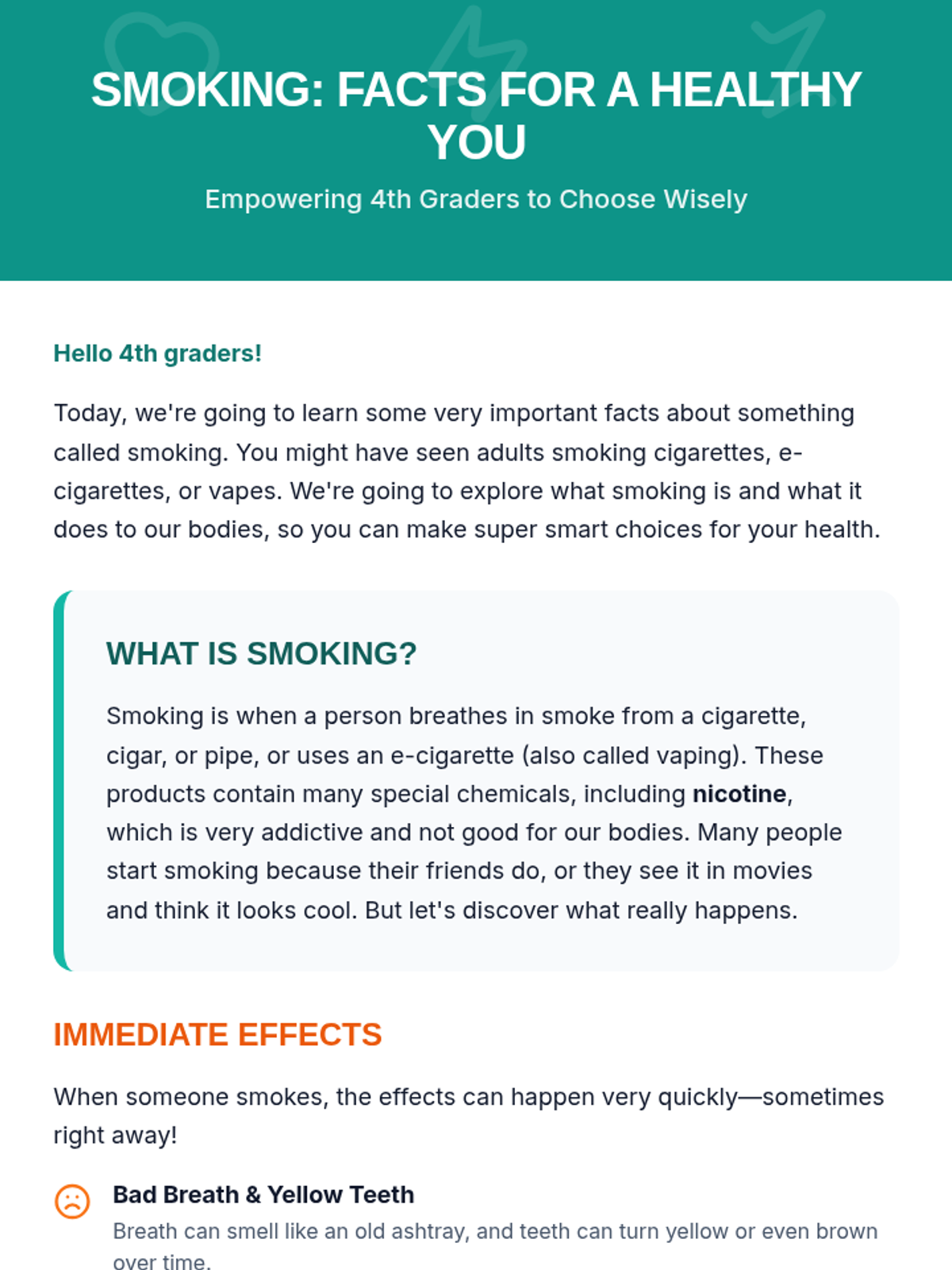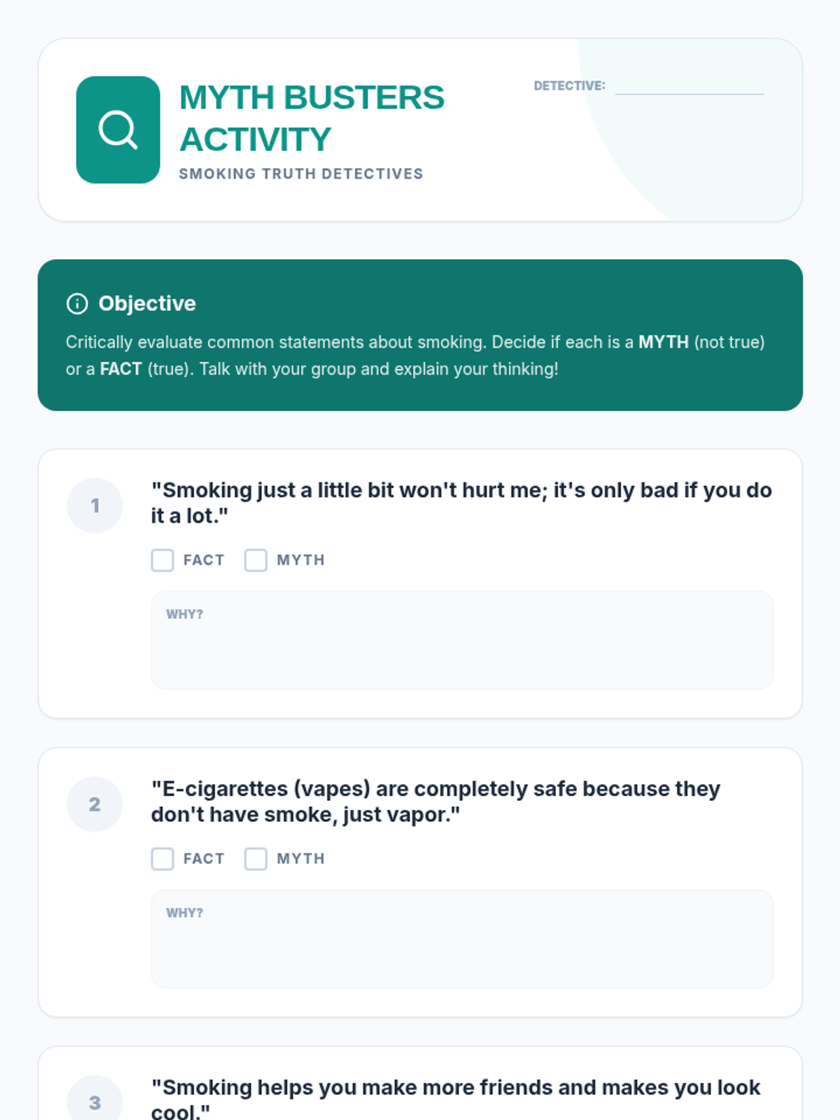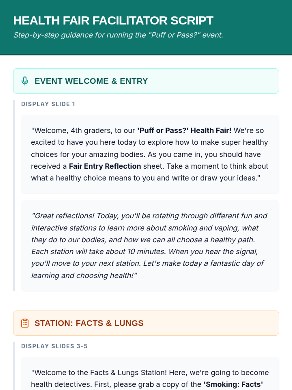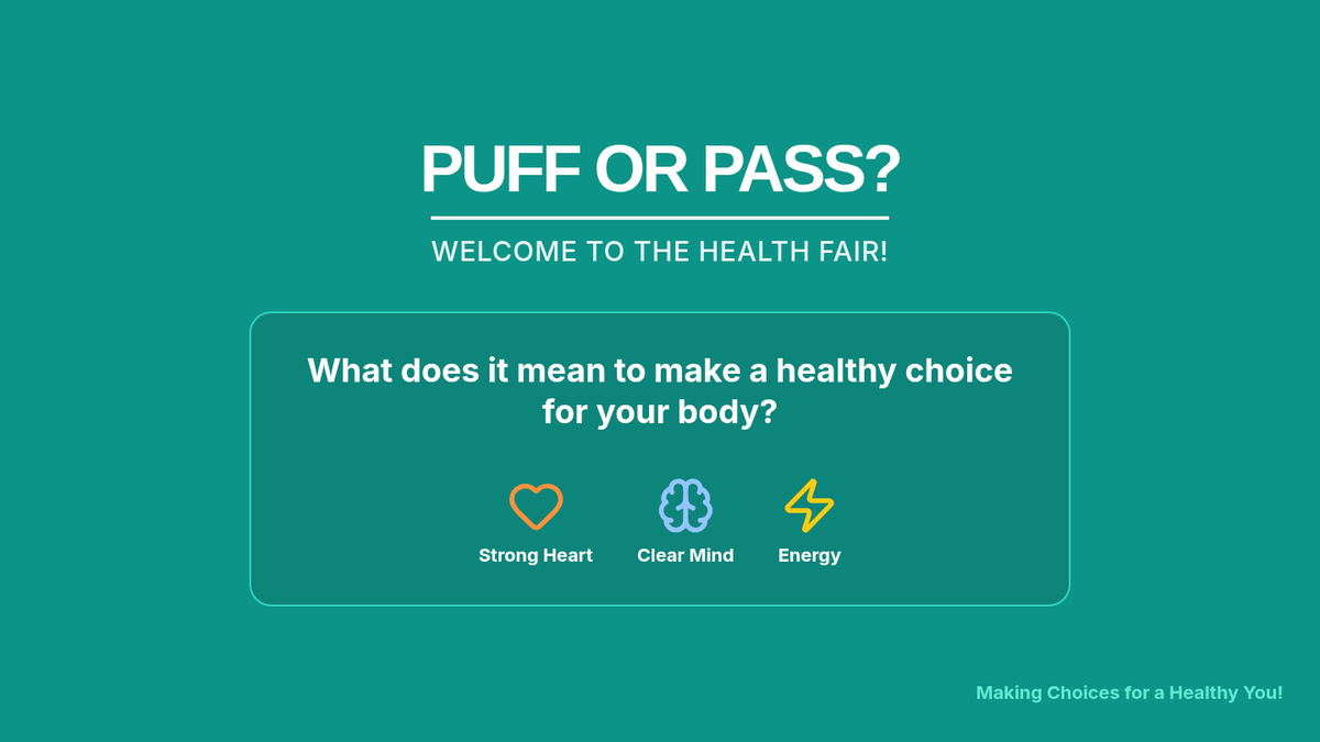 A station-based health fair for 4th graders to explore the effects of smoking, debunk myths, and develop refusal skills through interactive games and activities.