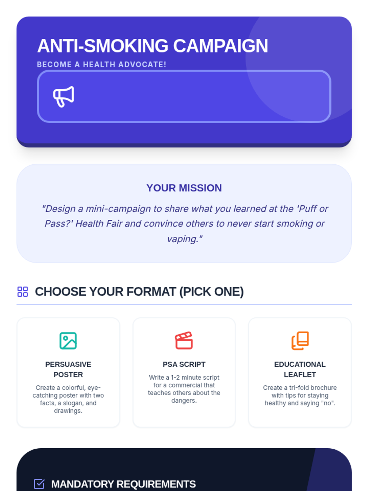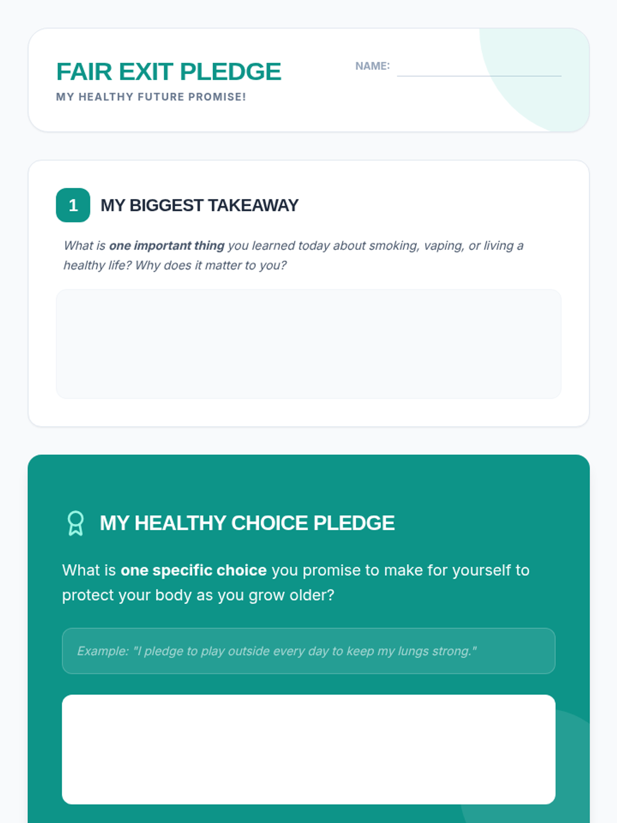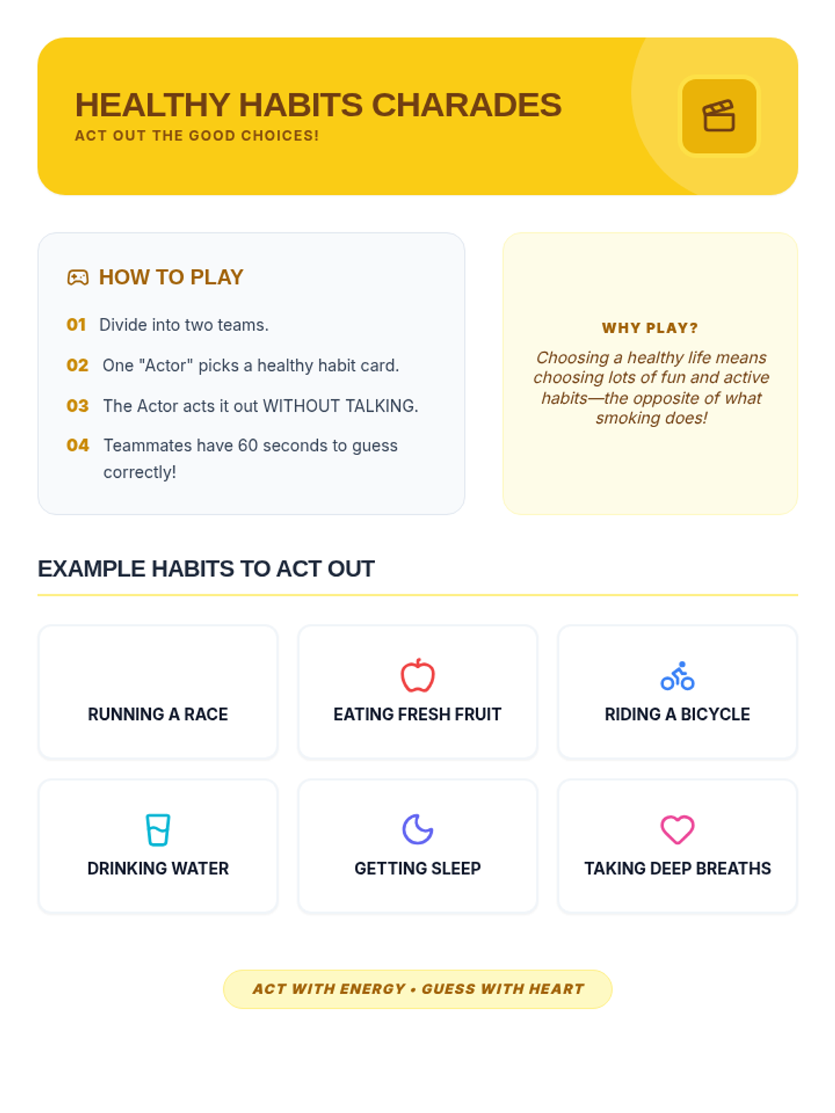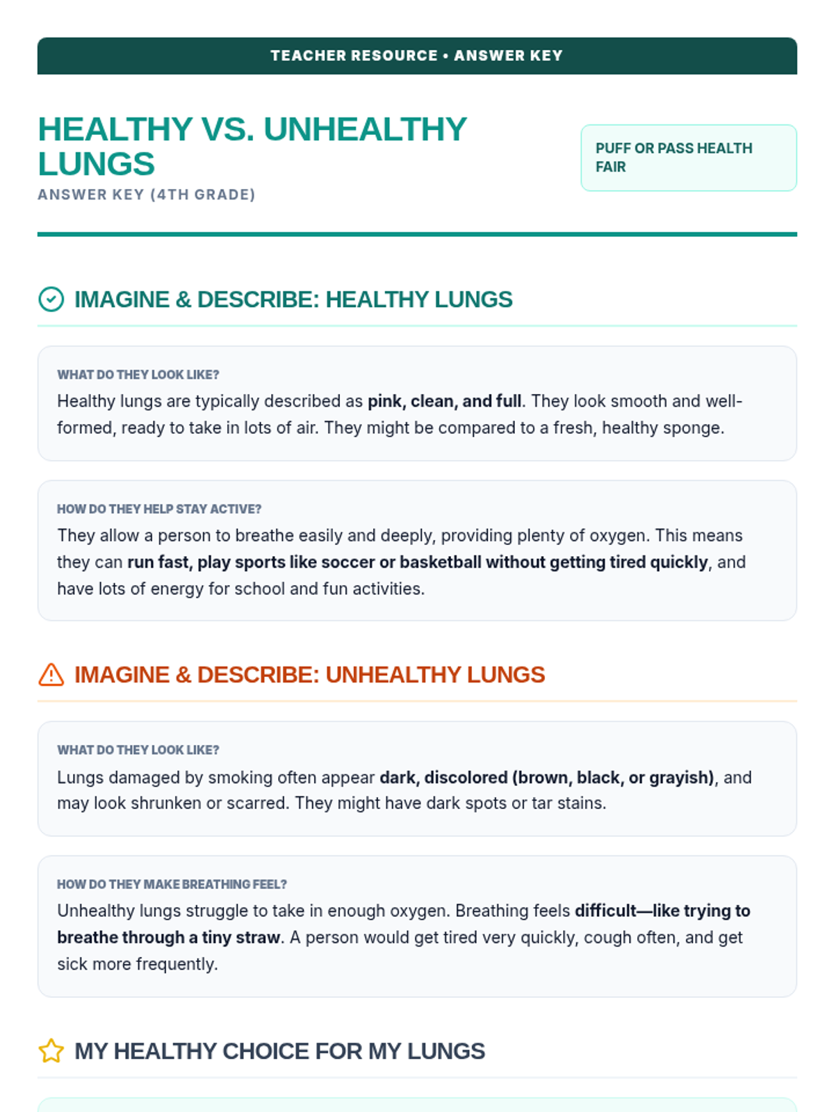 A station-based health fair for 4th graders to explore the effects of smoking, debunk myths, and develop refusal skills through interactive games and activities.