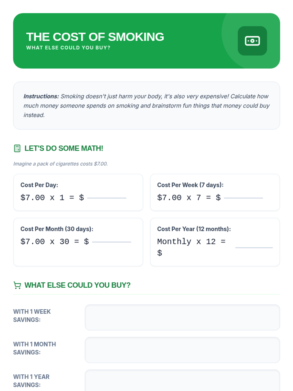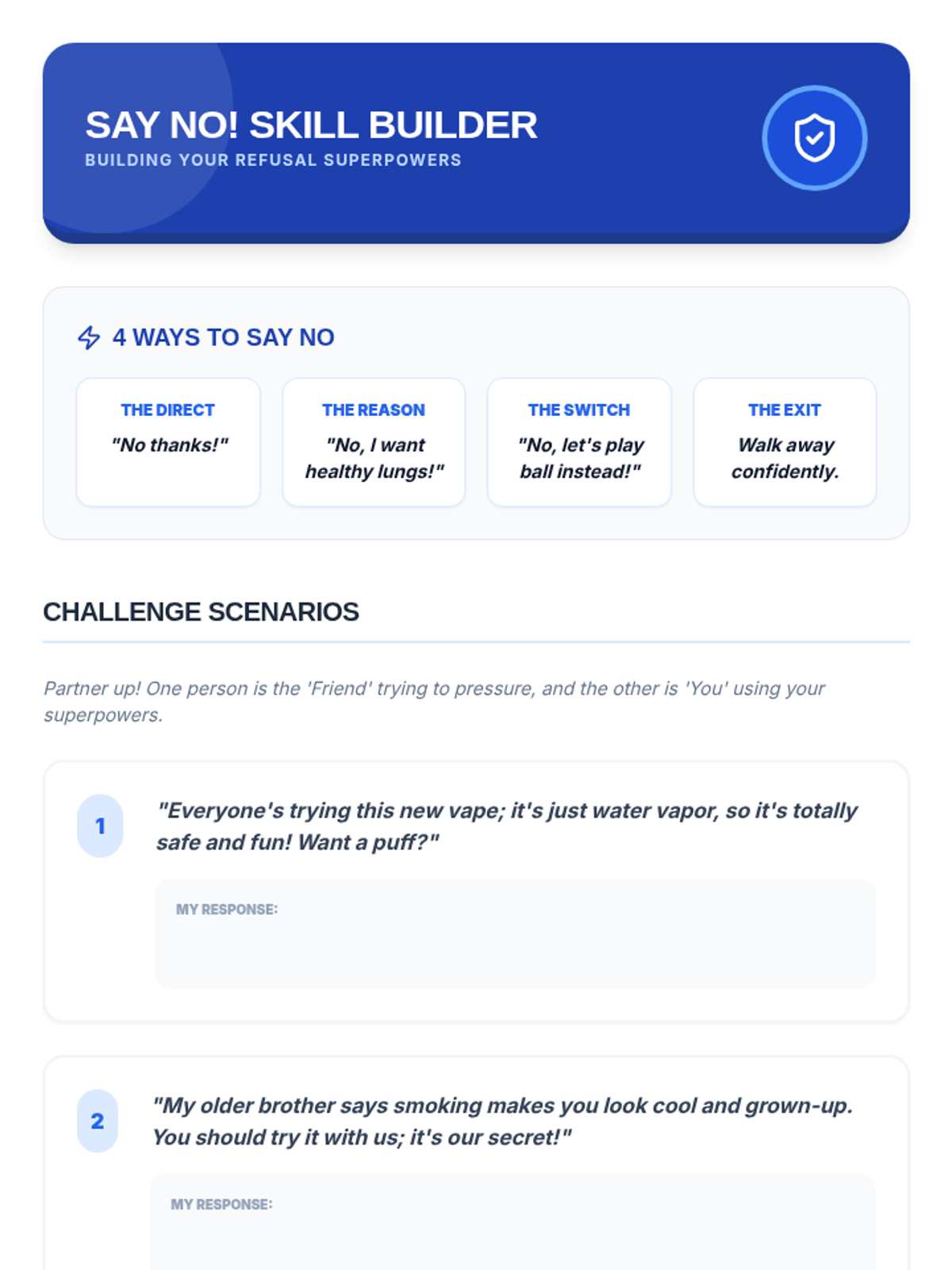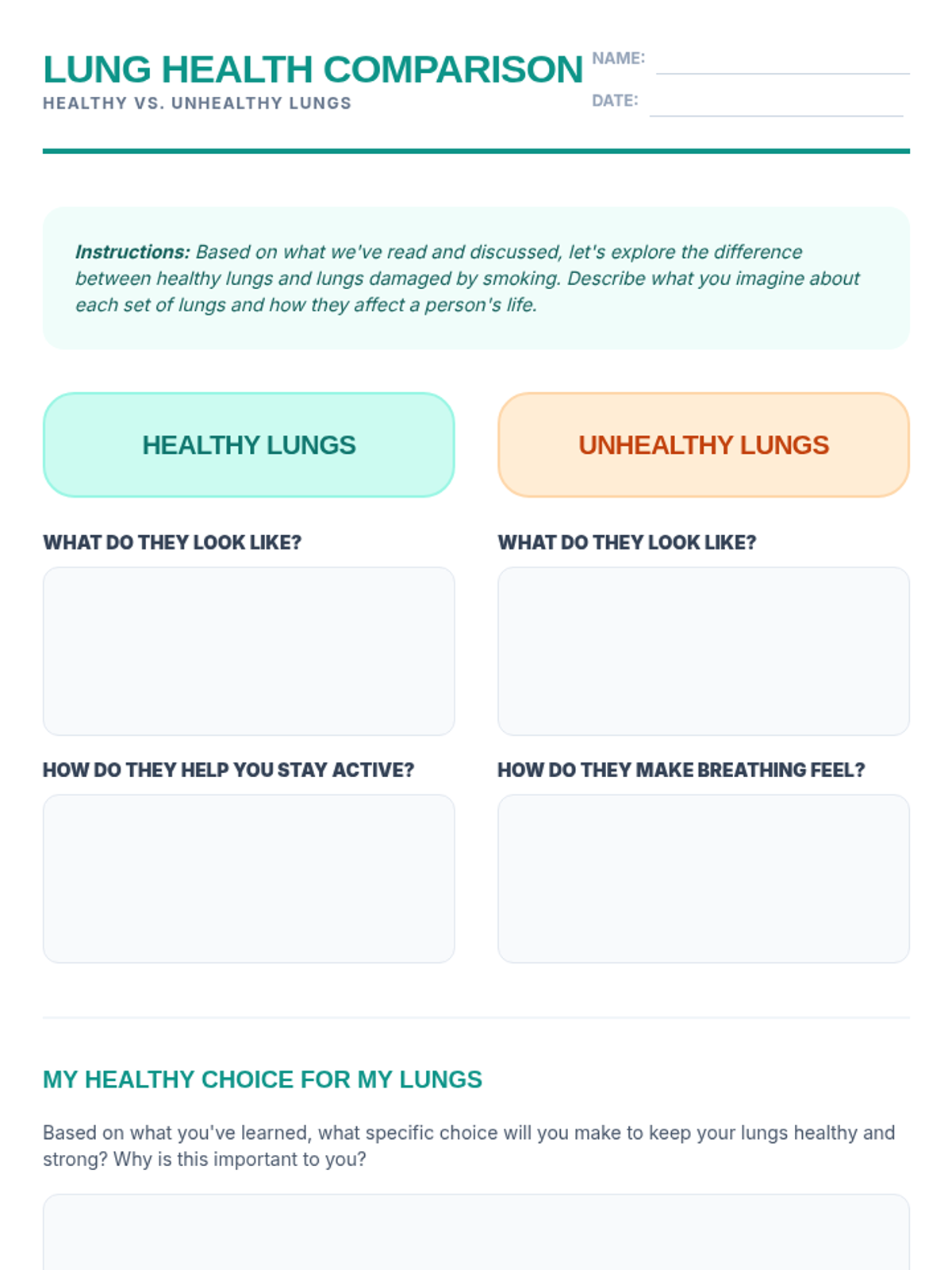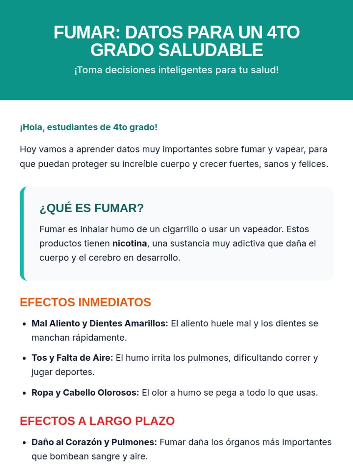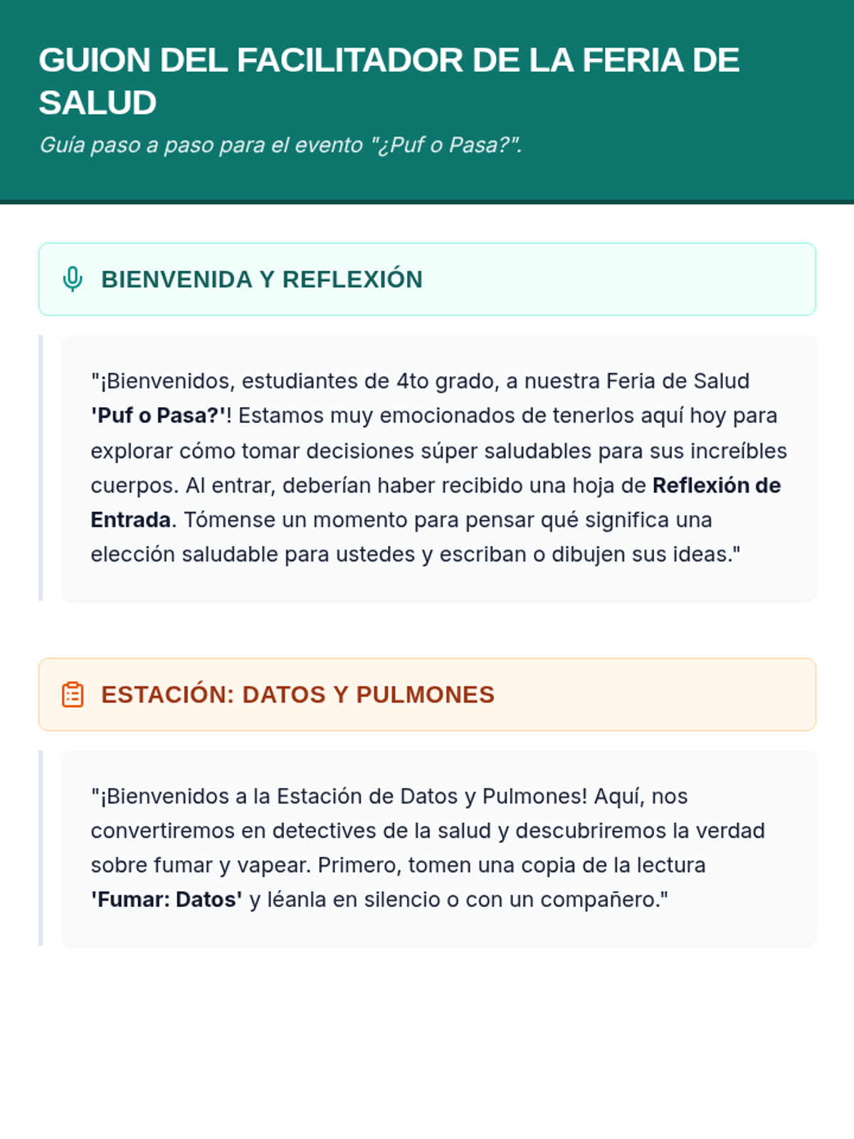 A station-based health fair for 4th graders to explore the effects of smoking, debunk myths, and develop refusal skills through interactive games and activities.