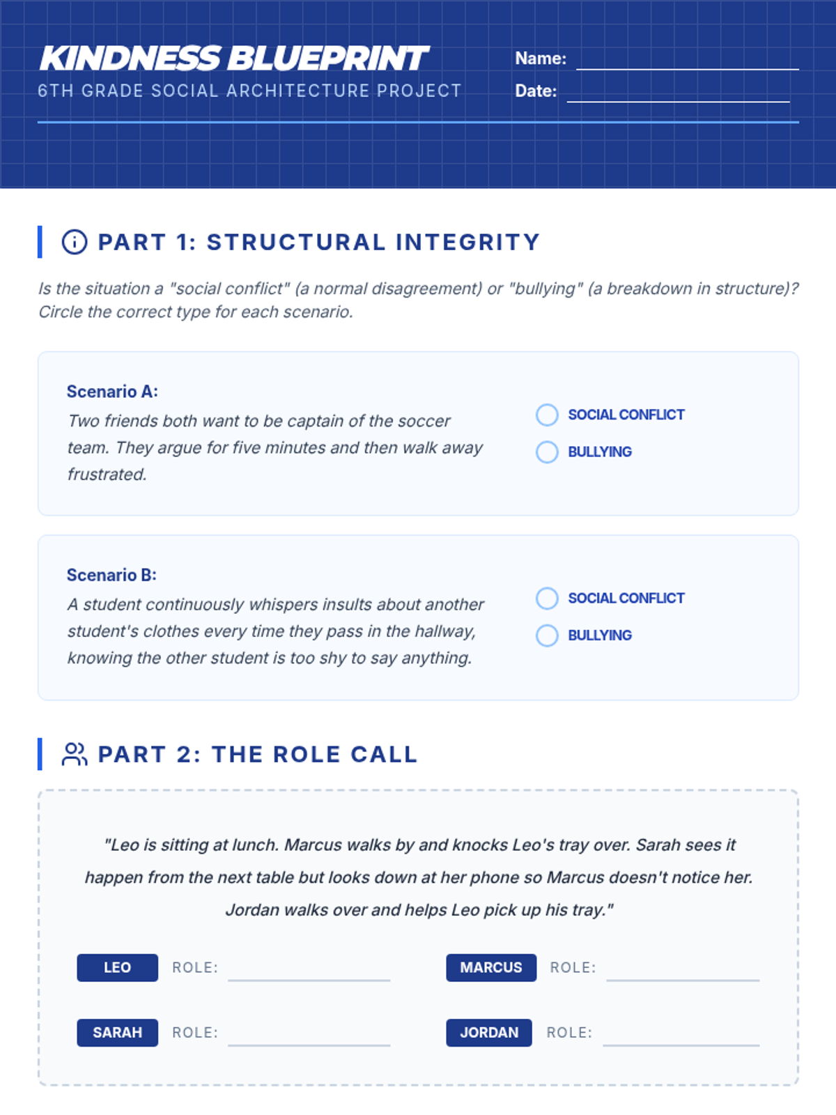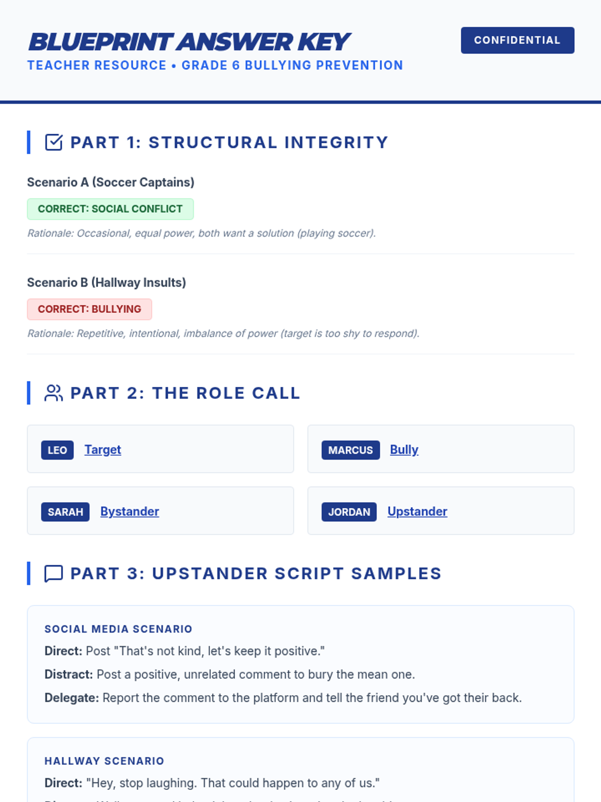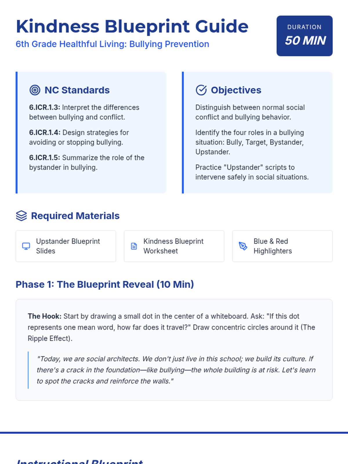 A comprehensive 6th-grade bullying prevention lesson aligned with NC Healthful Living standards, focusing on distinguishing conflict from bullying and empowering upstanders.