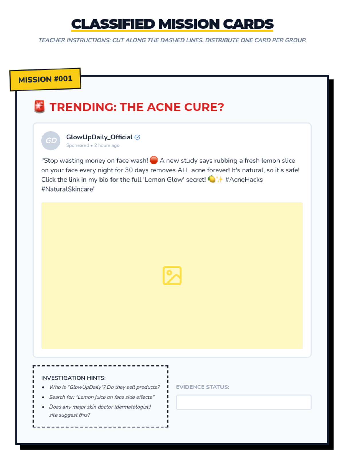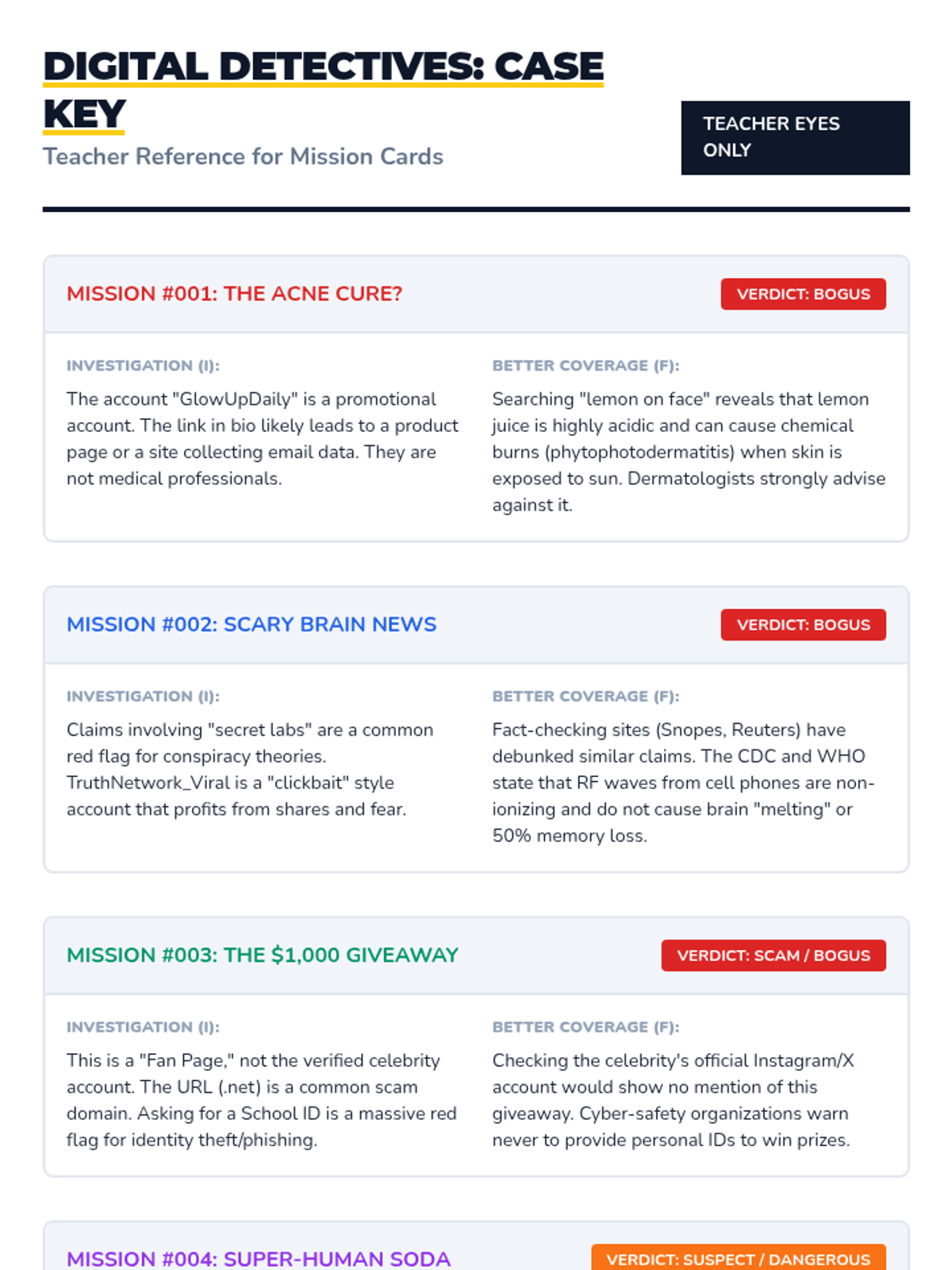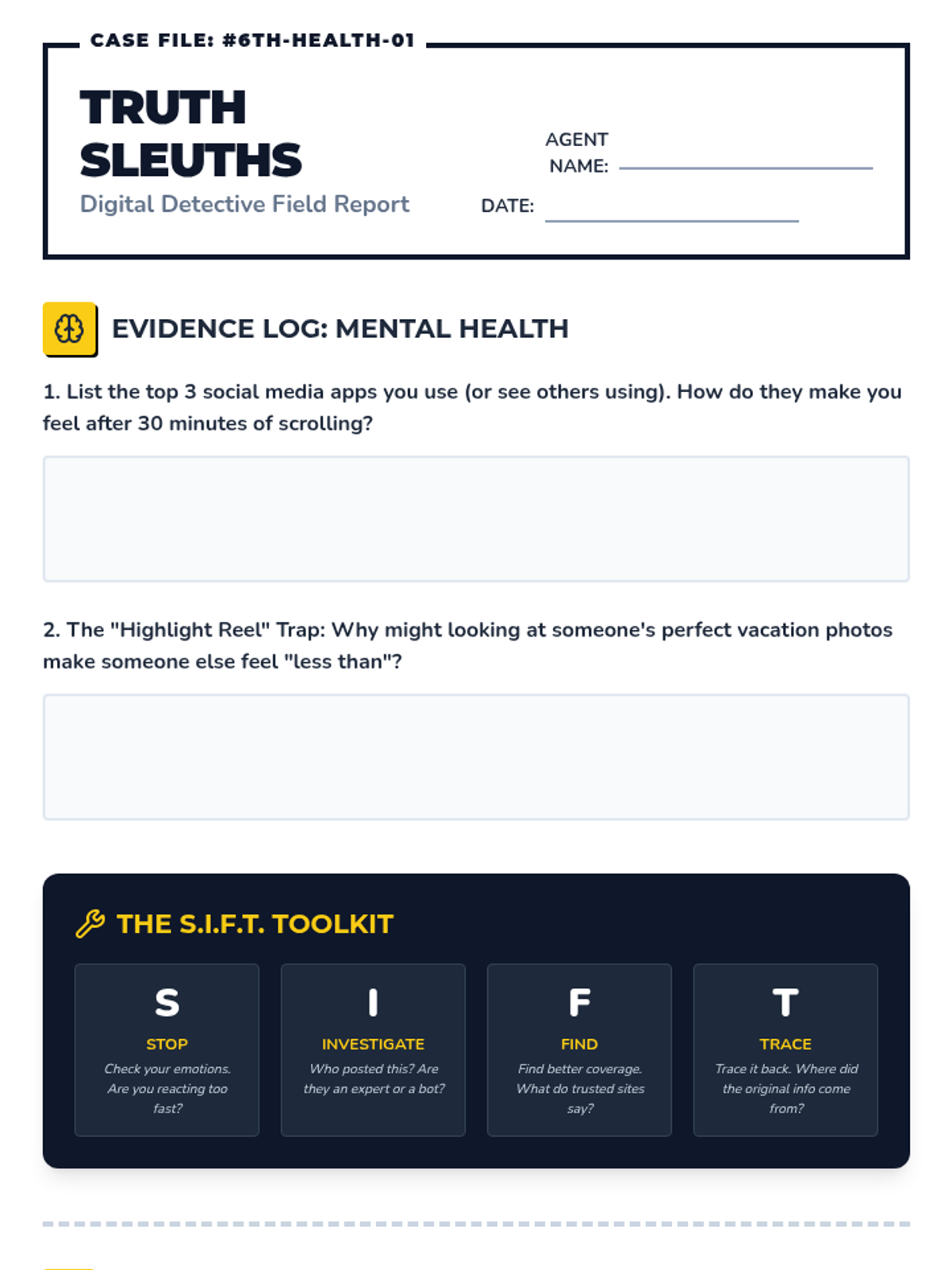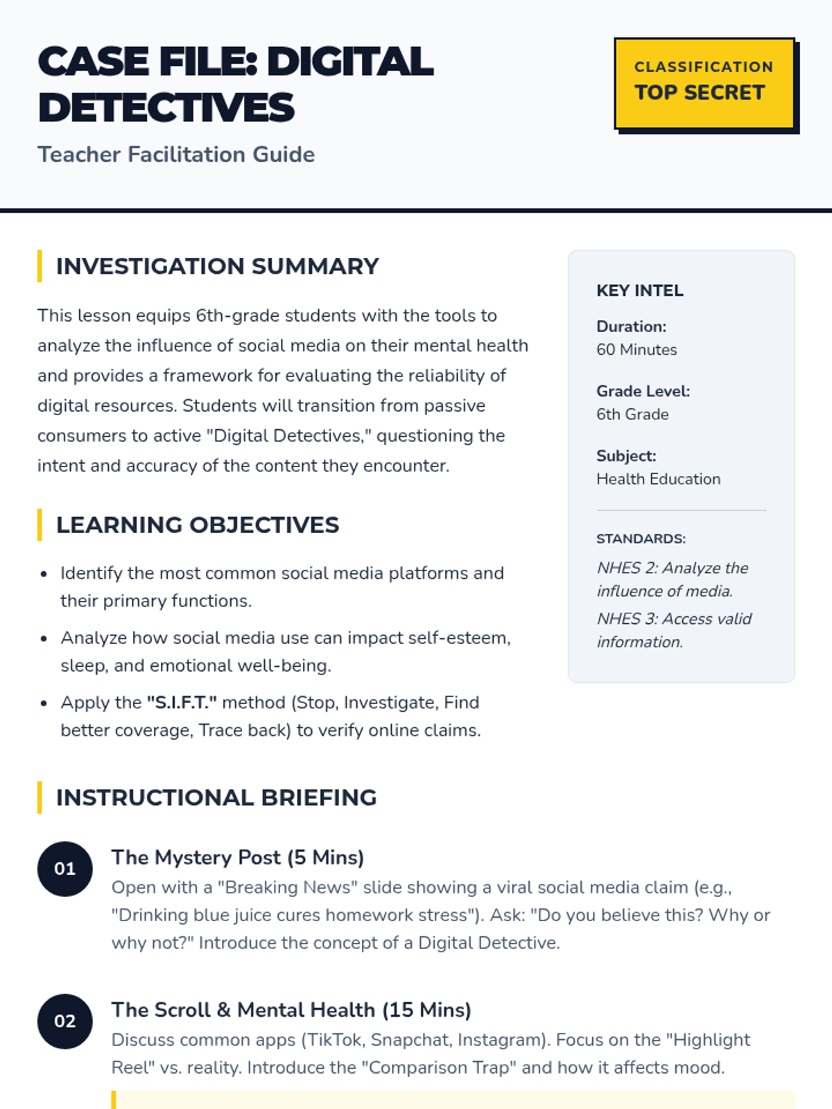 A 6th-grade health lesson that empowers students to navigate social media safely by analyzing mental health impacts and developing skills to verify online information. Students act as 'Digital Detectives' to uncover the truth behind the scroll.
