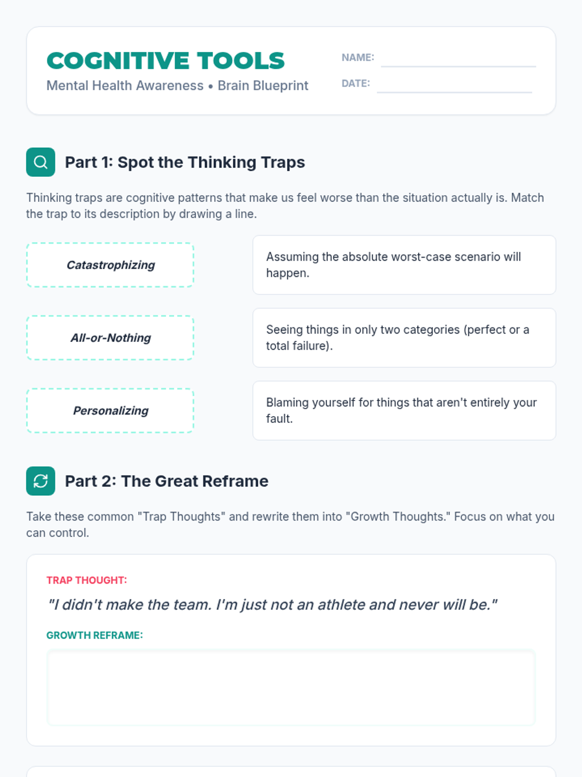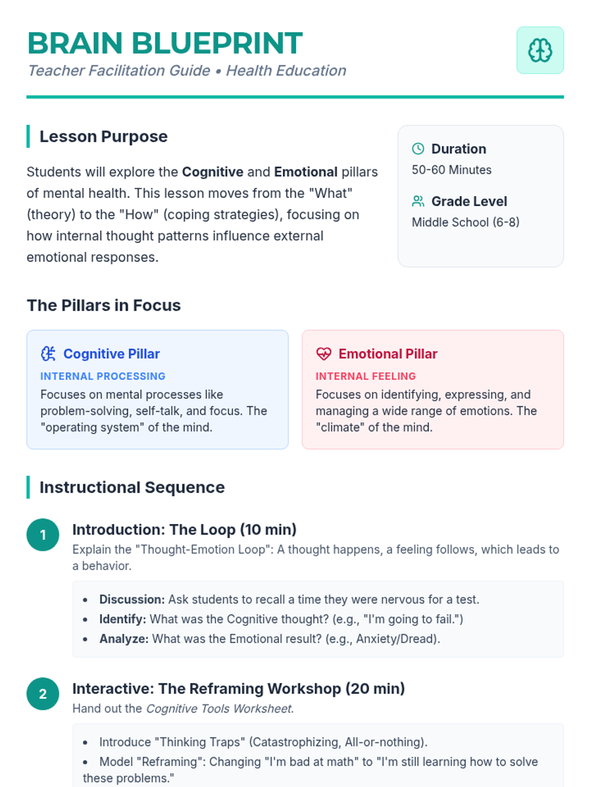A health-focused exploration of the Cognitive and Emotional pillars, teaching students how to identify thought patterns and manage emotions.
