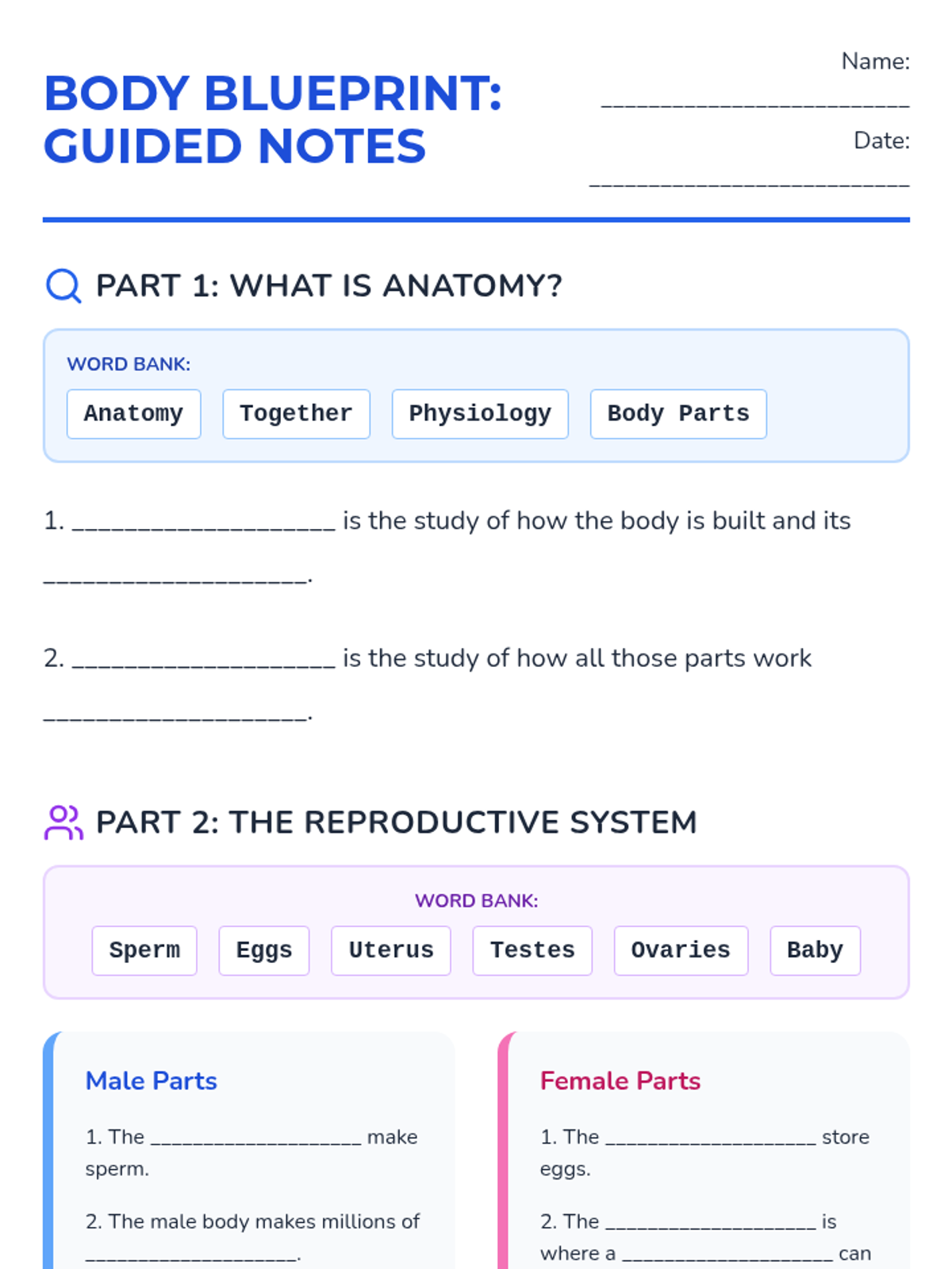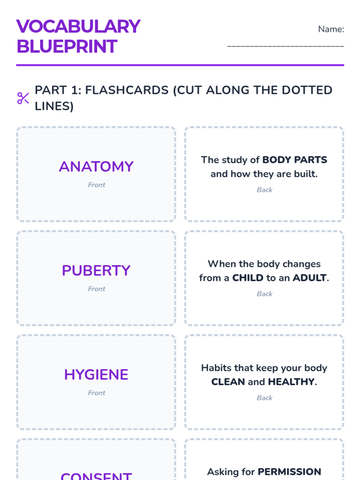 A simplified, visually-heavy curriculum on sexual health adapted for 6th-grade resource room students. Covers anatomy, puberty, relationships, and state laws using guided notes, scaffolded projects, and visual supports.
