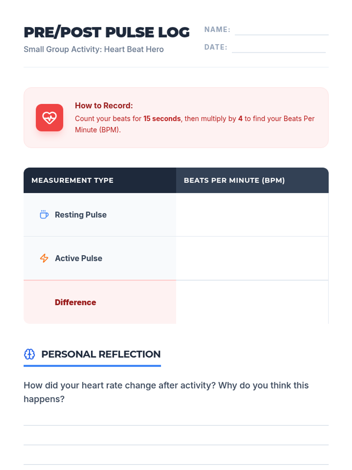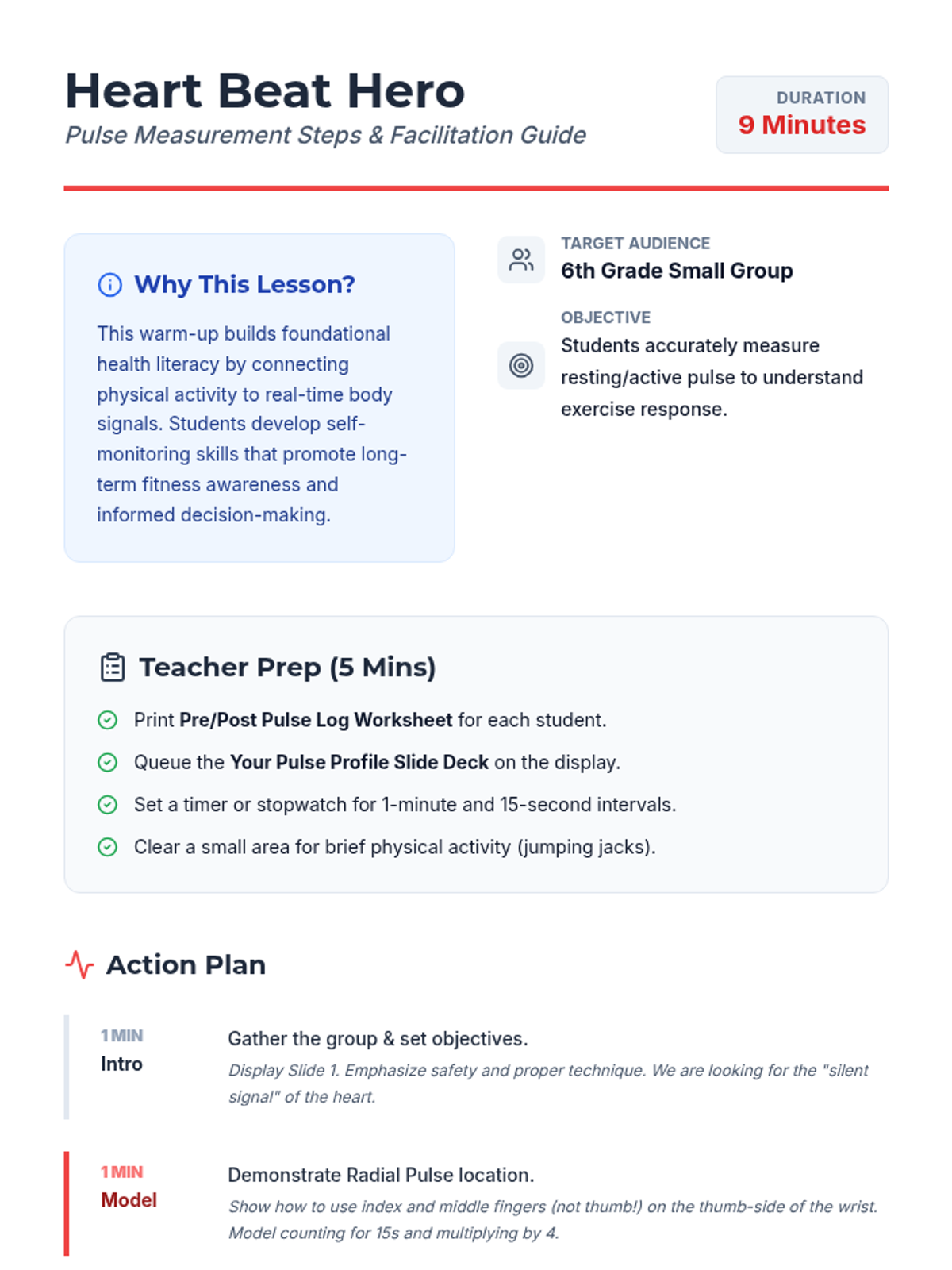 A 9-minute small-group warm-up for 6th graders focused on measuring and interpreting resting and active pulse to understand the body's response to physical activity.