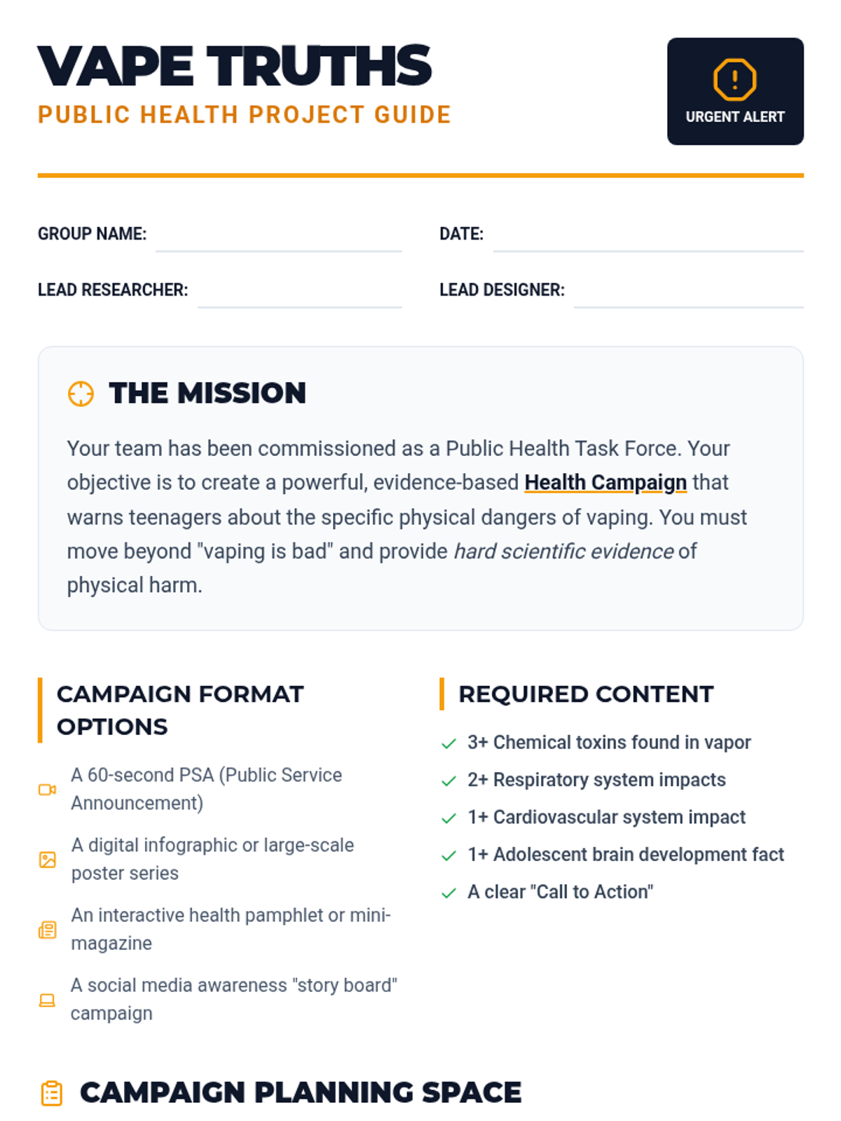 This lesson investigates the specific physical health consequences of vaping on the human body. Students collaborate to research respiratory, cardiovascular, and neurological impacts, culminating in a group-led public health awareness campaign.