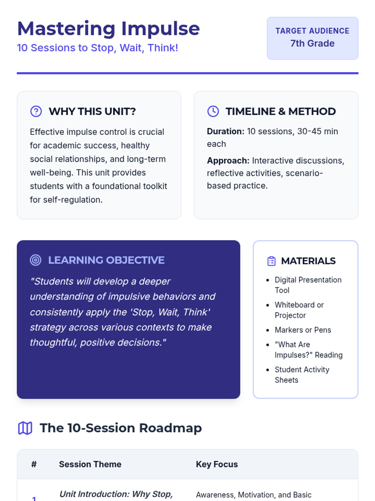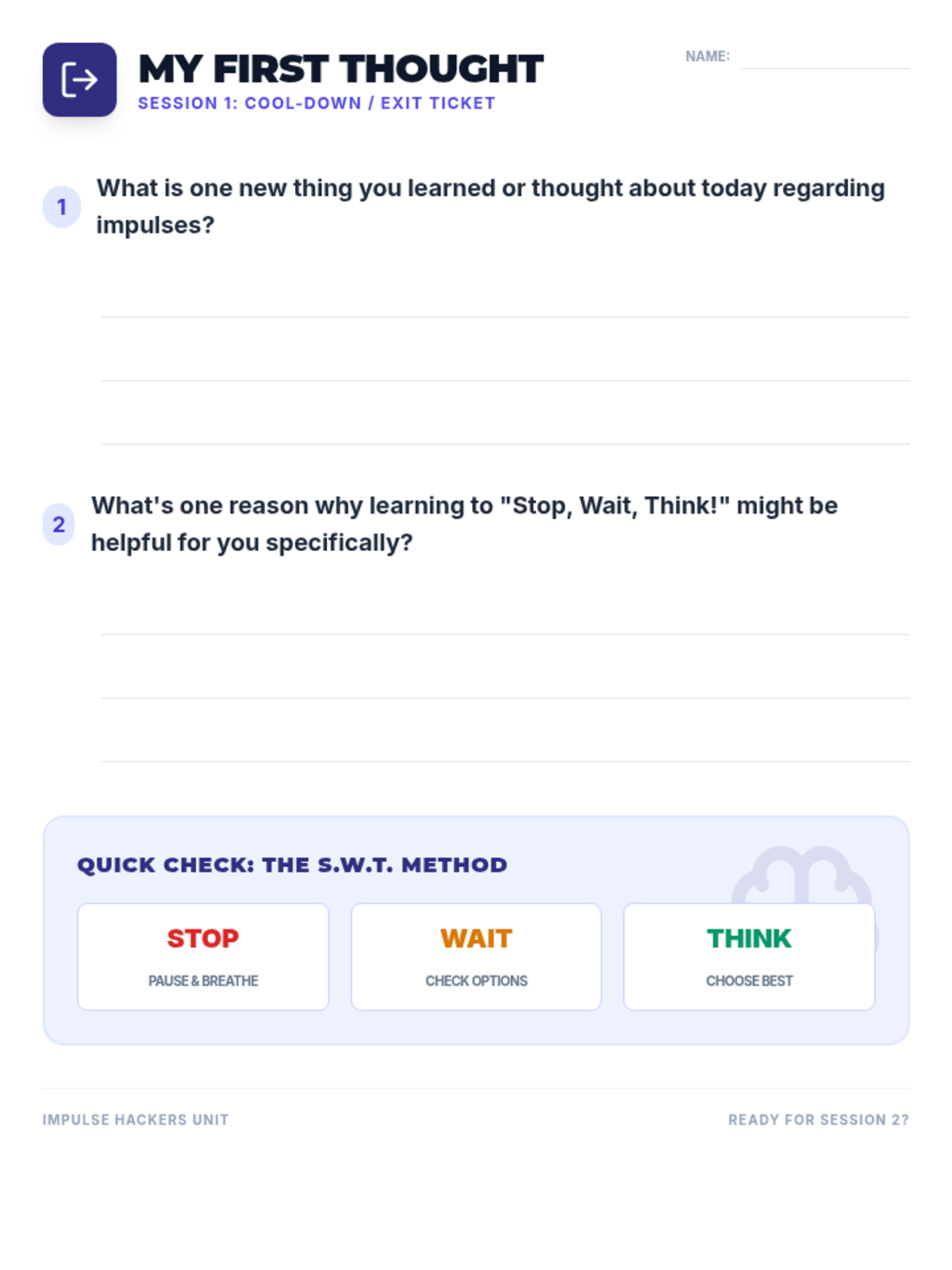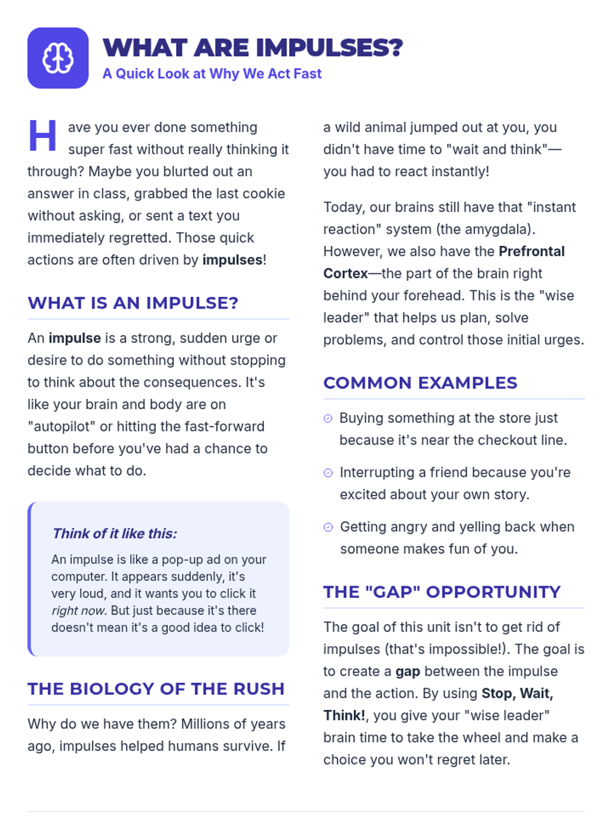 Introduction to impulses, their impact on life, and the foundational 'Stop, Wait, Think!' strategy.