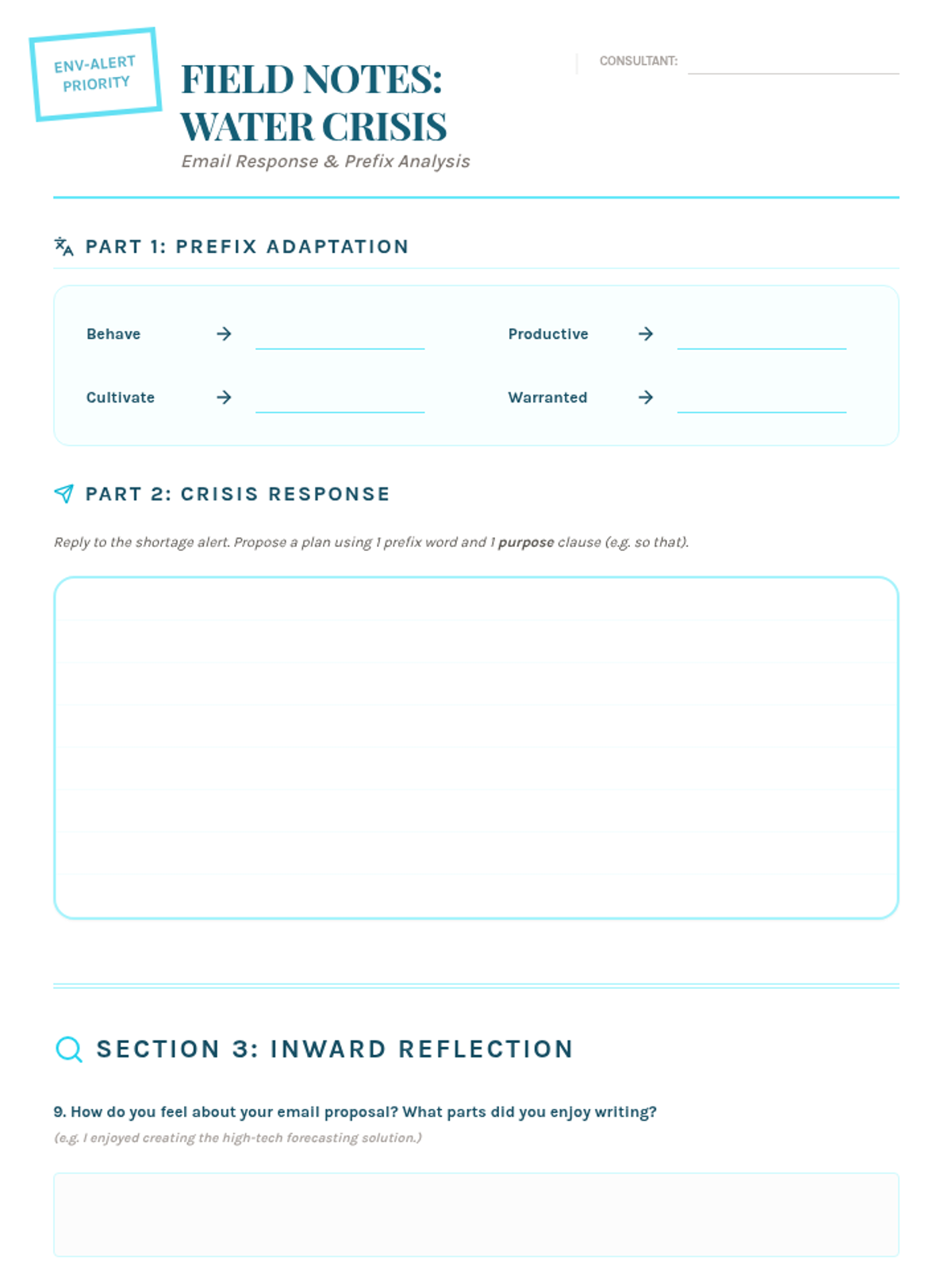 A focus on water scarcity and ecological preservation. Students analyze a reading about water shortages, master prefixes, and draft a formal email response to propose environmental solutions.