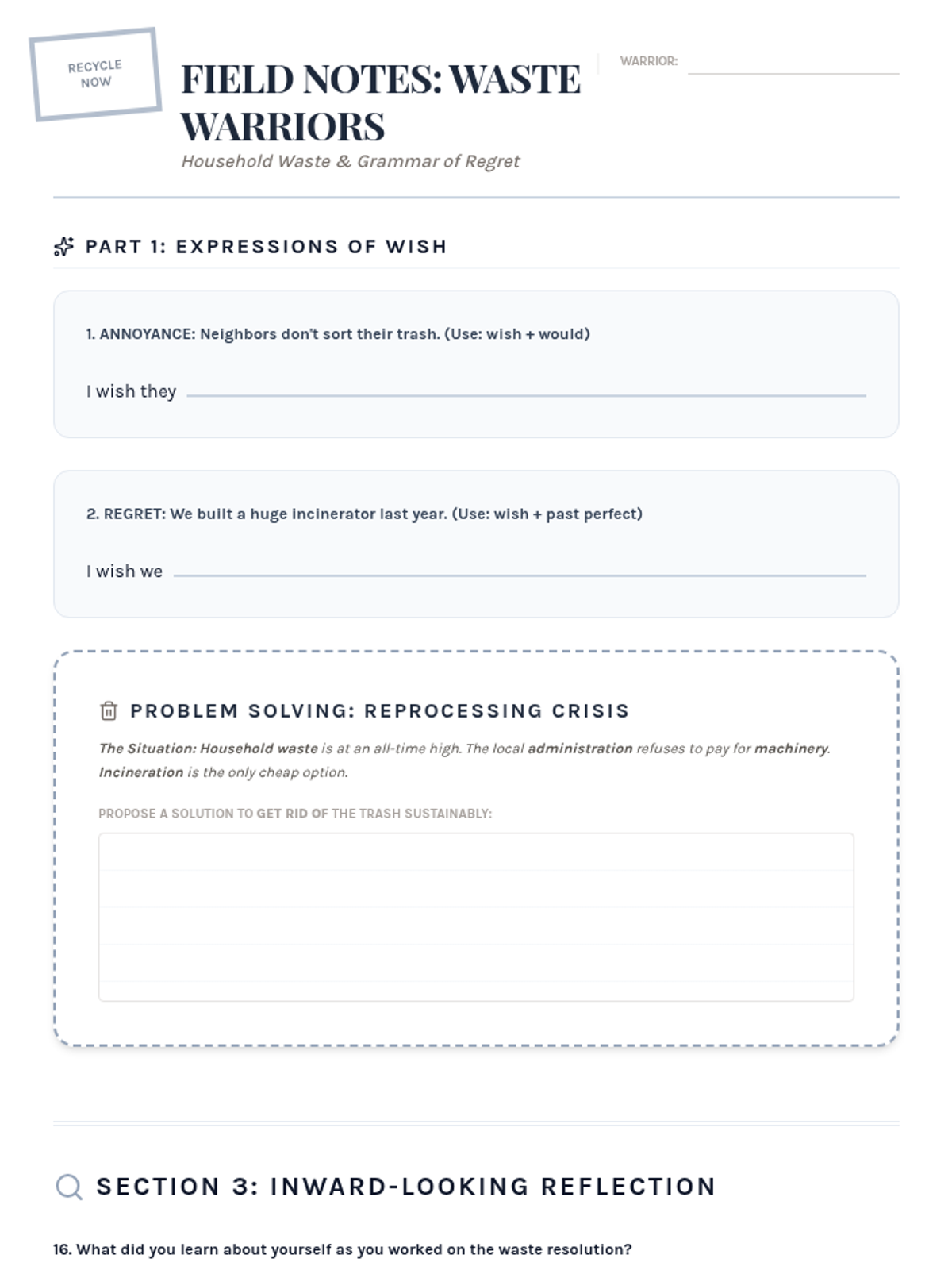 A deep dive into waste management and the psychology of recycling. Students master phrasal verbs and use the grammar of 'wish' to express criticism and regret about resource mismanagement.