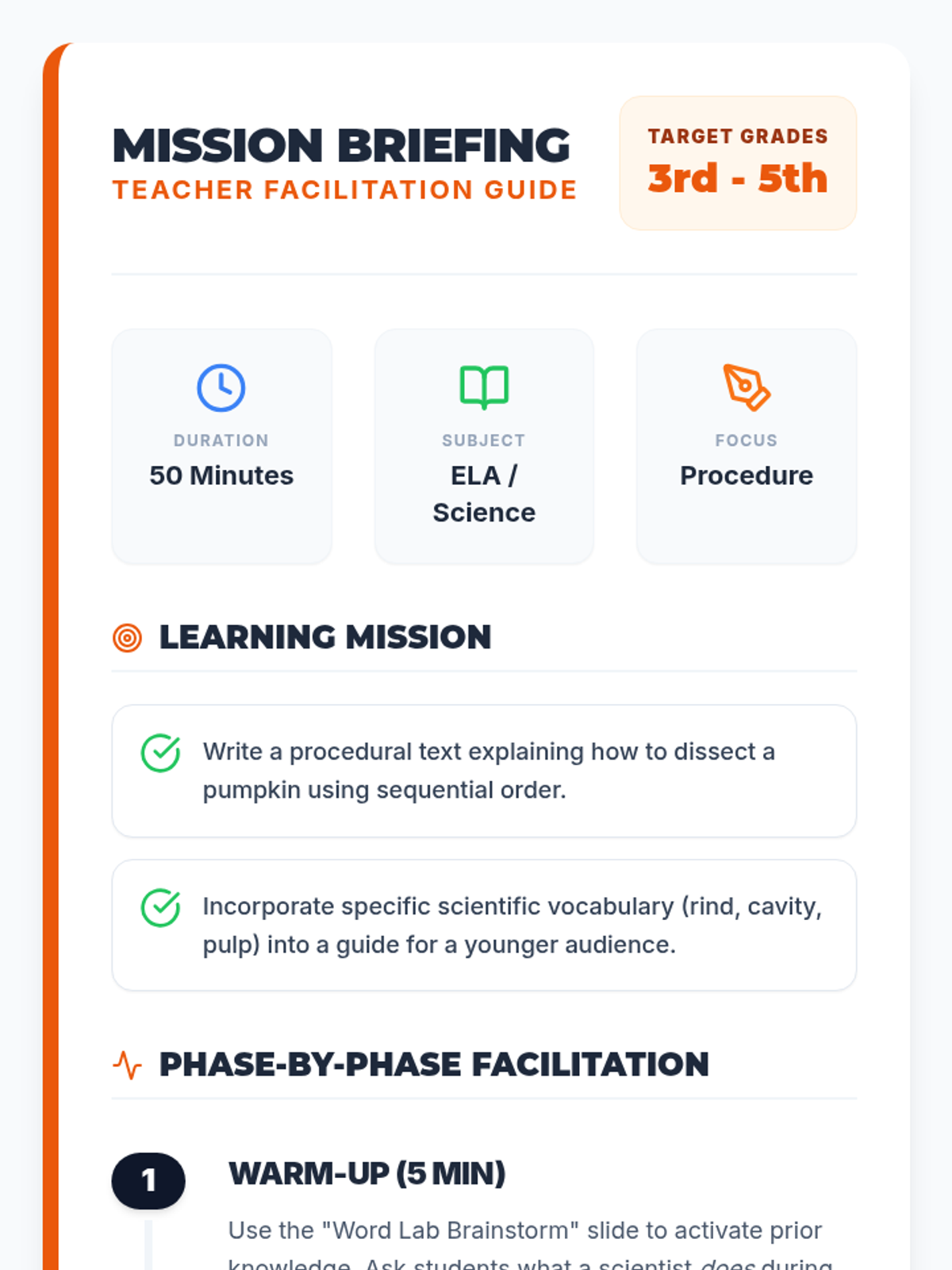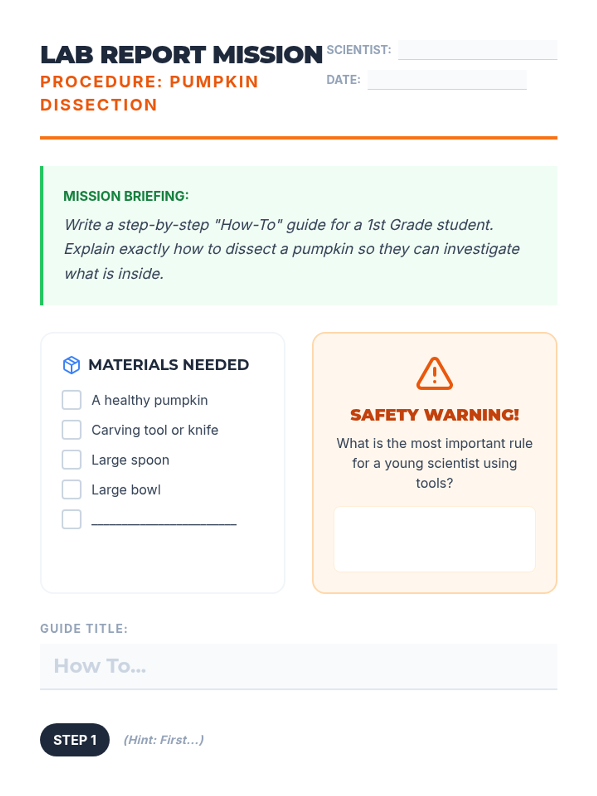A hands-on science and writing lesson where students watch a pumpkin dissection and then write a procedural 'how-to' guide for younger students, focusing on scientific vocabulary and safety.