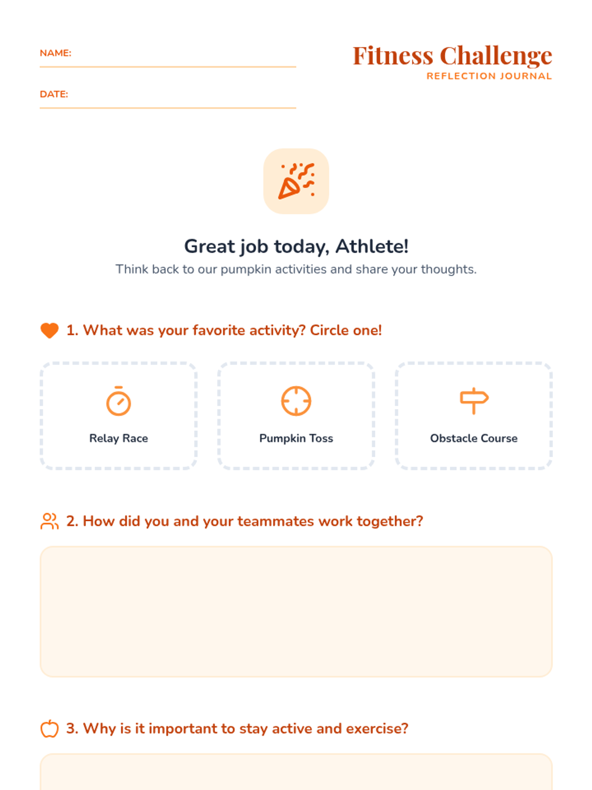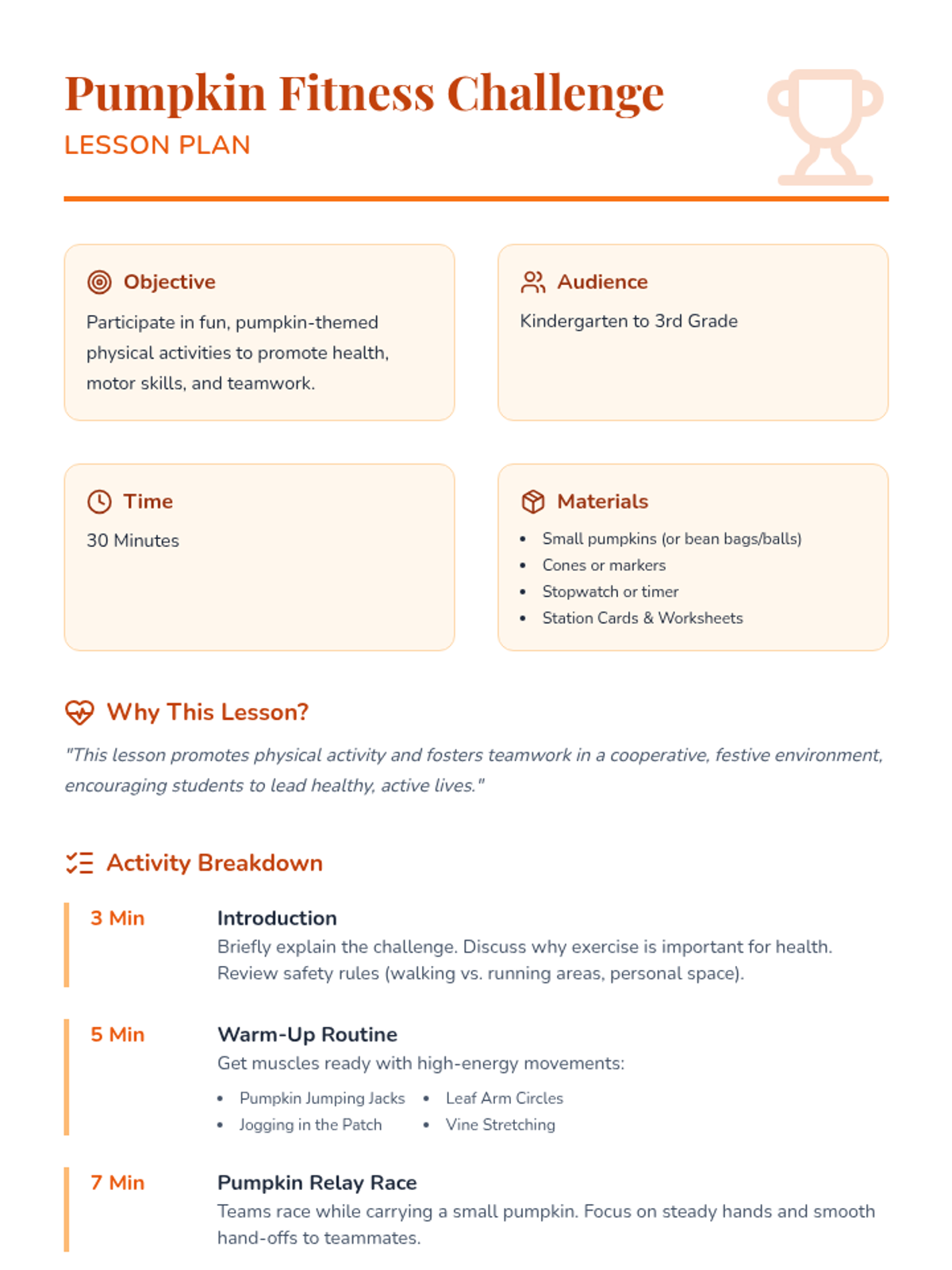 A high-energy, autumn-themed PE lesson where students engage in pumpkin-inspired fitness challenges to build motor skills and teamwork.
