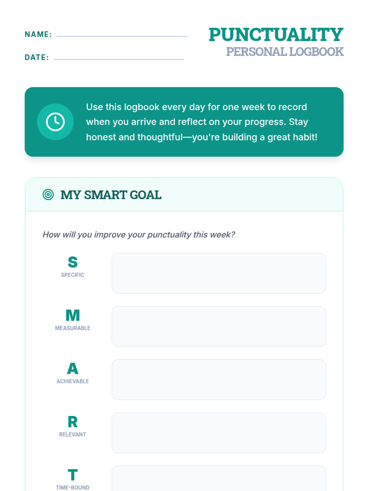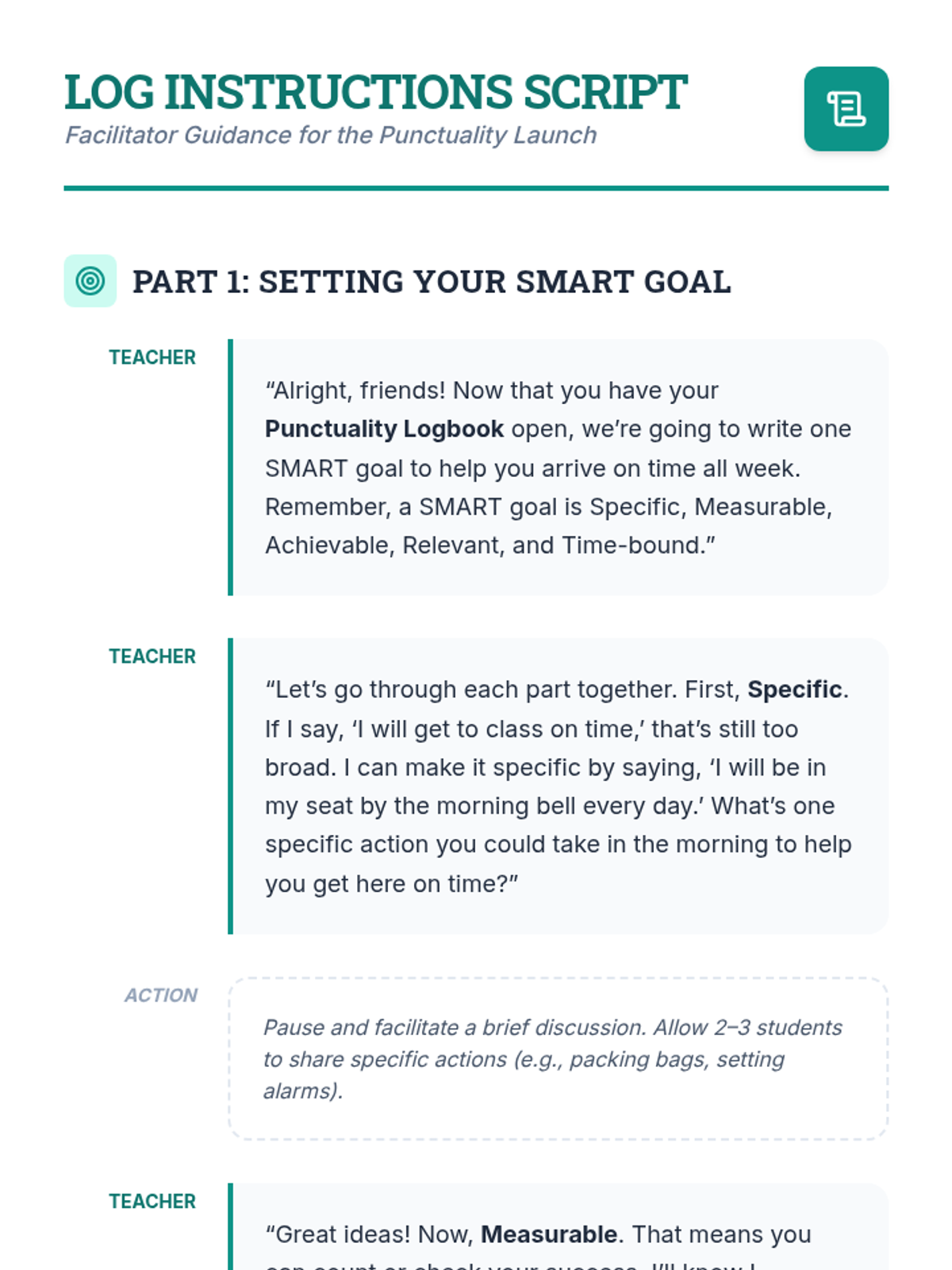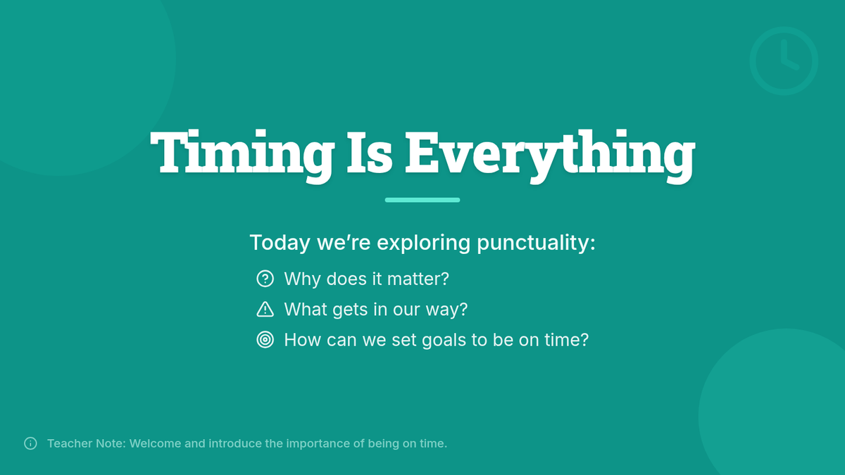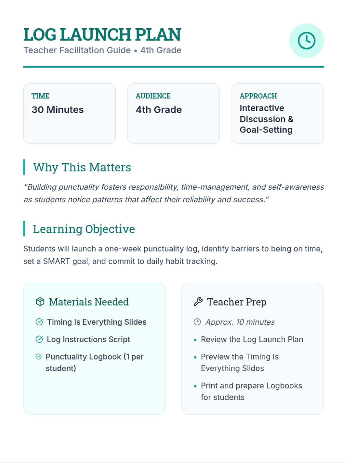 A 30-minute 4th-grade lesson where students launch a one-week punctuality log, identify barriers to being on time, and set personal SMART goals to build responsibility.