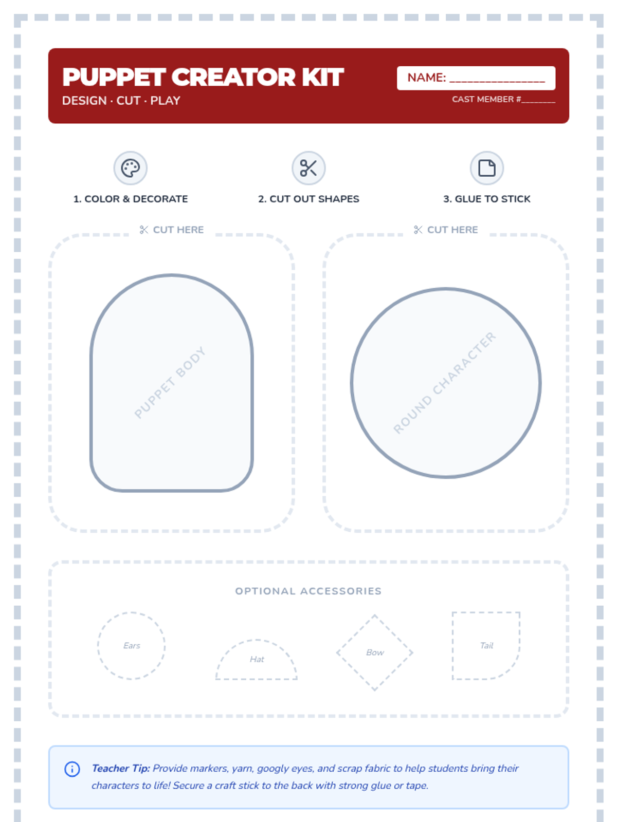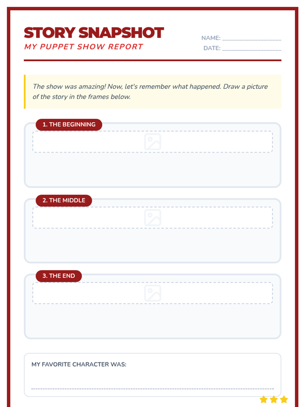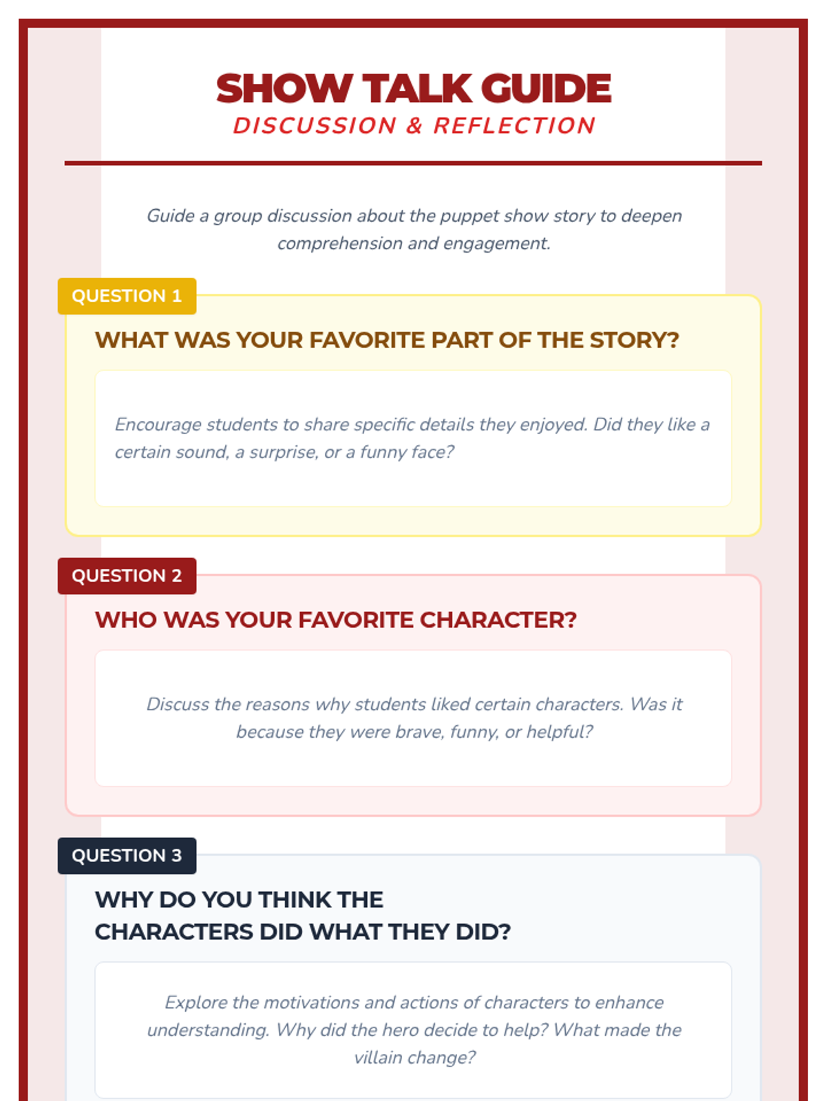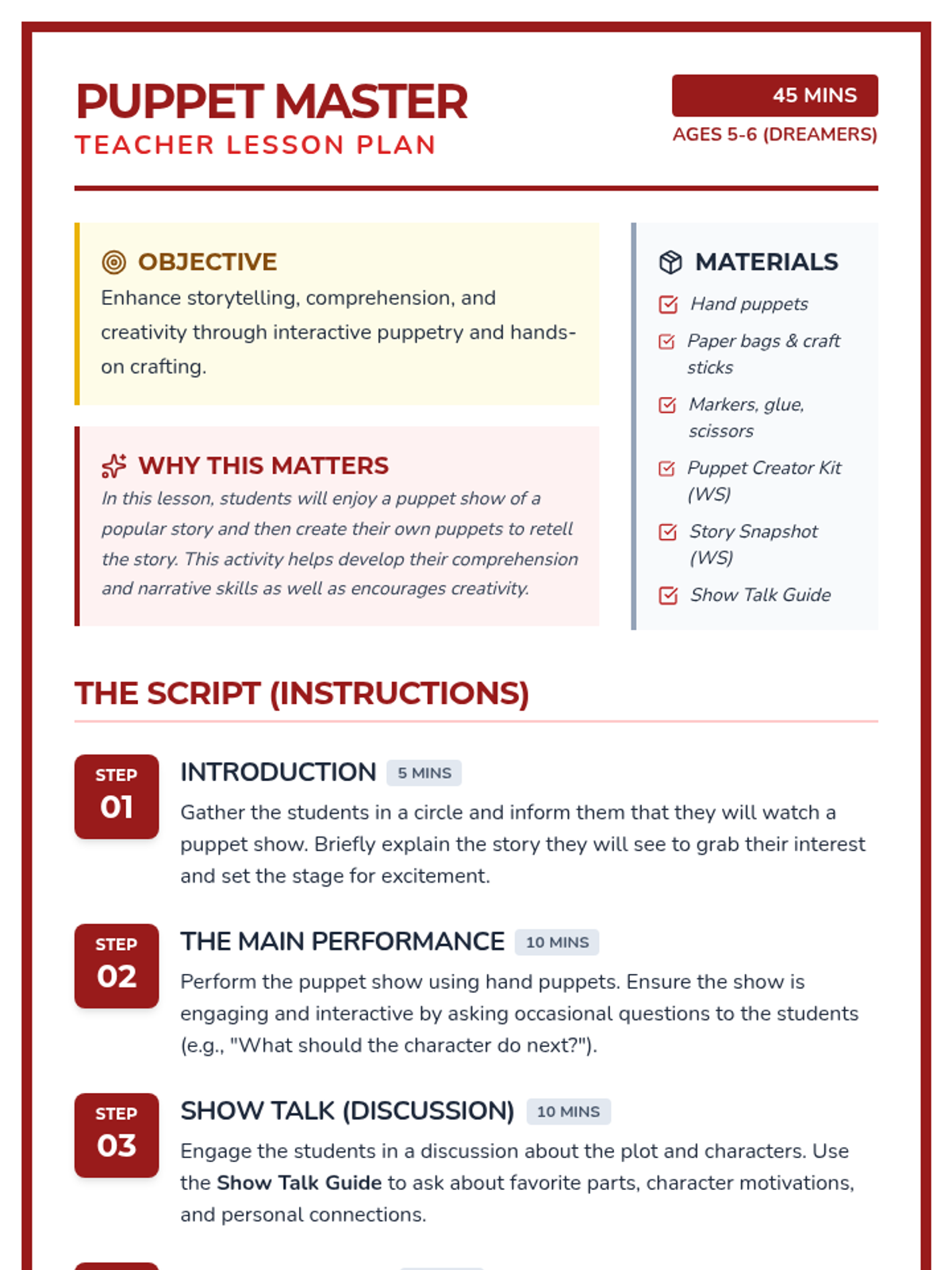 Students watch a puppet show and then create their own puppets to retell the story, enhancing comprehension and narrative skills.