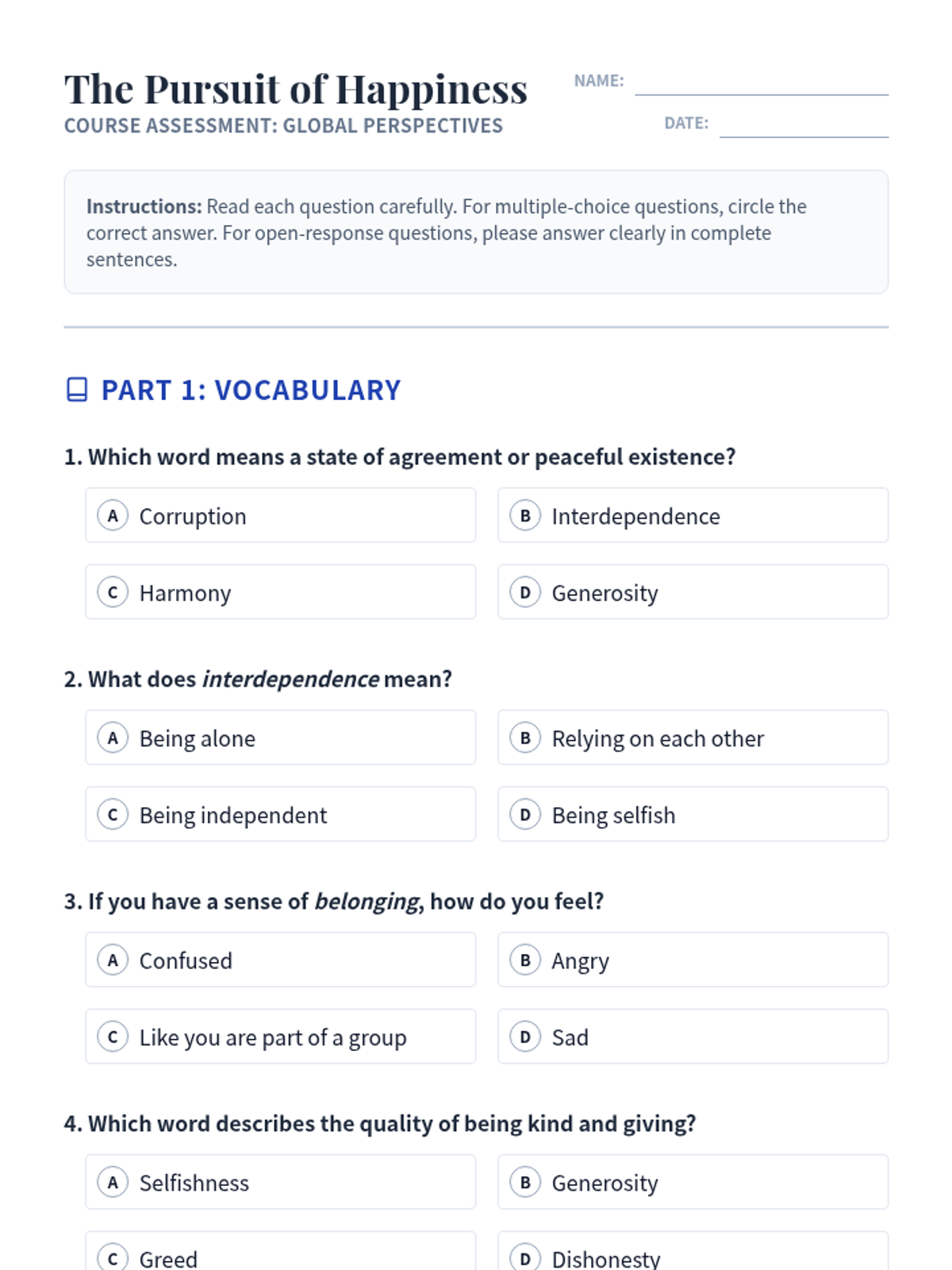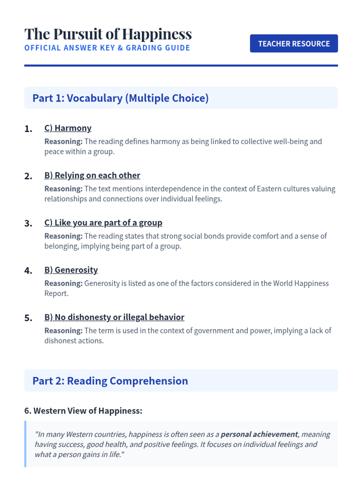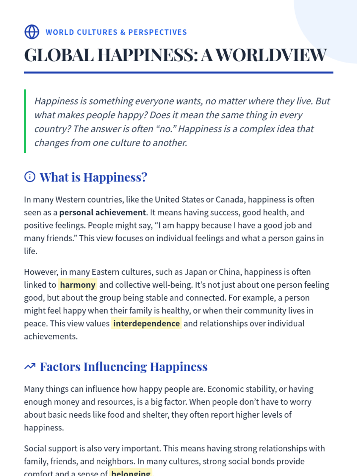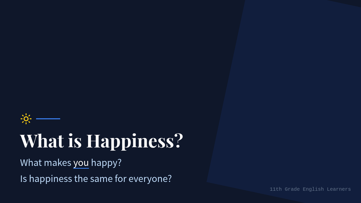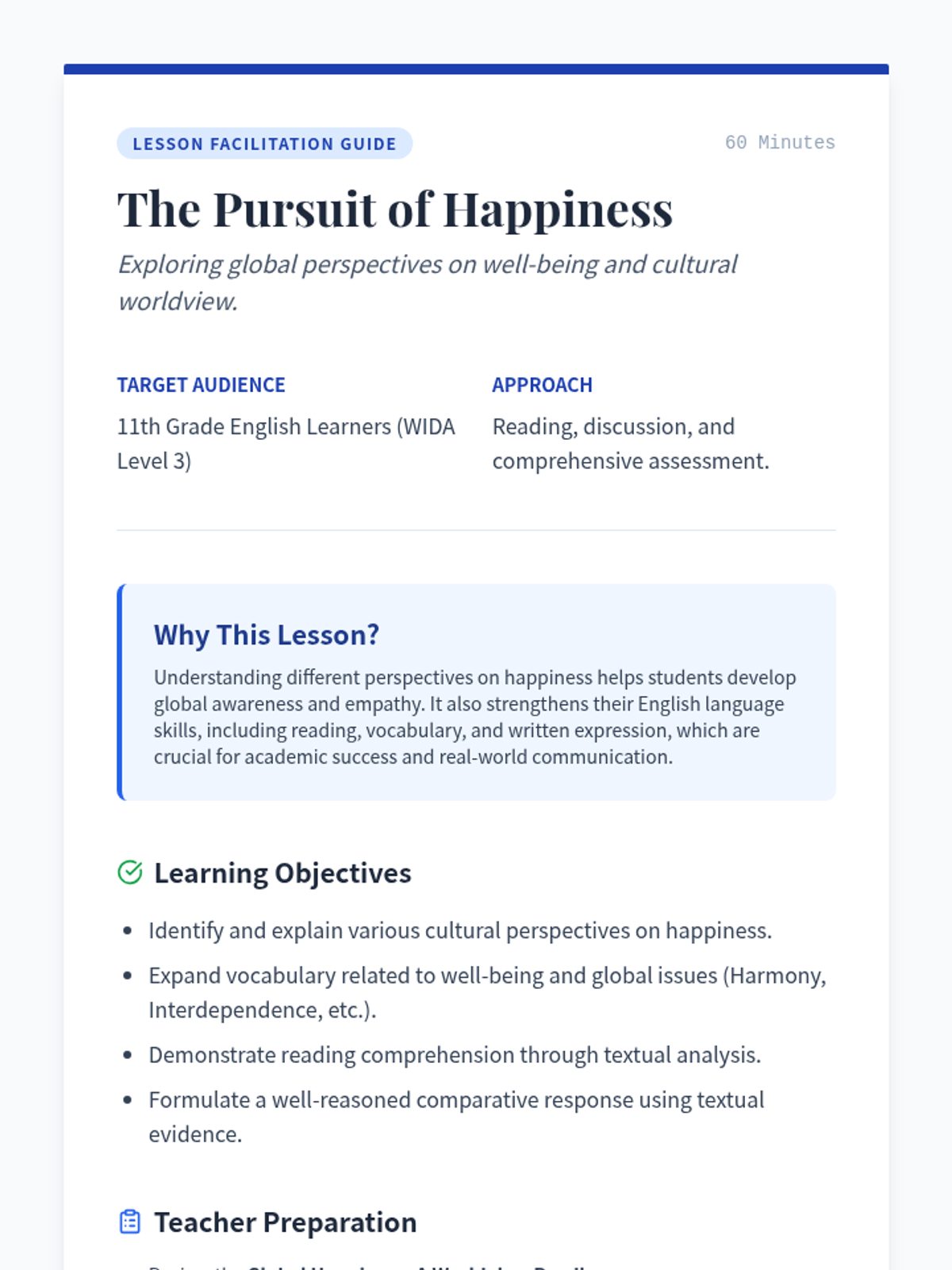 This 60-minute lesson for 11th-grade English Learners (WIDA Level 3) explores global perspectives on happiness, focusing on Western individual achievement versus Eastern collective harmony. Students will enhance their vocabulary, reading comprehension, and analytical writing through a cultural worldview lens.
