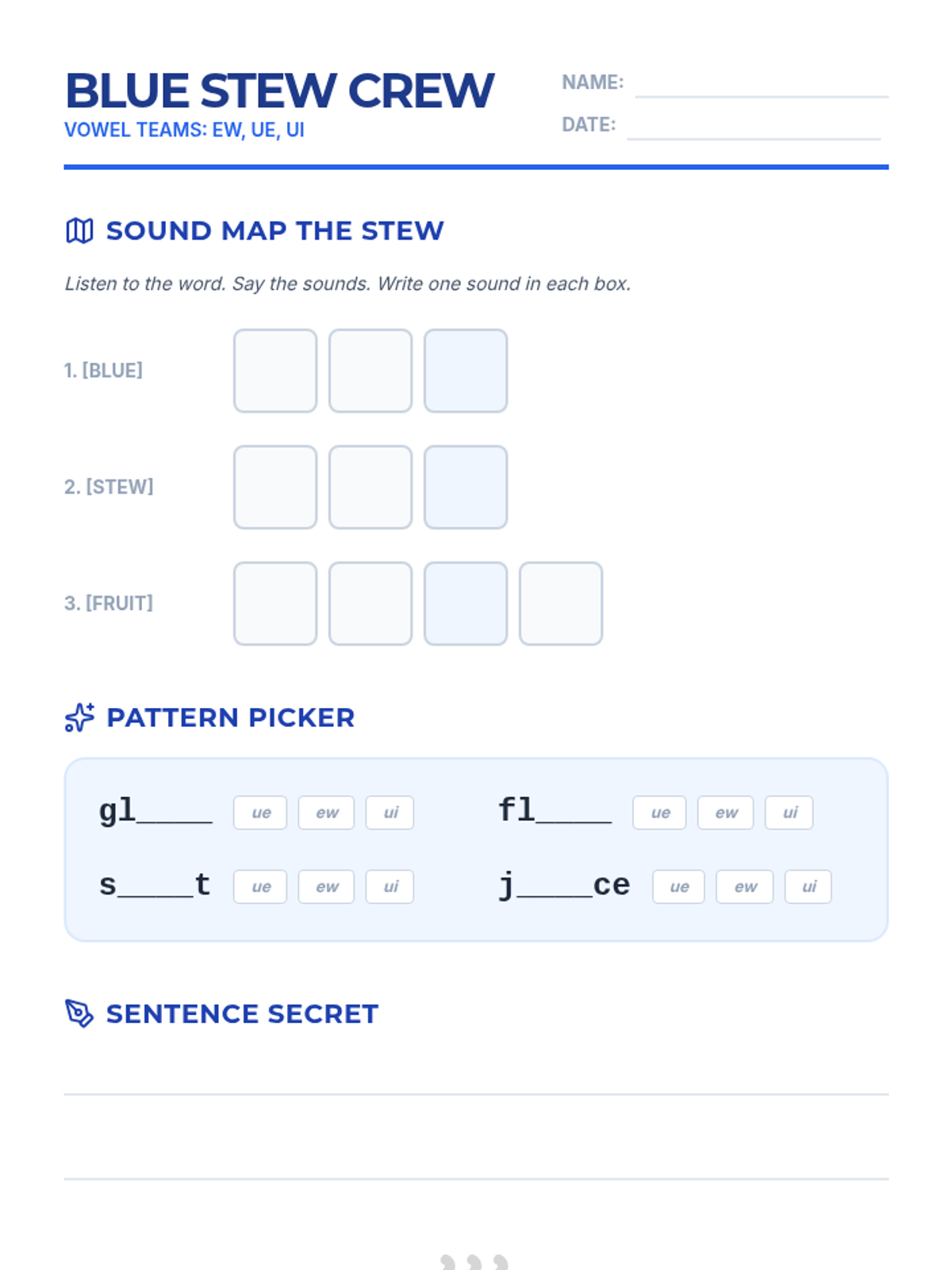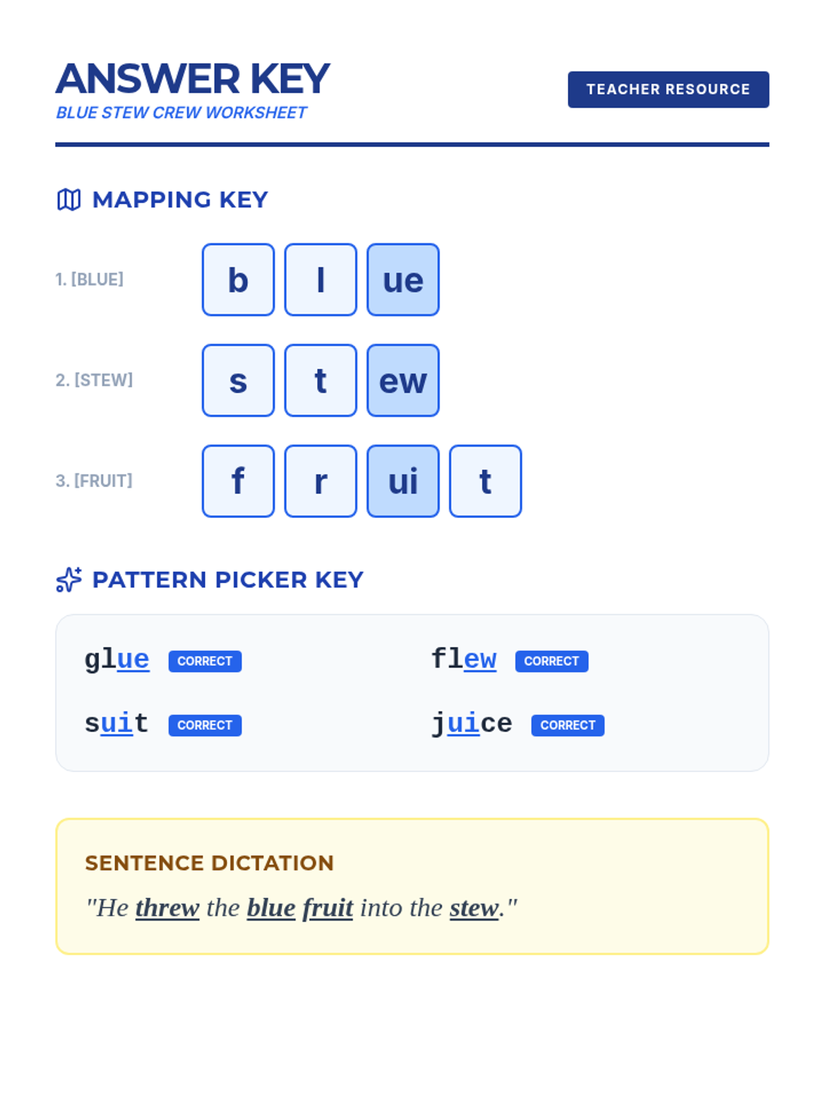 A high-impact, 10-minute small group lesson focusing on the vowel teams ew, ue, and ui, following Science of Reading principles including explicit instruction and orthographic mapping.