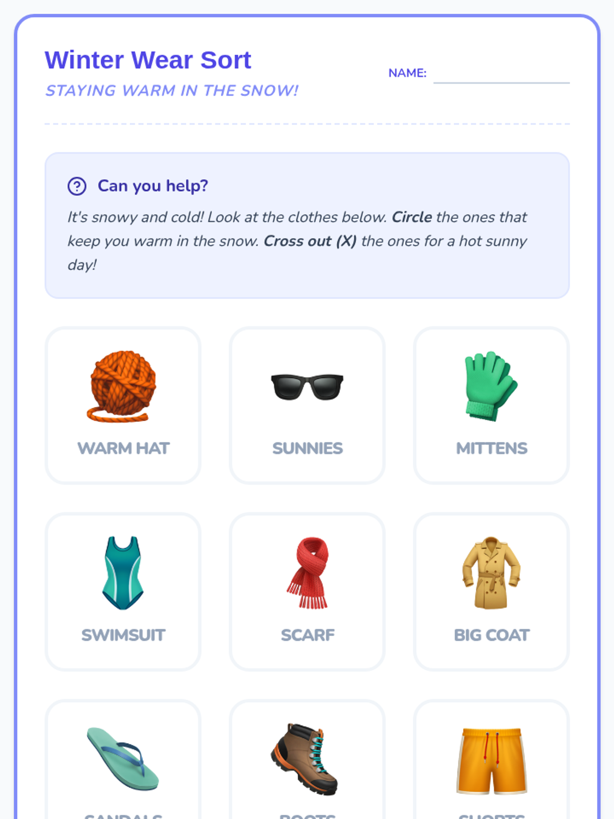 A hands-on lesson for Pre-K and Kindergarten students to learn the science of staying warm and the practical skill of dressing in winter layers. Features a science video, a high-energy relay race, and a mnemonic rhyme for dressing independently.